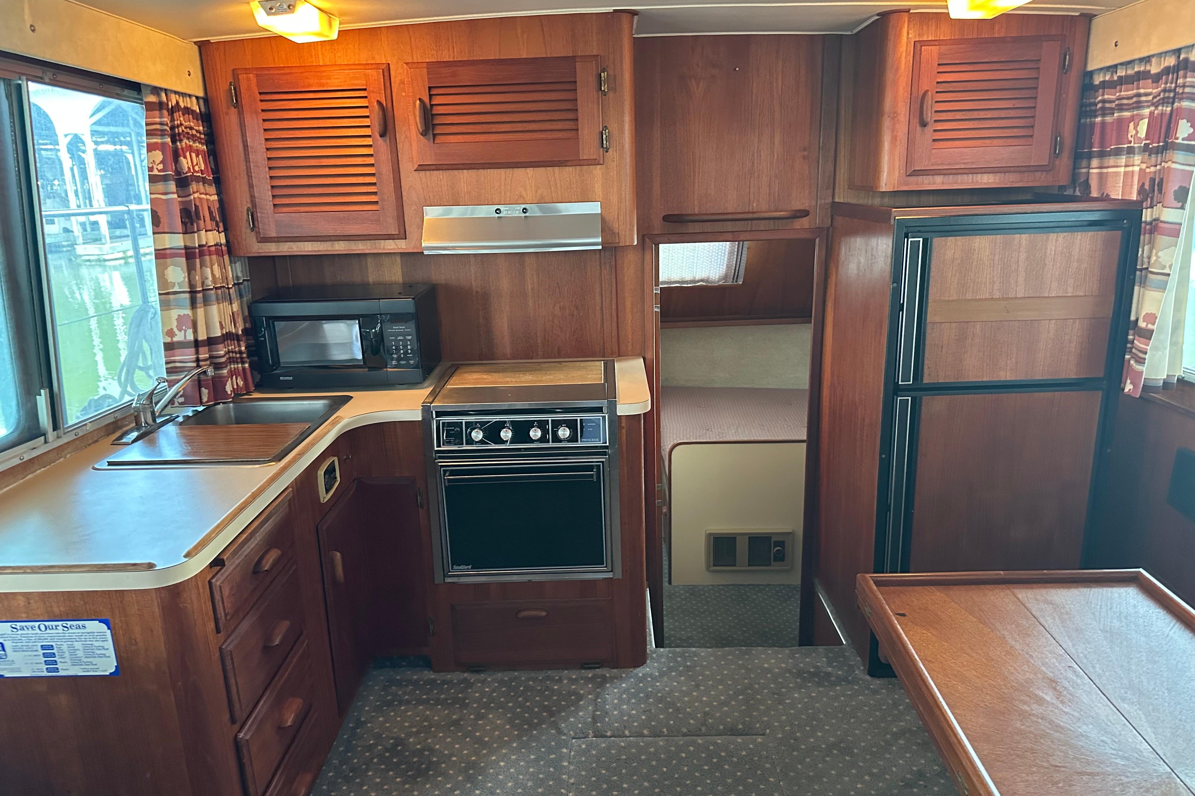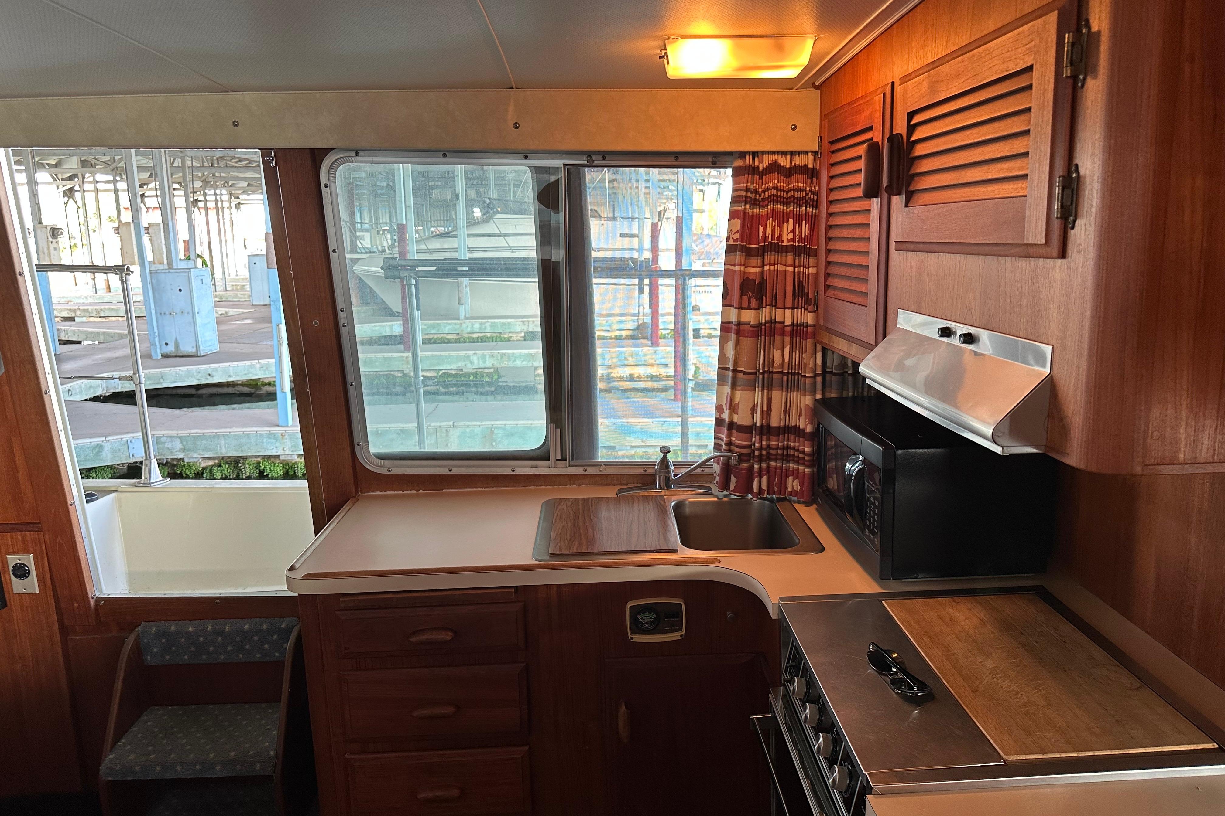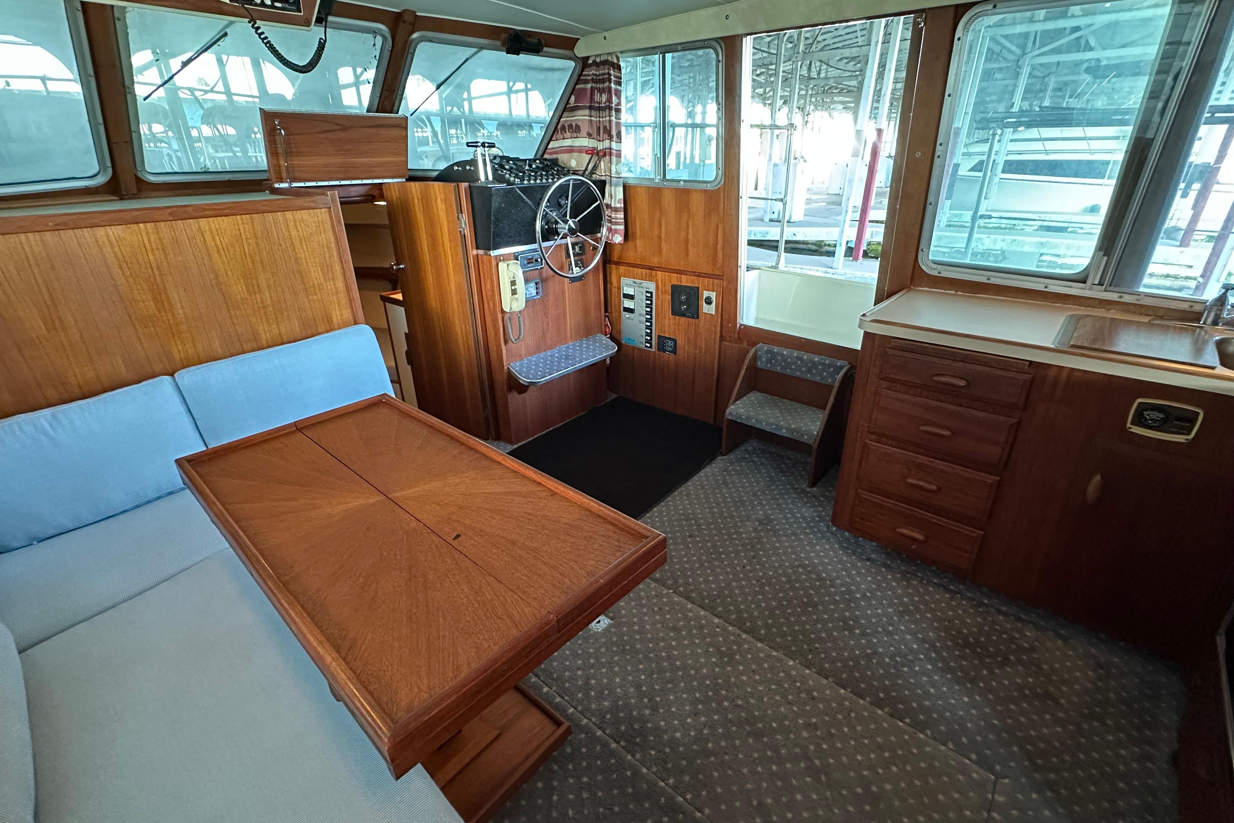 A LOT OF BOAT FOR THE MONEY! – Tw. Crusader 270 hp. direct drive inboard engines & a 6.5 kw Onan Generator. You enter the salon via a side door by the lower helm. To starboard & down two steps is the entrance to the private head & shower + guest cabin with a vee berth in the forepeak. In the salon is an L-shaped seating area, the lower helm & the galley. Aft of the salon is the master stateroom with a double bed to port & storage on the starboard side, plus a private head & shower. The interior cabinetry is teak with pale blue upholstery.