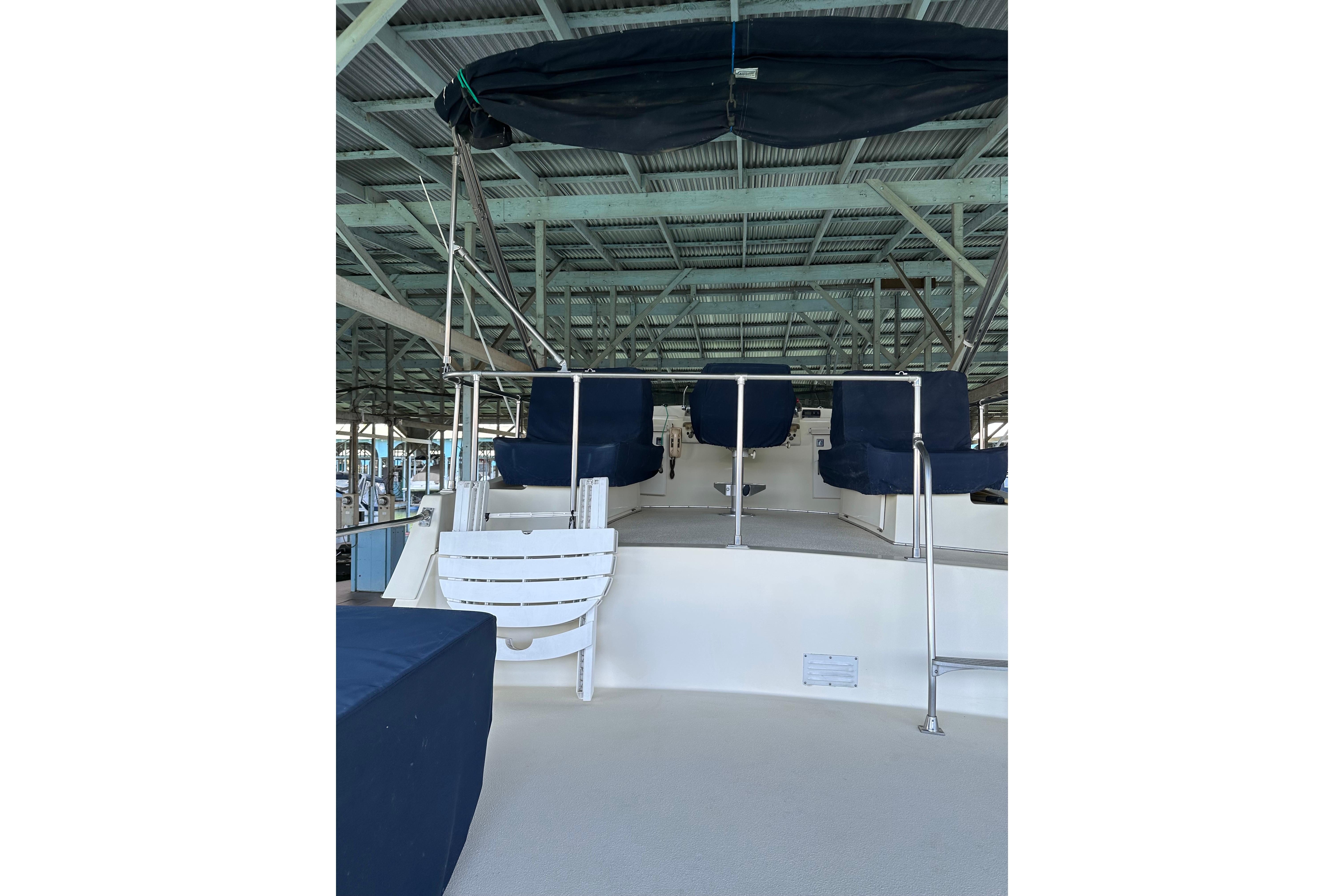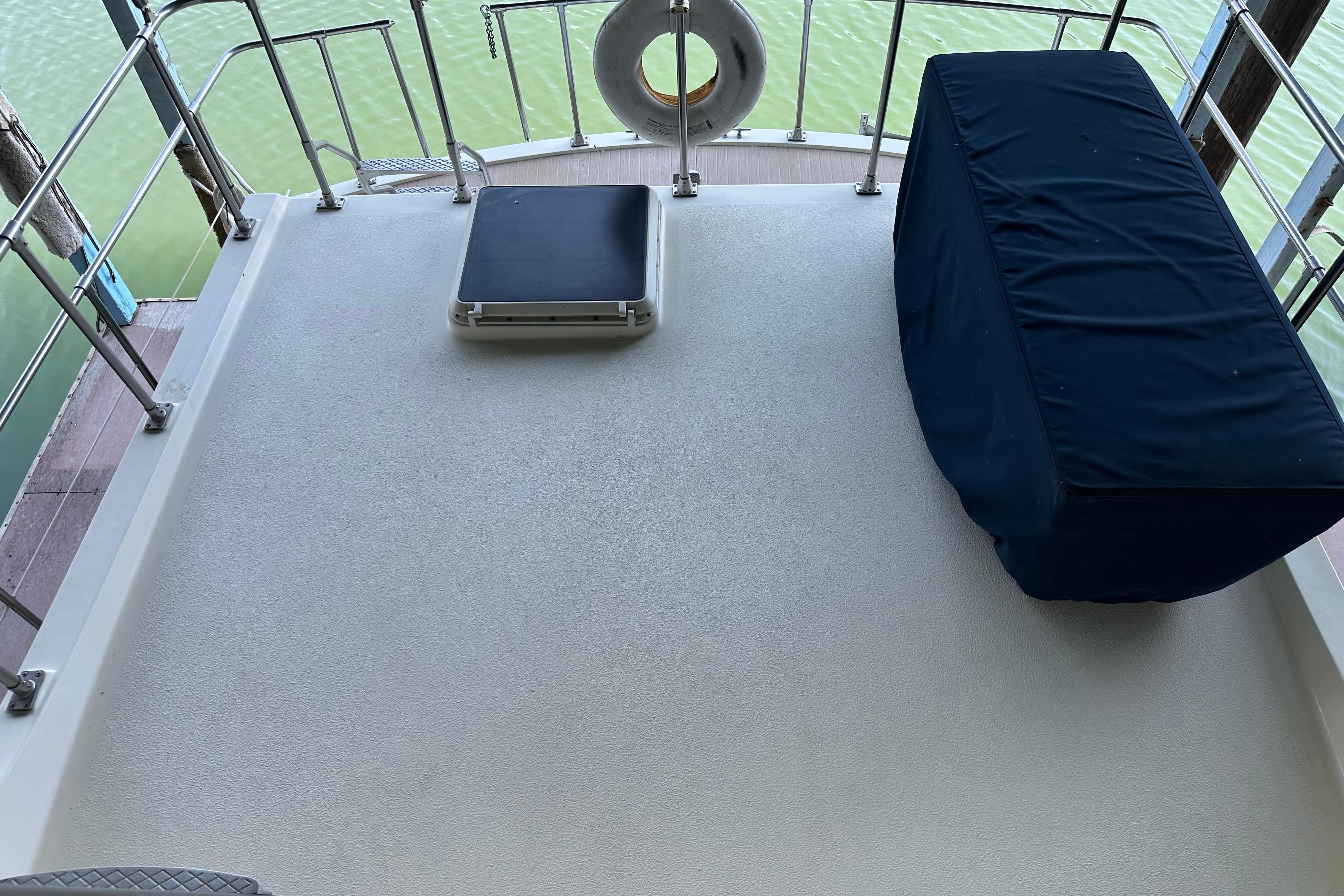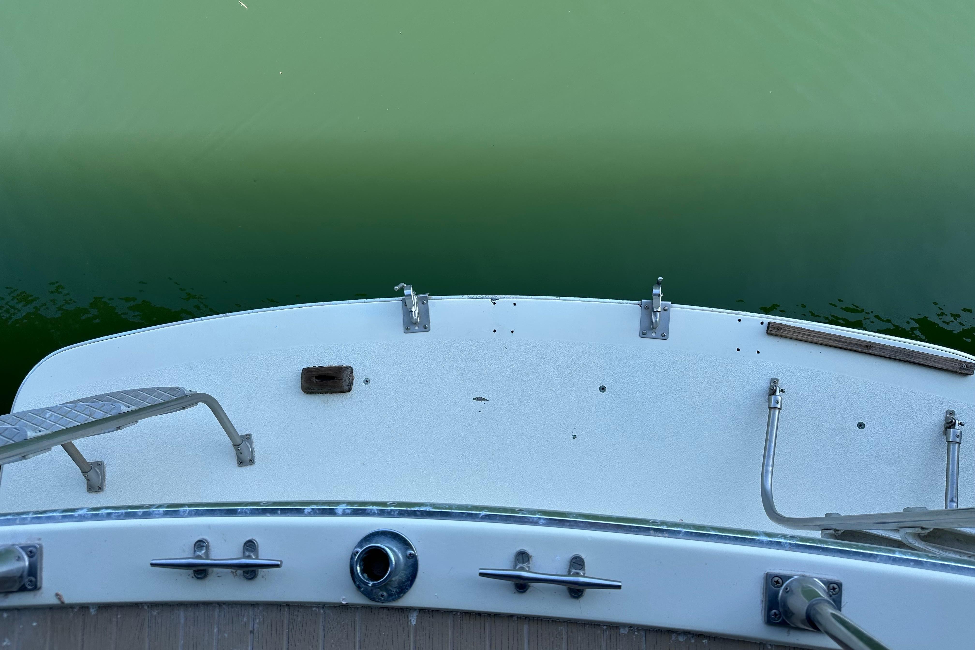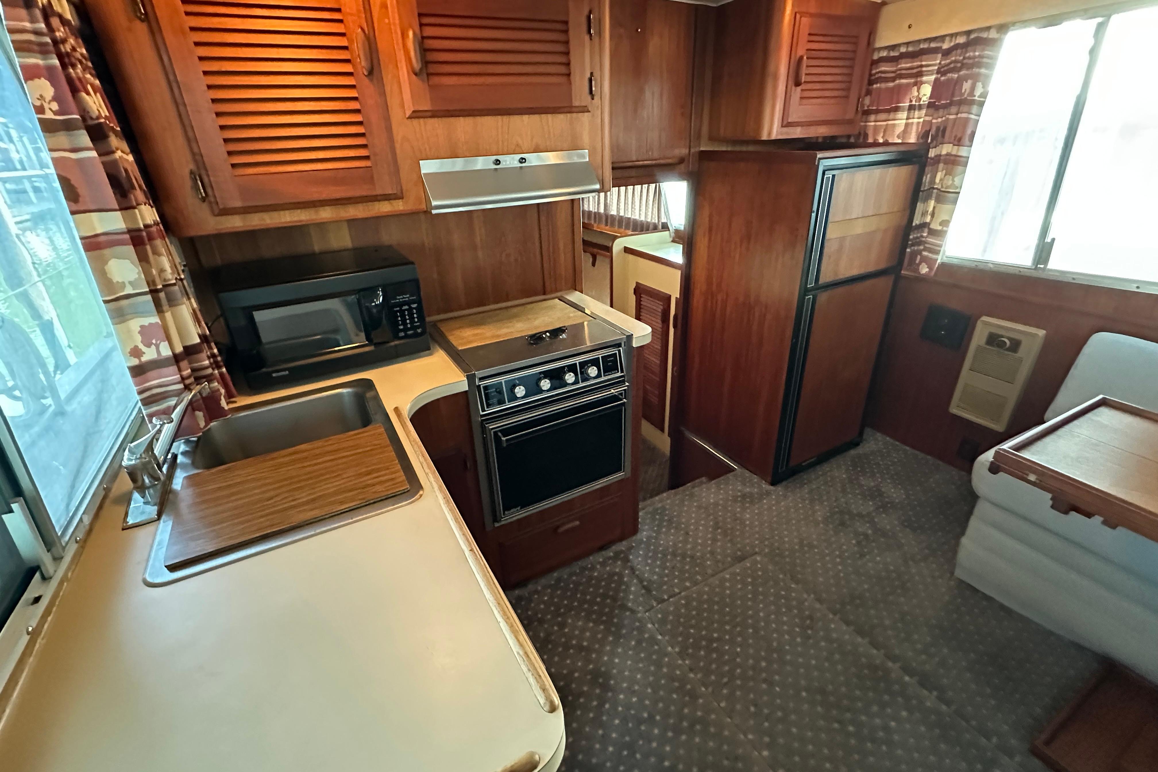 A LOT OF BOAT FOR THE MONEY! – Tw. Crusader 270 hp. direct drive inboard engines & a 6.5 kw Onan Generator. You enter the salon via a side door by the lower helm. To starboard & down two steps is the entrance to the private head & shower + guest cabin with a vee berth in the forepeak. In the salon is an L-shaped seating area, the lower helm & the galley. Aft of the salon is the master stateroom with a double bed to port & storage on the starboard side, plus a private head & shower. The interior cabinetry is teak with pale blue upholstery.