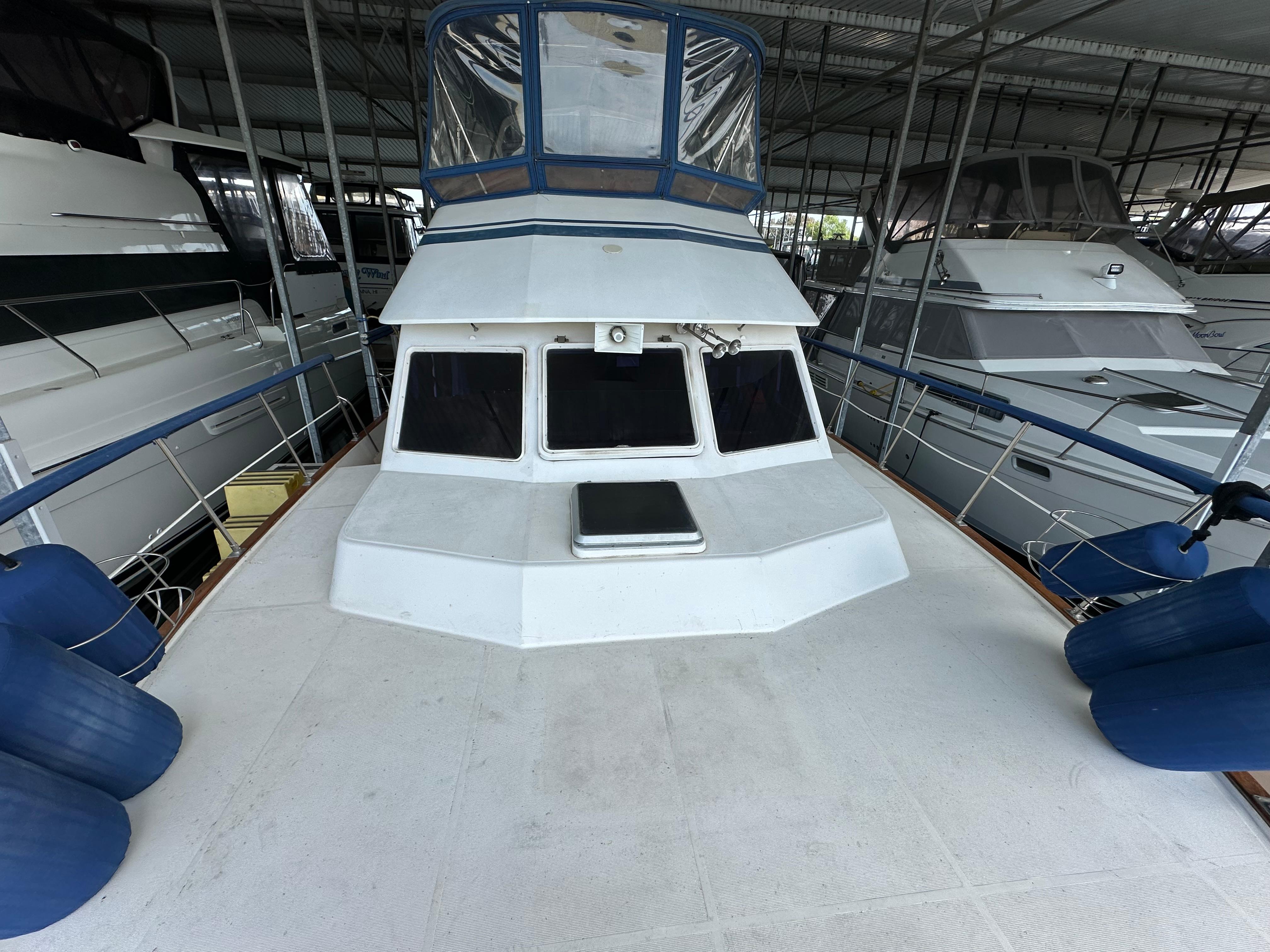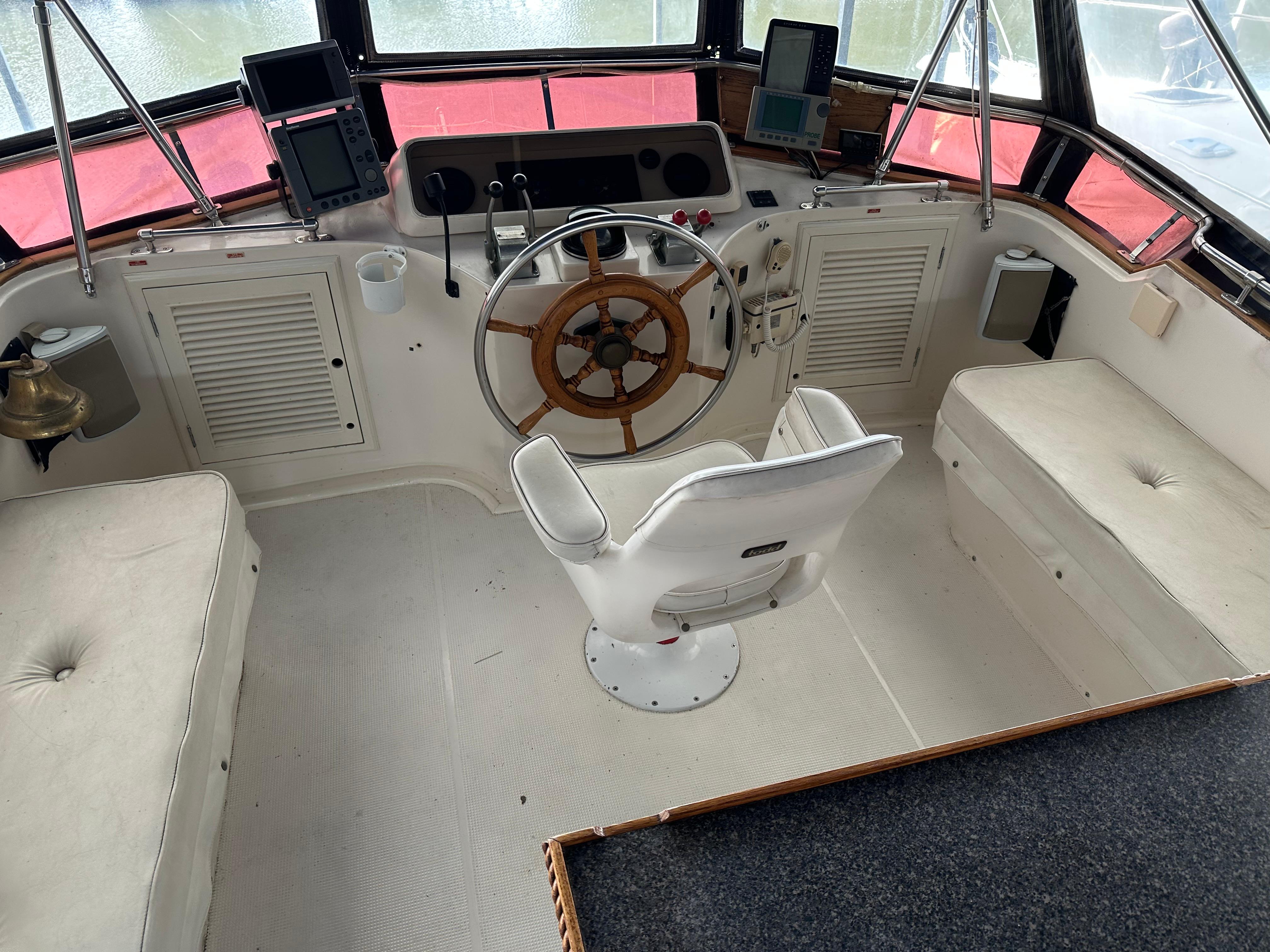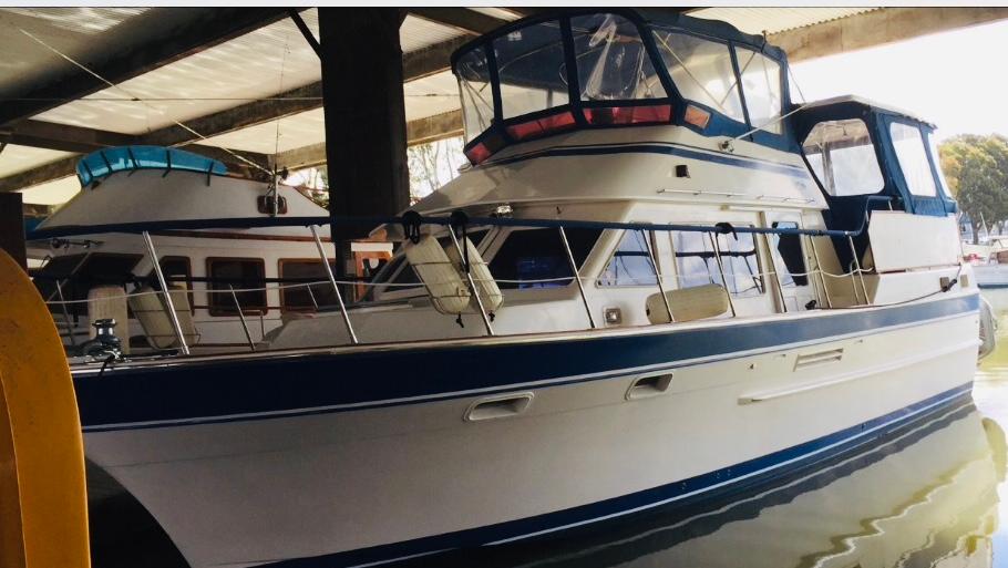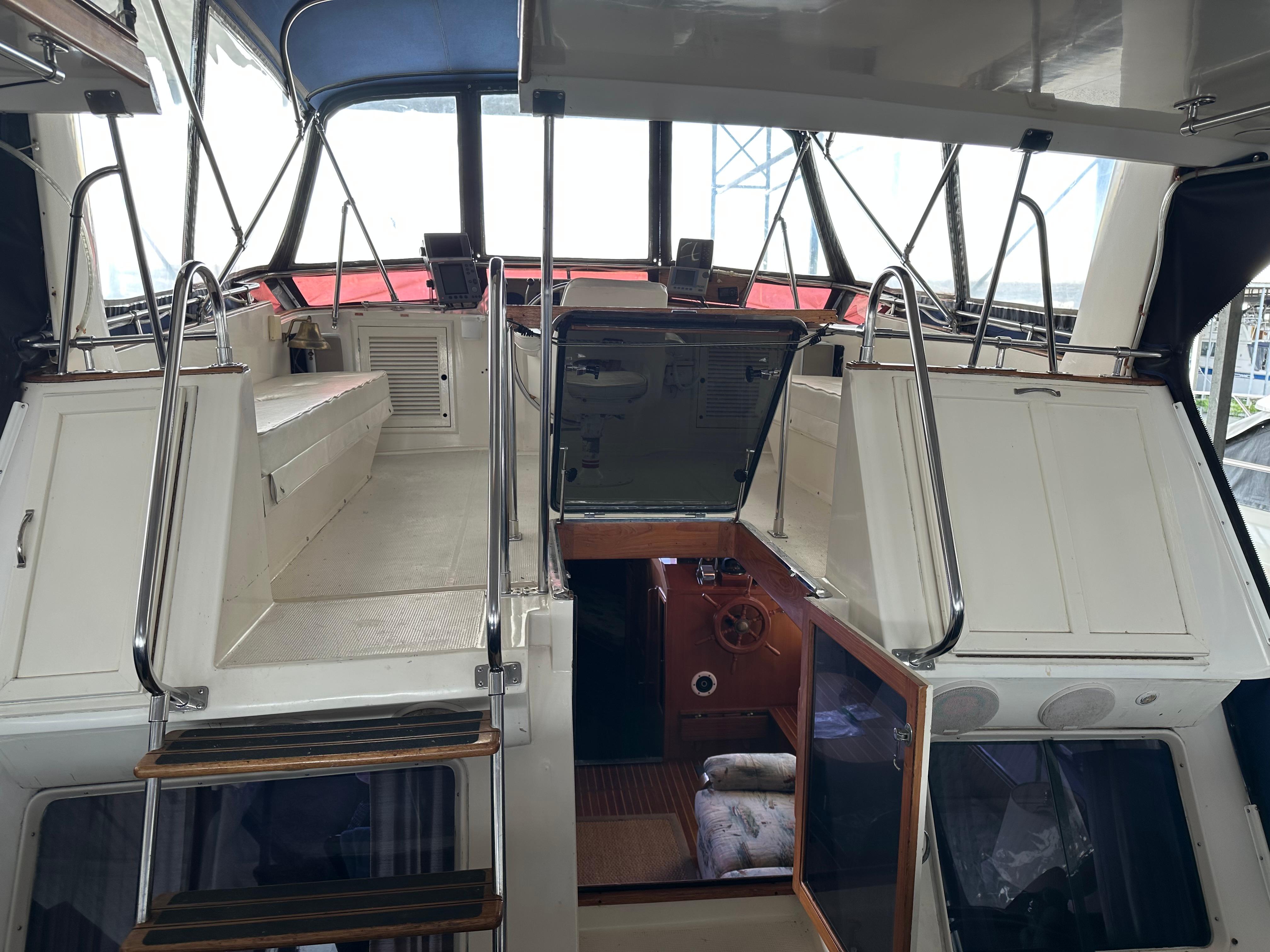 SMART AFT CABIN MOTORYACHT! – Tw. Volvo 165hp diesels and a 7.5kw Onan diesel generator. Spacious 2 stateroom layout & a huge sundeck & flybridge area. Airy salon, a full walk around queen bed in the master stateroom, teak/holly flooring & tons of teak cabinetry. Extras incl: Fully enclosed FB & huge Sundeck w/ some screens, door & hatch screens + rail covers. GPS, Fwd. scanning Depthfinder, Glendenning Synchronizer, Stereo w/Bluetooth & more. Kept in a covered, freshwater berth. A great livaboard or comfortable cruiser.