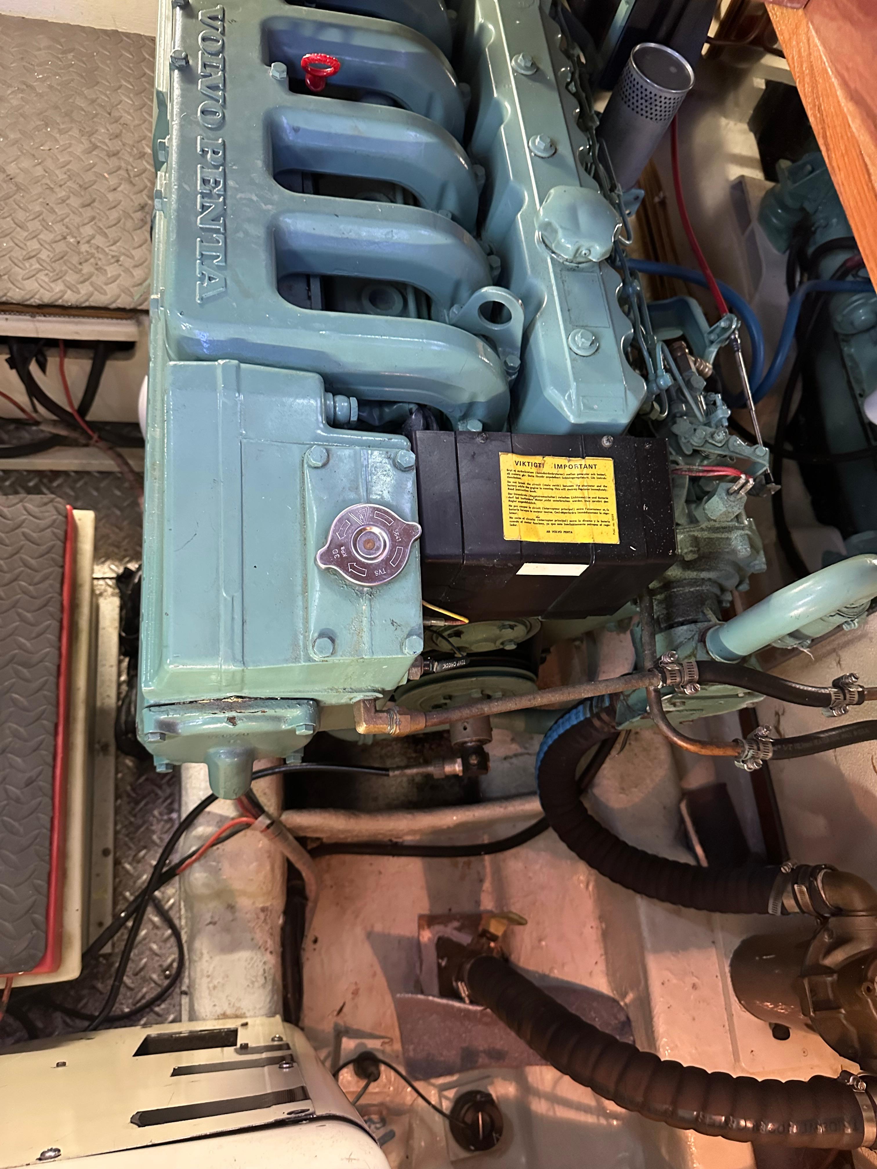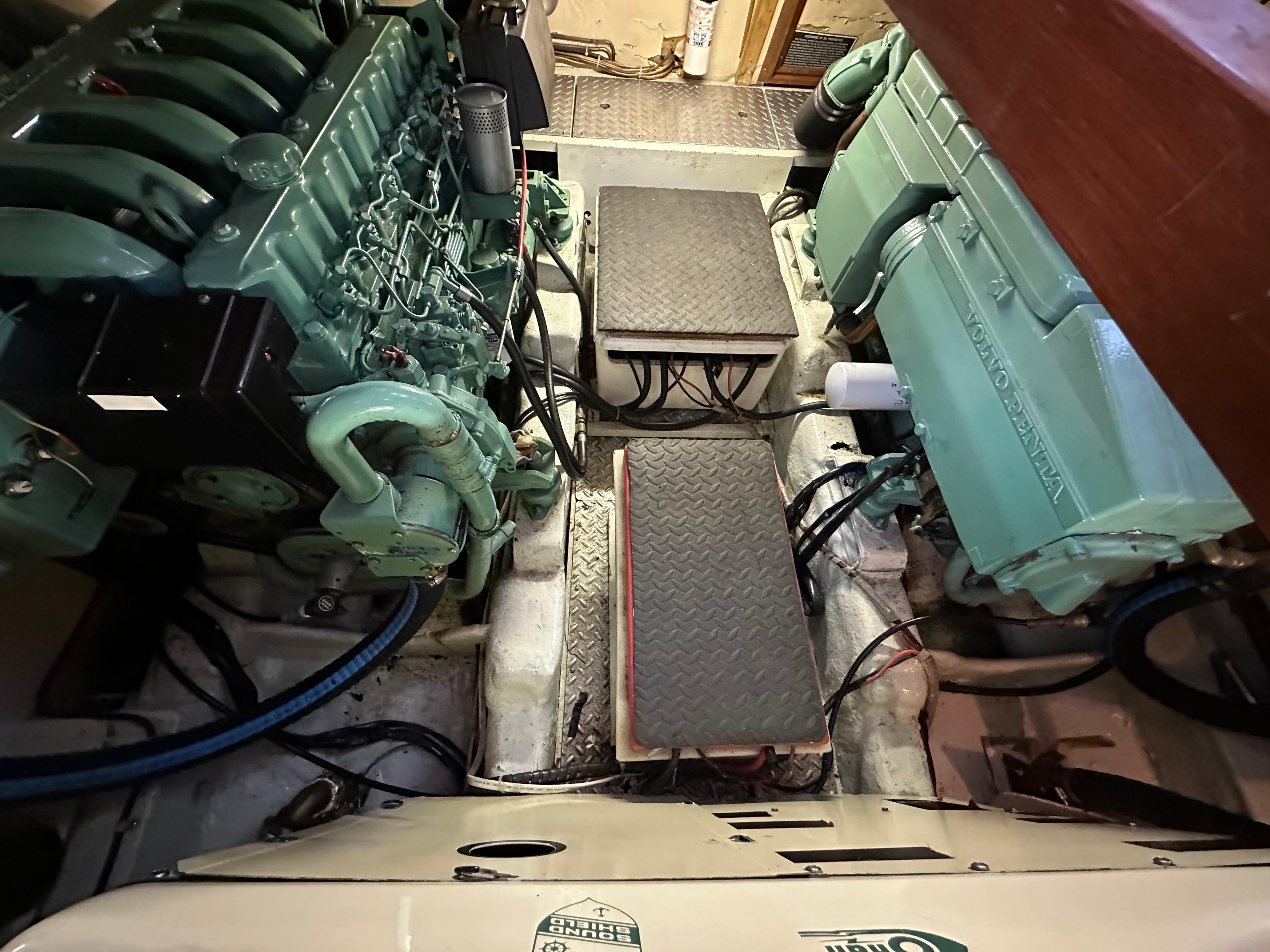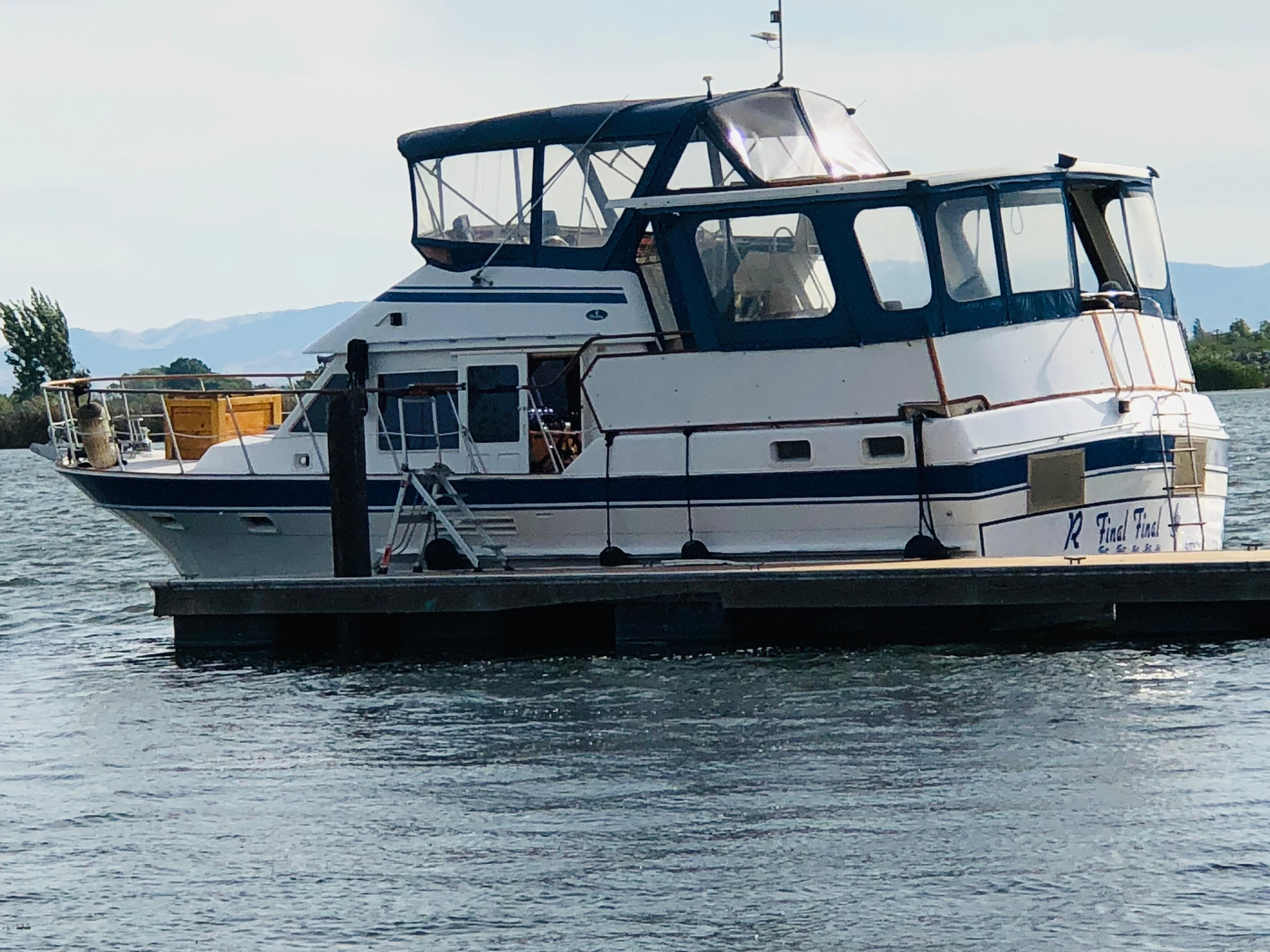 SMART AFT CABIN MOTORYACHT! – Tw. Volvo 165hp diesels and a 7.5kw Onan diesel generator. Spacious 2 stateroom layout & a huge sundeck & flybridge area. Airy salon, a full walk around queen bed in the master stateroom, teak/holly flooring & tons of teak cabinetry. Extras incl: Fully enclosed FB & huge Sundeck w/ some screens, door & hatch screens + rail covers. GPS, Fwd. scanning Depthfinder, Glendenning Synchronizer, Stereo w/Bluetooth & more. Kept in a covered, freshwater berth. A great livaboard or comfortable cruiser.
