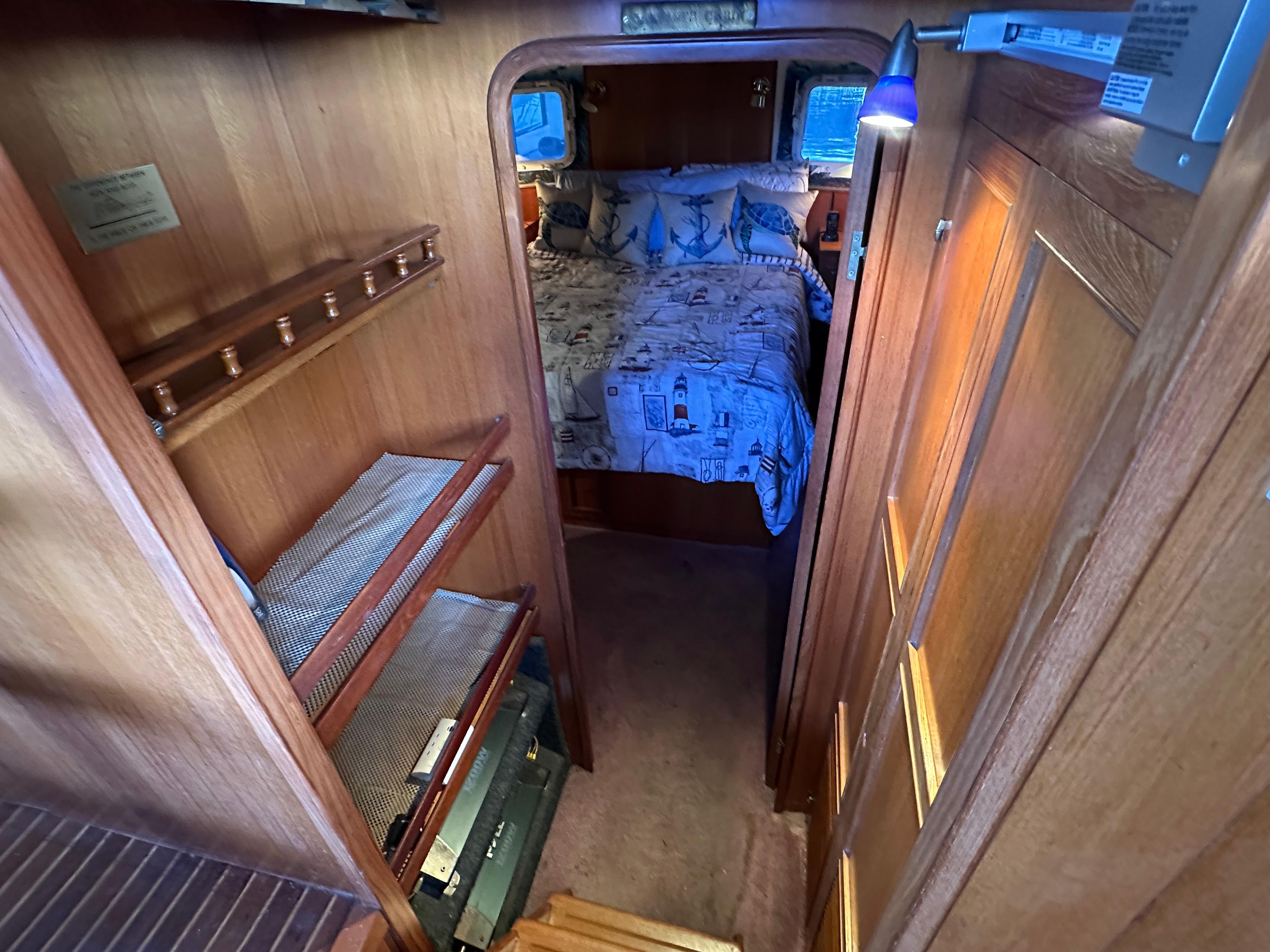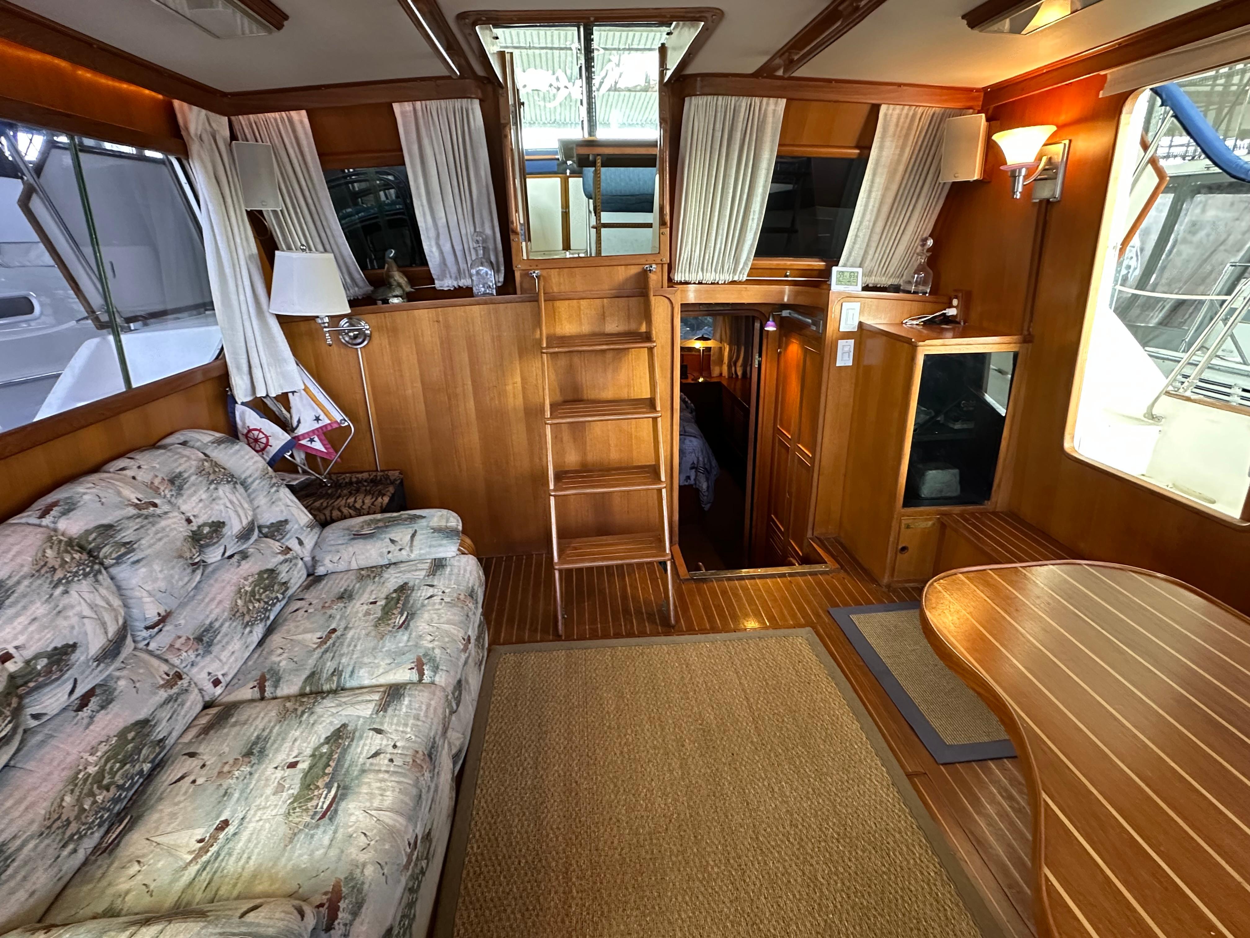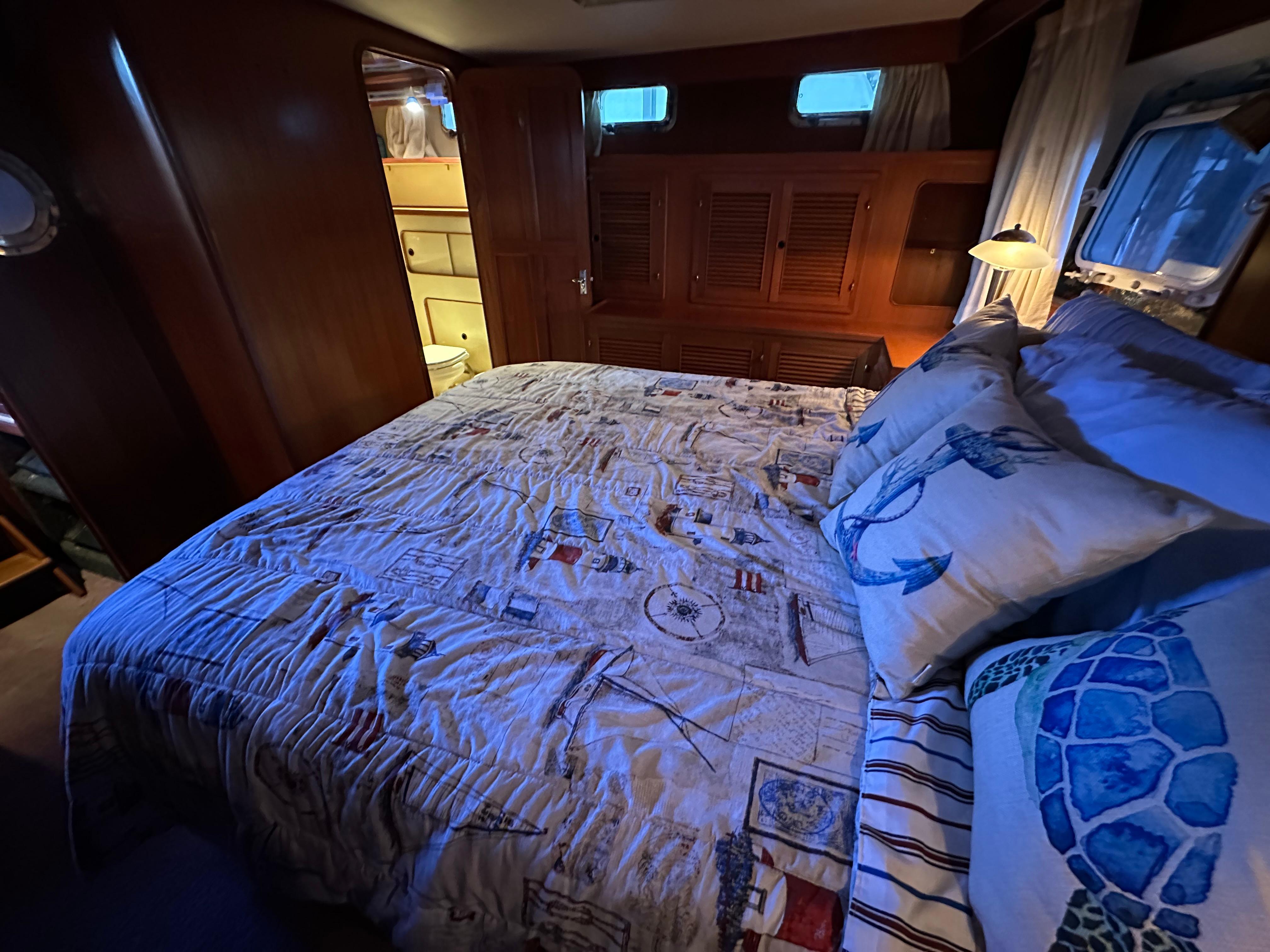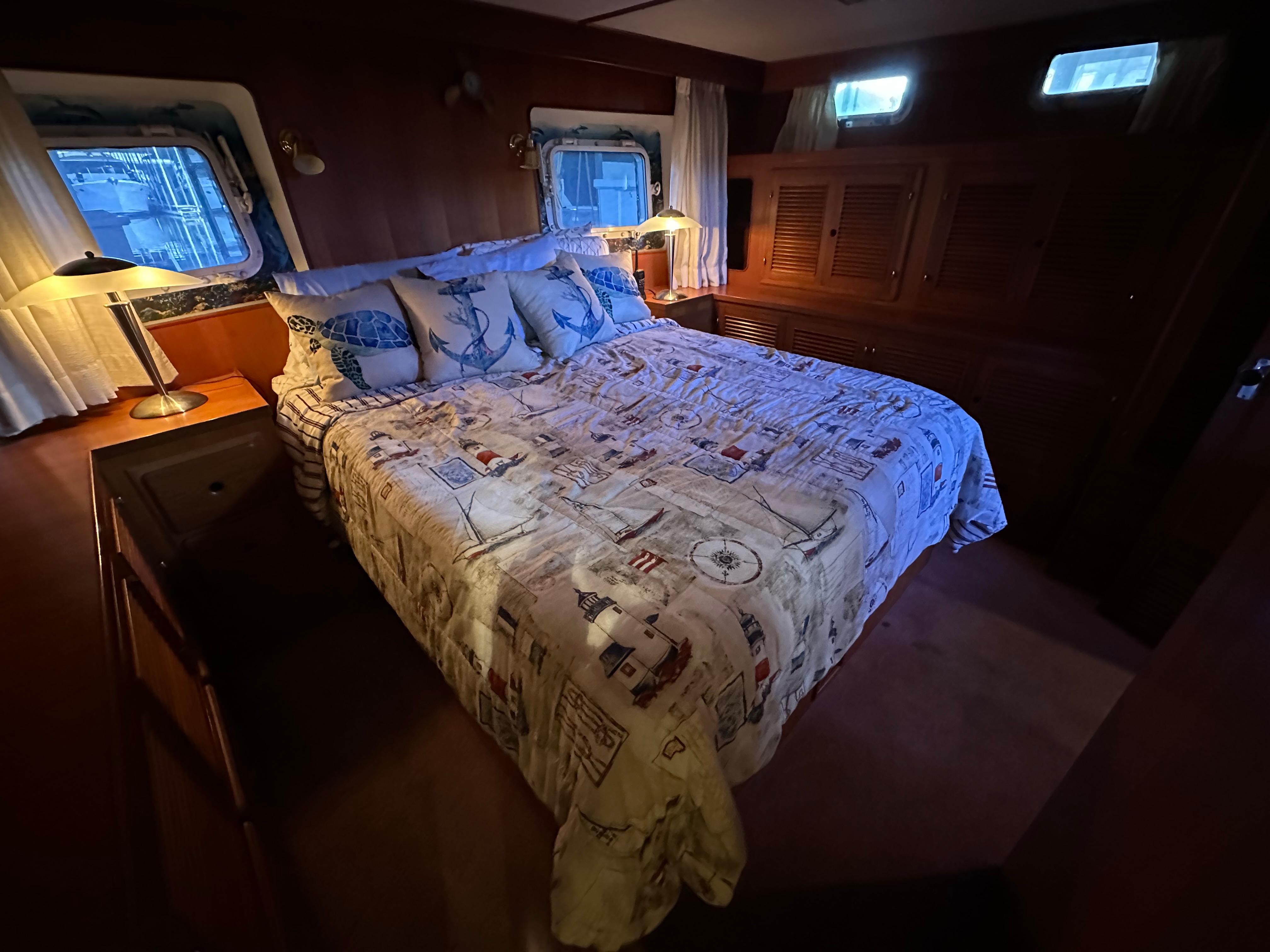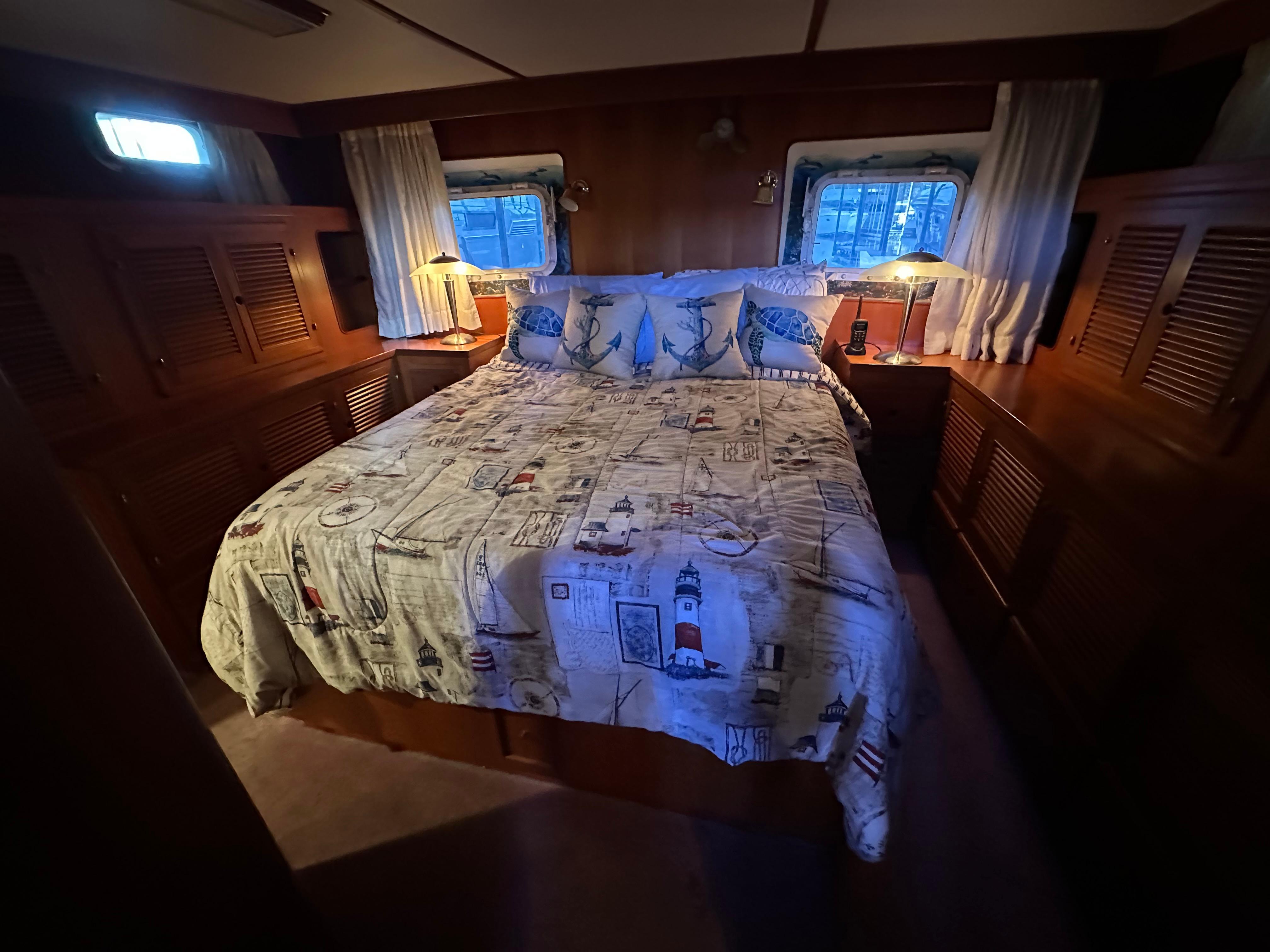 You enter the salon via two side entry doors or from the sundeck. The lower helm is on the starboard side and ‘recliner’ sofa is behind the helm area. On the port side is an L-shaped built in dinette area with a teak table. The U-shaped galley is forward and down on the port side w/entrance to the guest head/shower combo opposite. The guest cabin features a large vee berth . Aft of the salon is a very spacious master stateroom with a queen walk around bed and a lot of teak storage cabinets. The private master head has a tub shower.