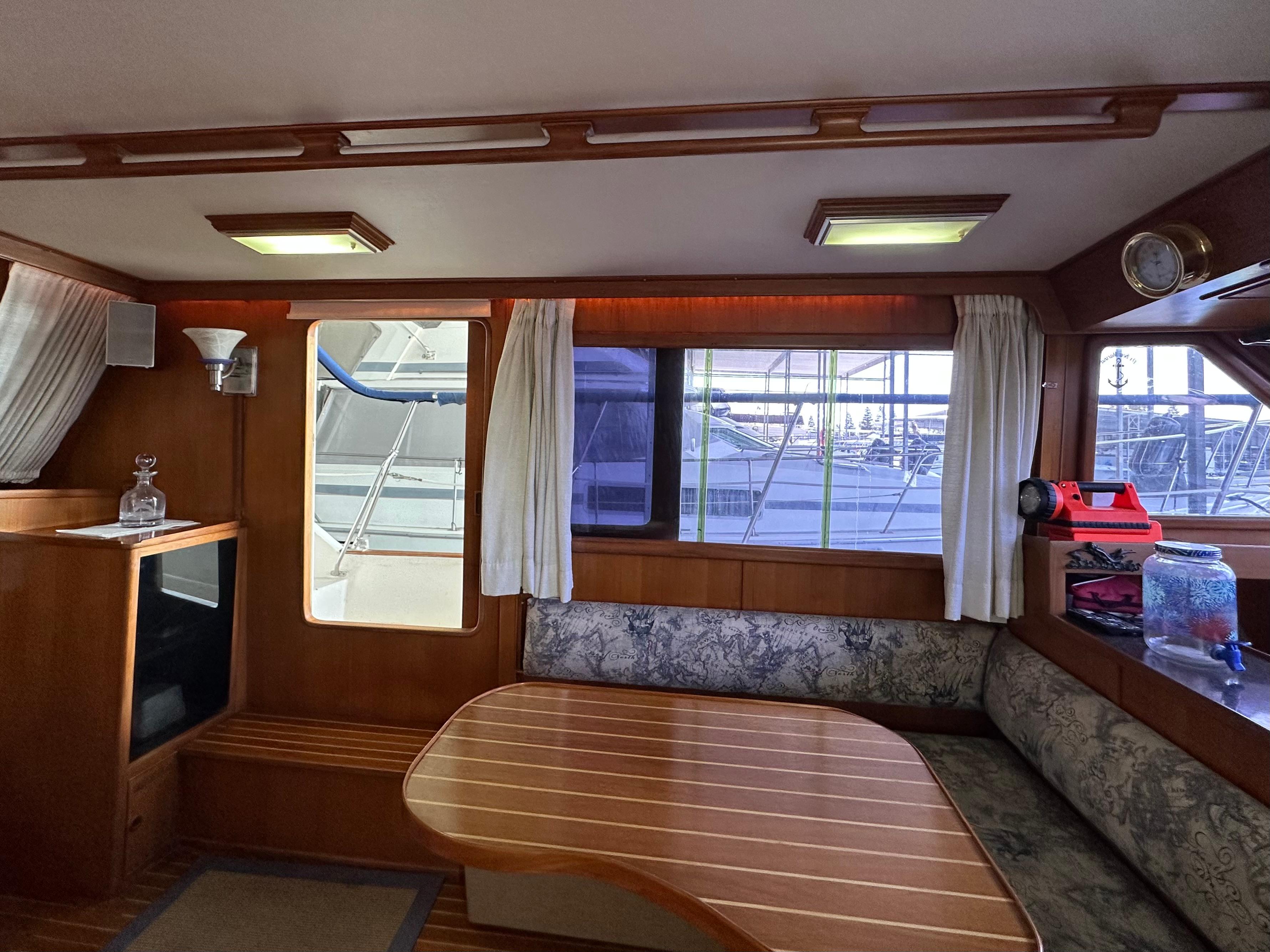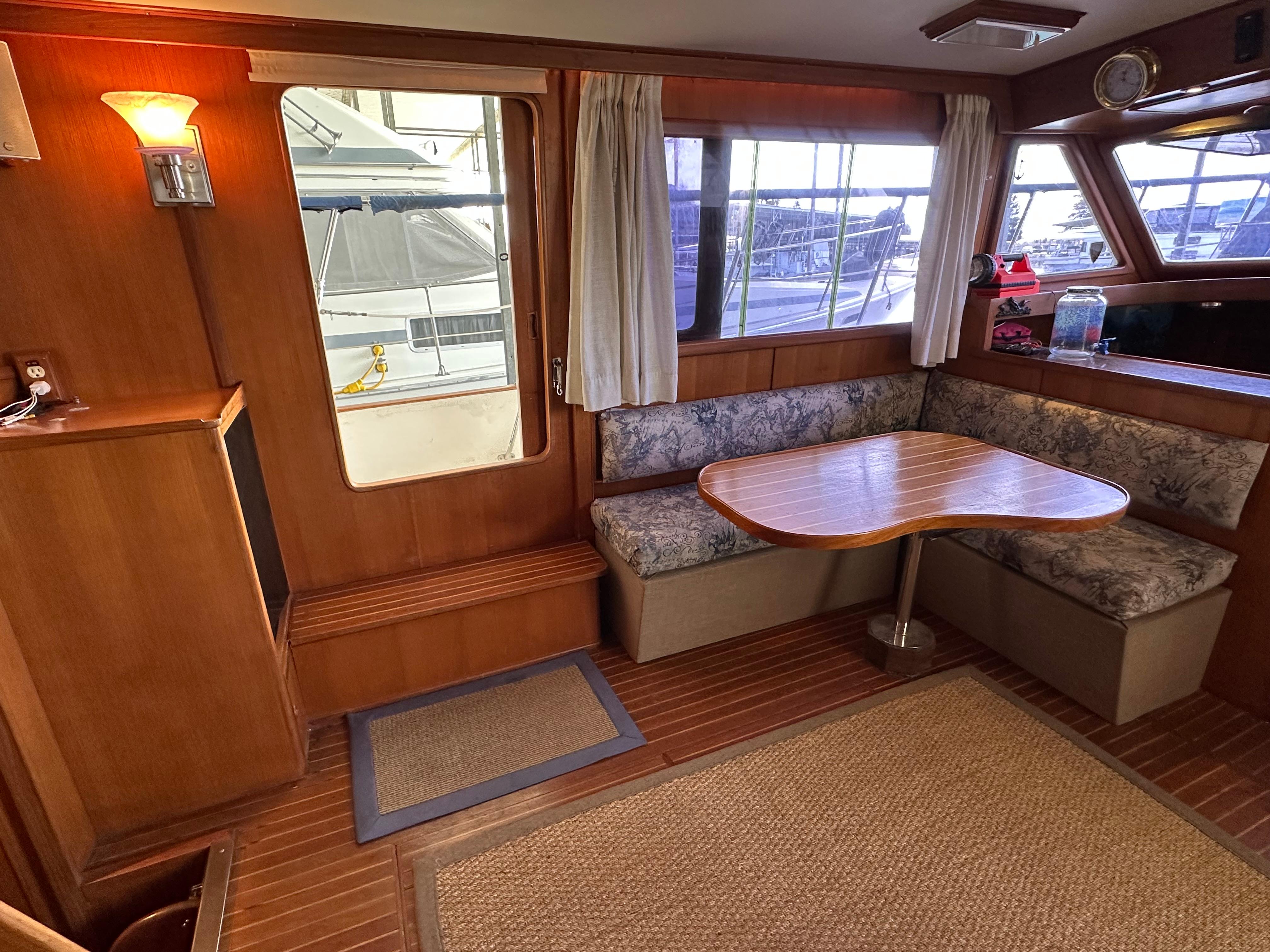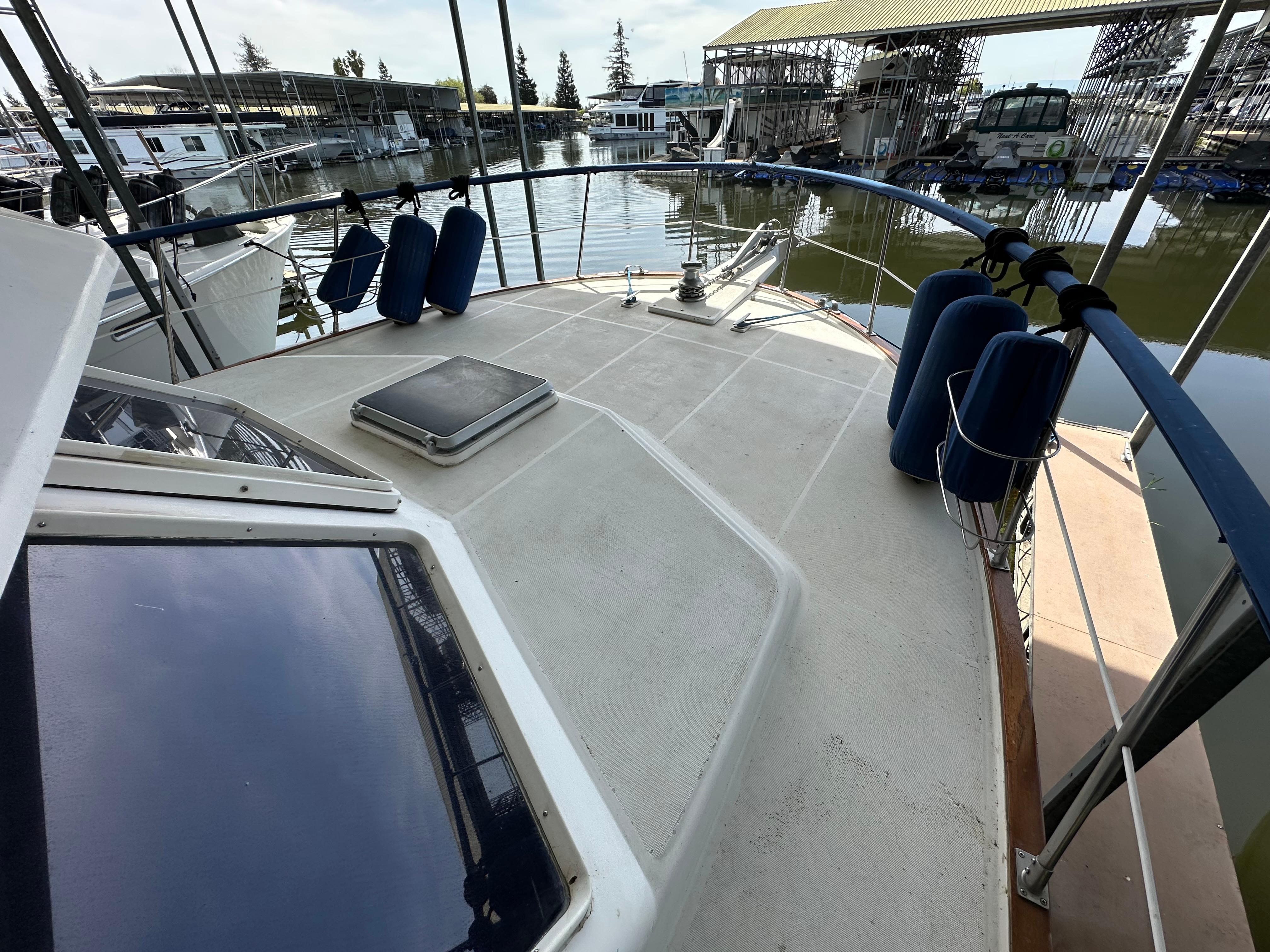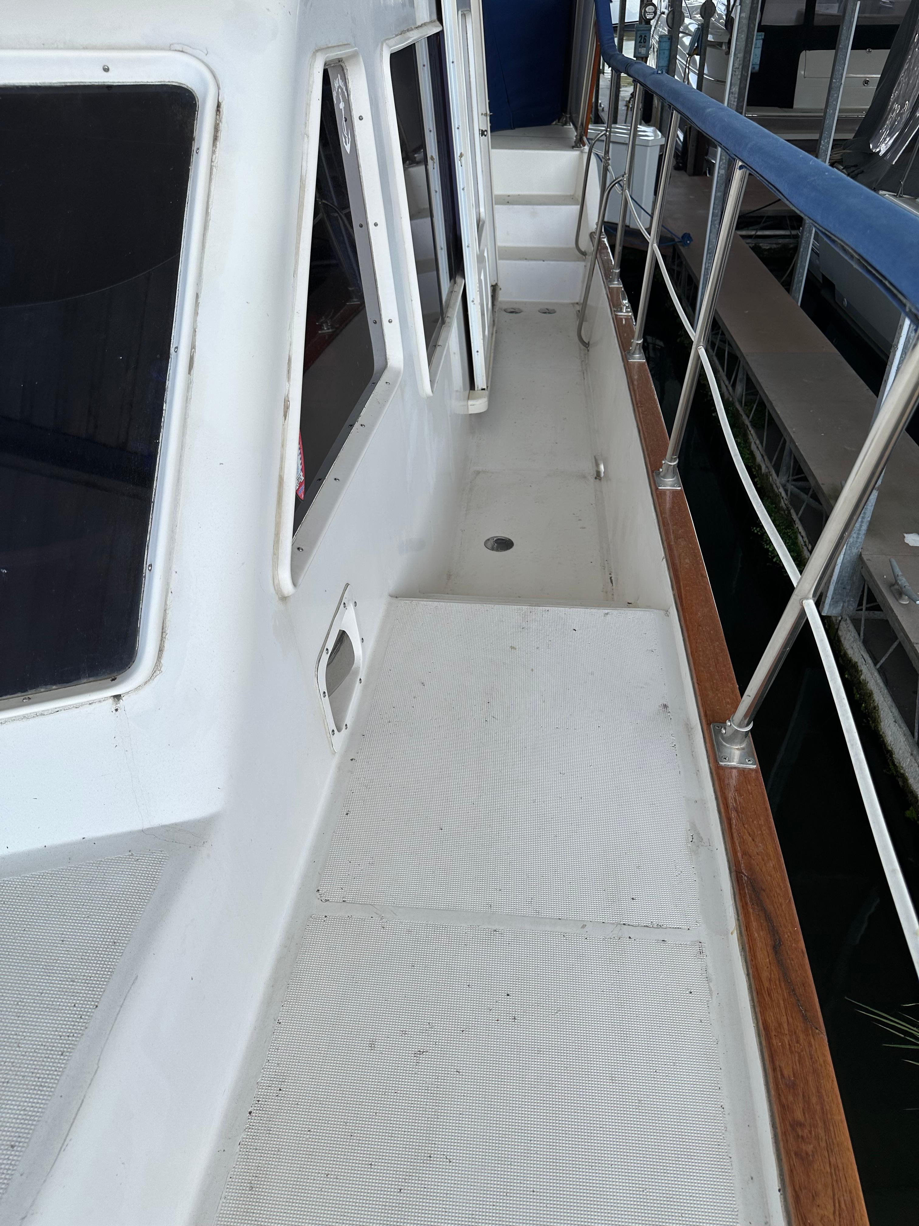 You enter the salon via two side entry doors or from the sundeck. The lower helm is on the starboard side and ‘recliner’ sofa is behind the helm area. On the port side is an L-shaped built in dinette area with a teak table. The U-shaped galley is forward and down on the port side w/entrance to the guest head/shower combo opposite. The guest cabin features a large vee berth . Aft of the salon is a very spacious master stateroom with a queen walk around bed and a lot of teak storage cabinets. The private master head has a tub shower.