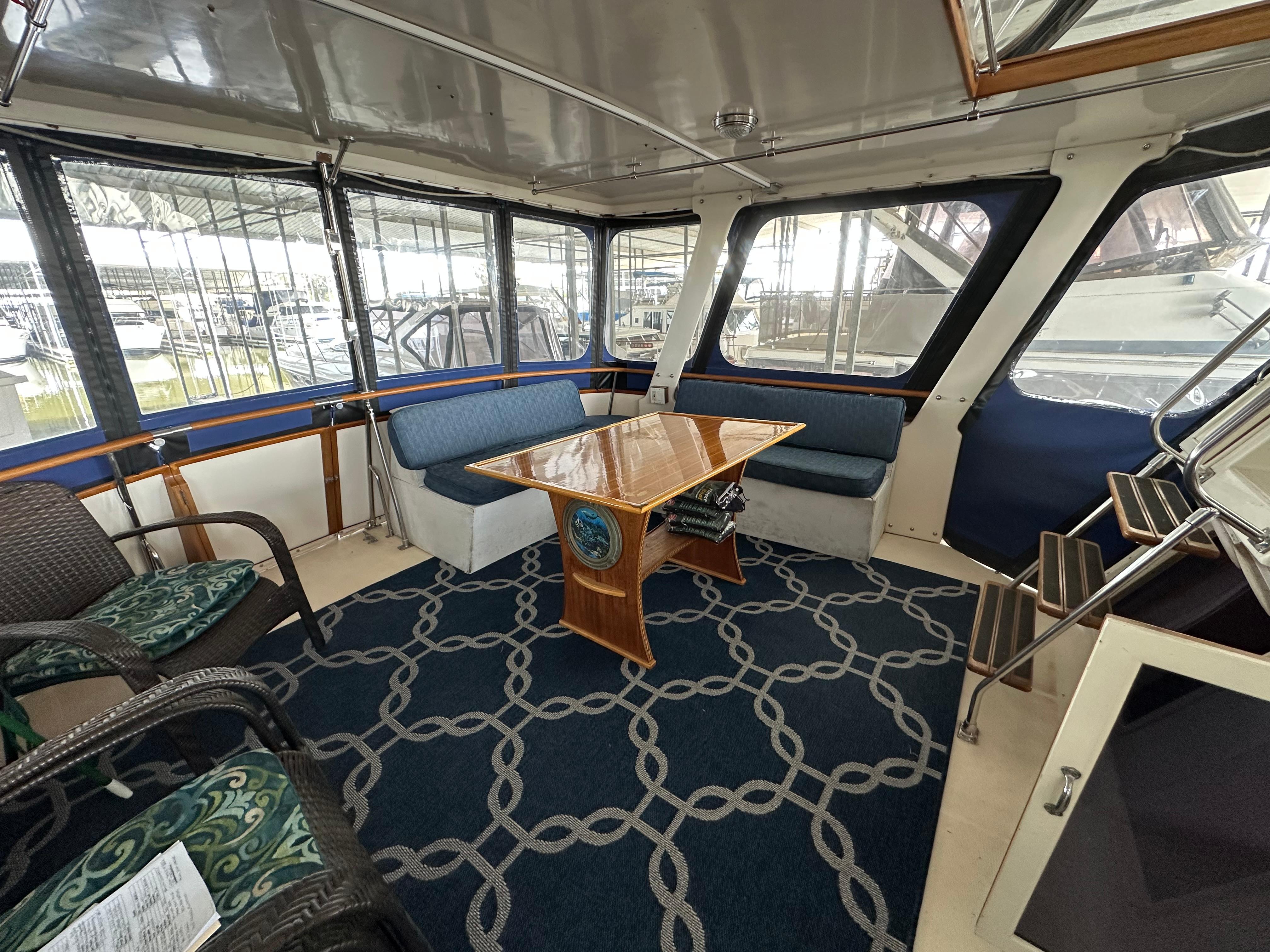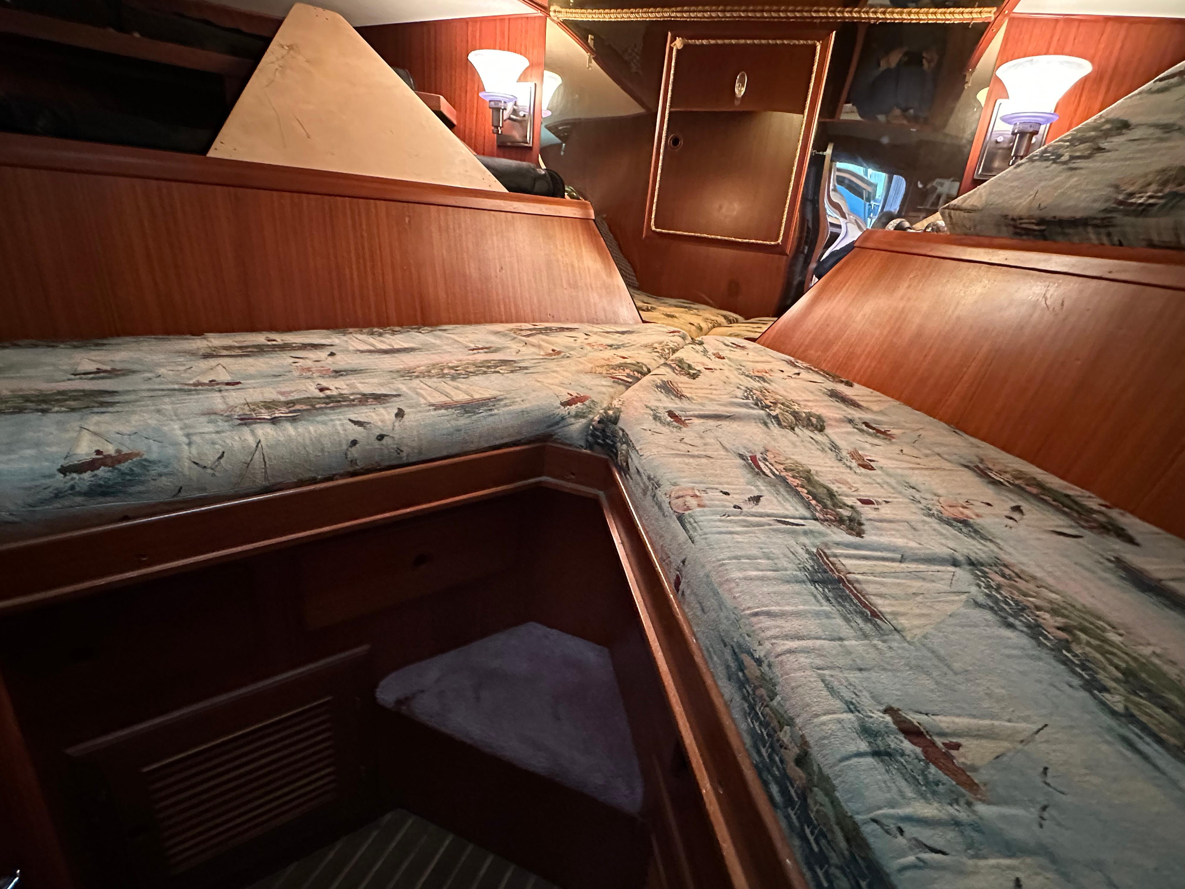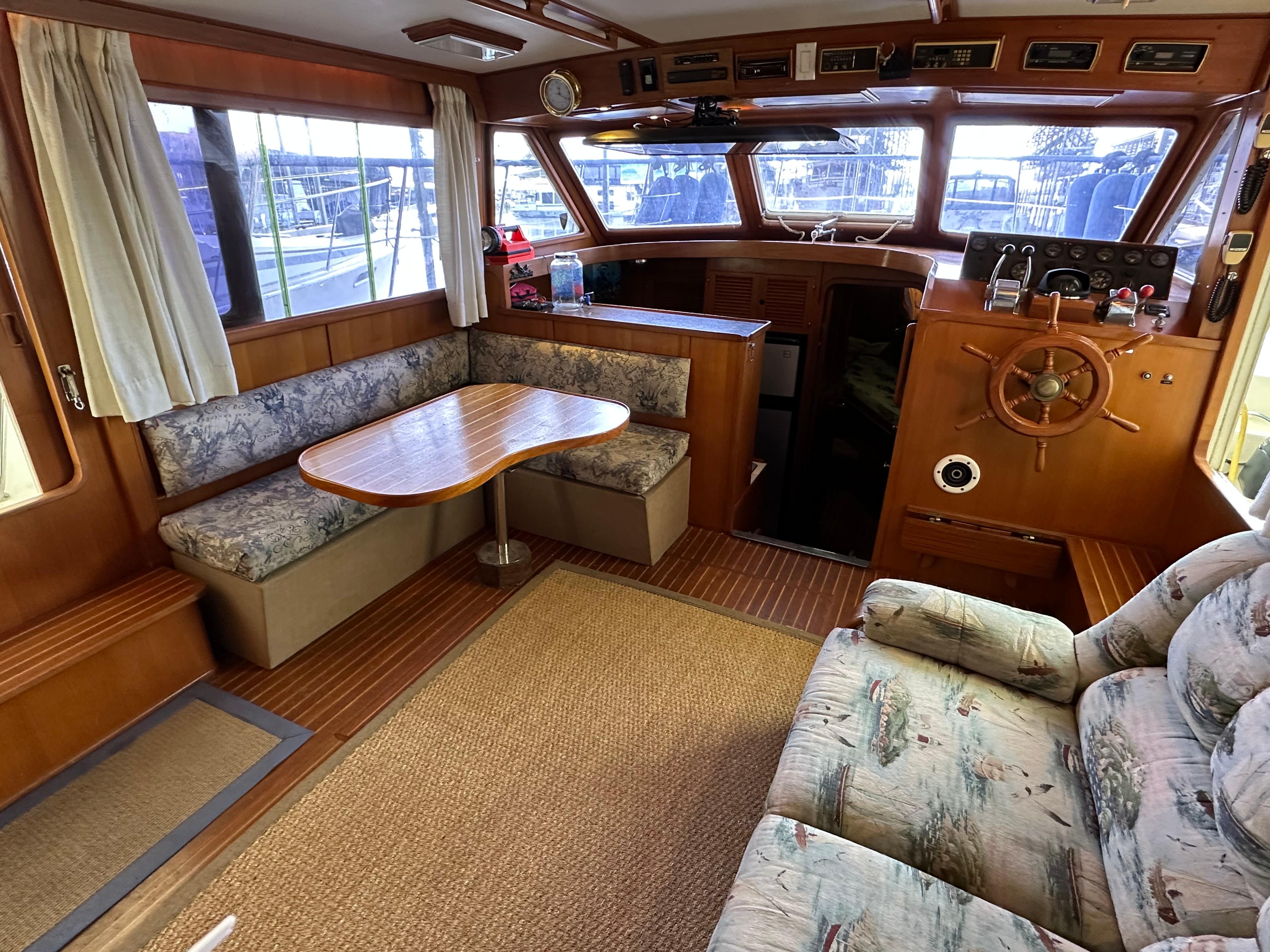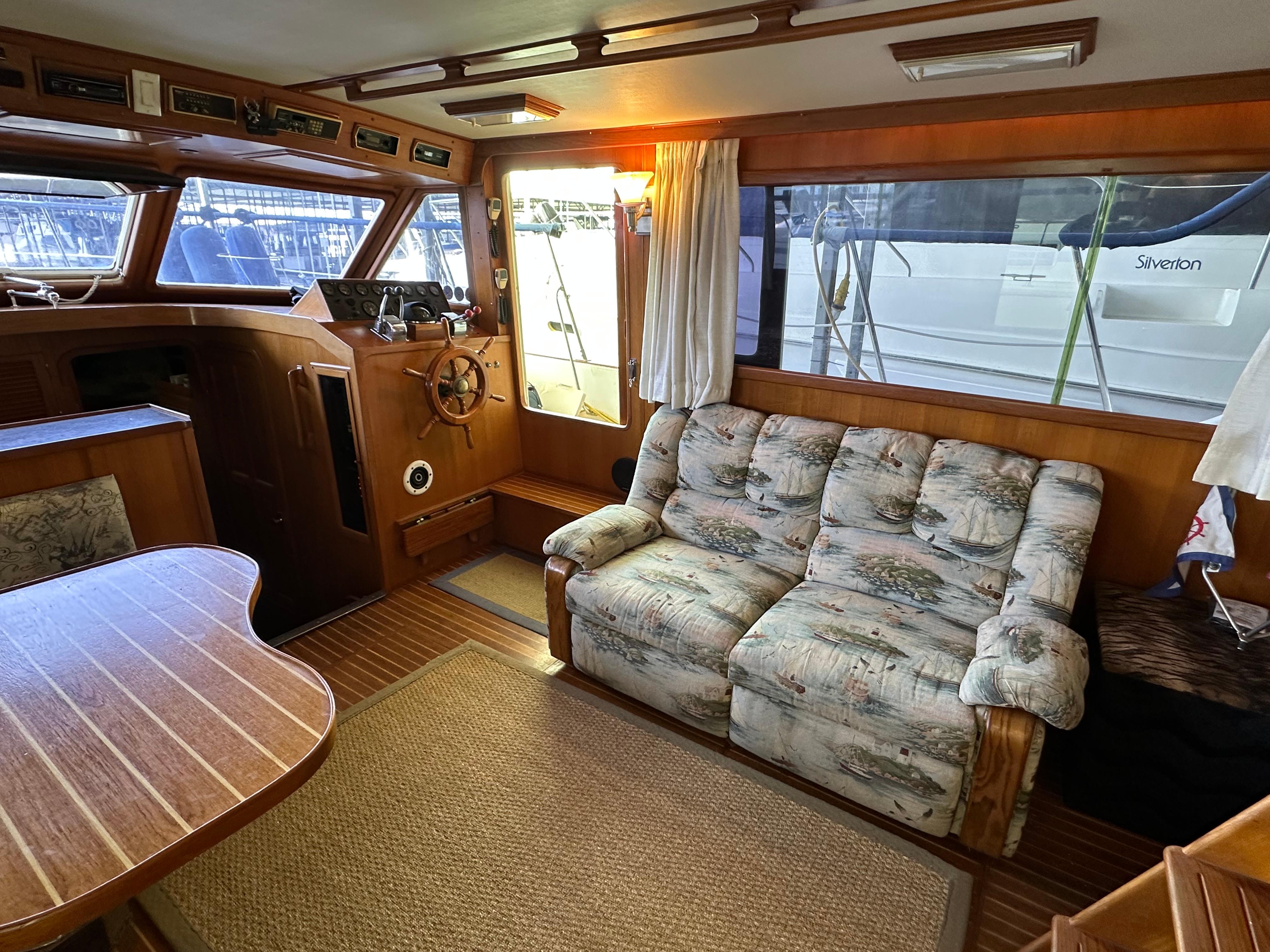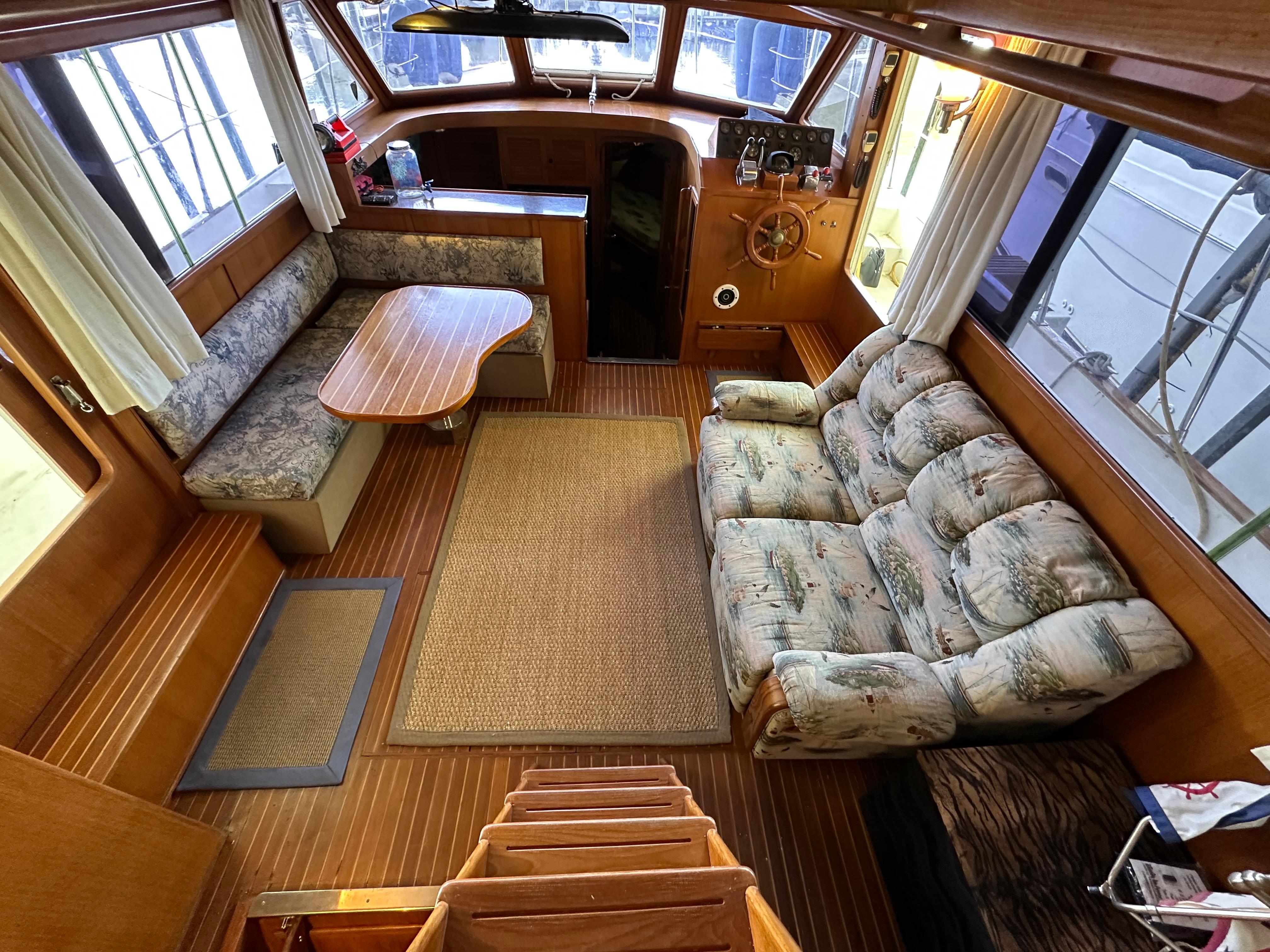 You enter the salon via two side entry doors or from the sundeck. The lower helm is on the starboard side and ‘recliner’ sofa is behind the helm area. On the port side is an L-shaped built in dinette area with a teak table. The U-shaped galley is forward and down on the port side w/entrance to the guest head/shower combo opposite. The guest cabin features a large vee berth . Aft of the salon is a very spacious master stateroom with a queen walk around bed and a lot of teak storage cabinets. The private master head has a tub shower.