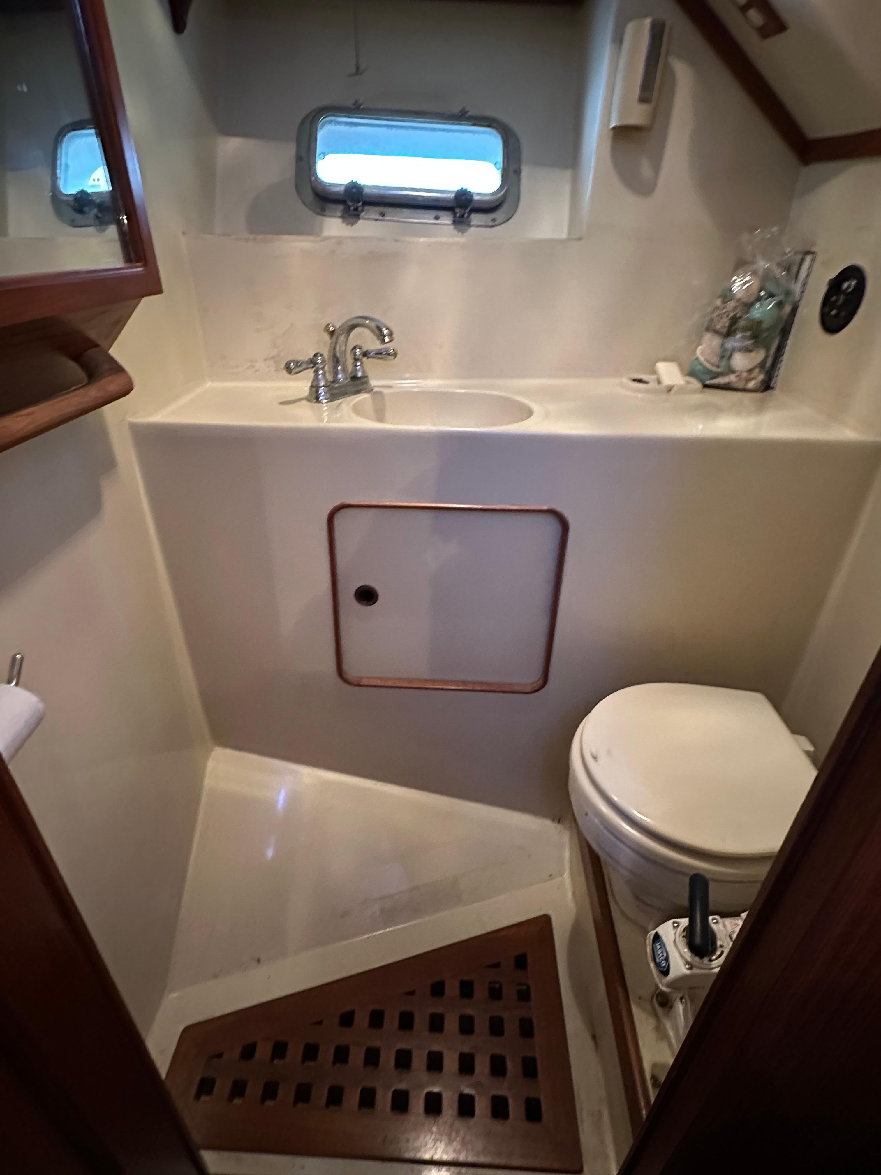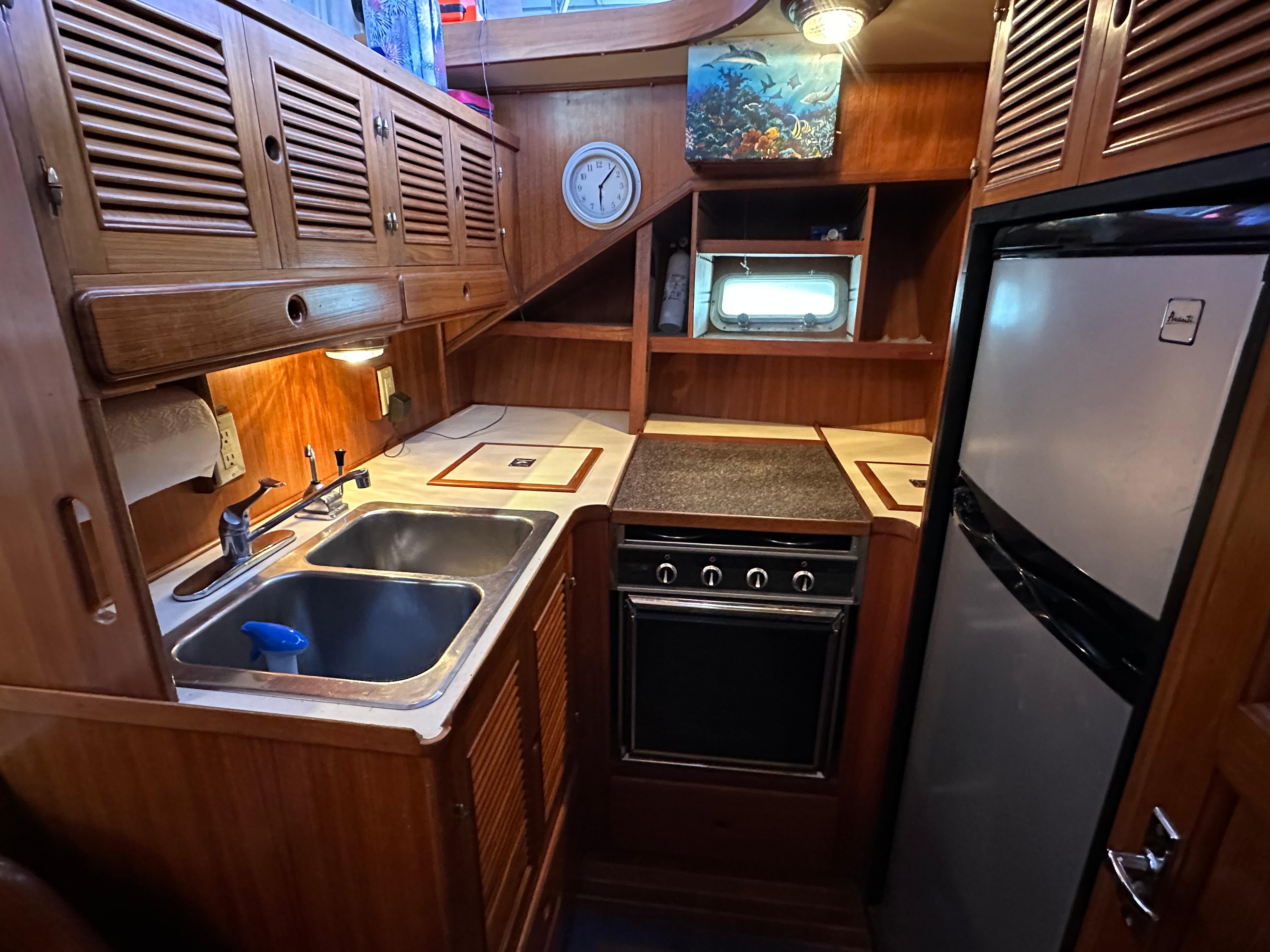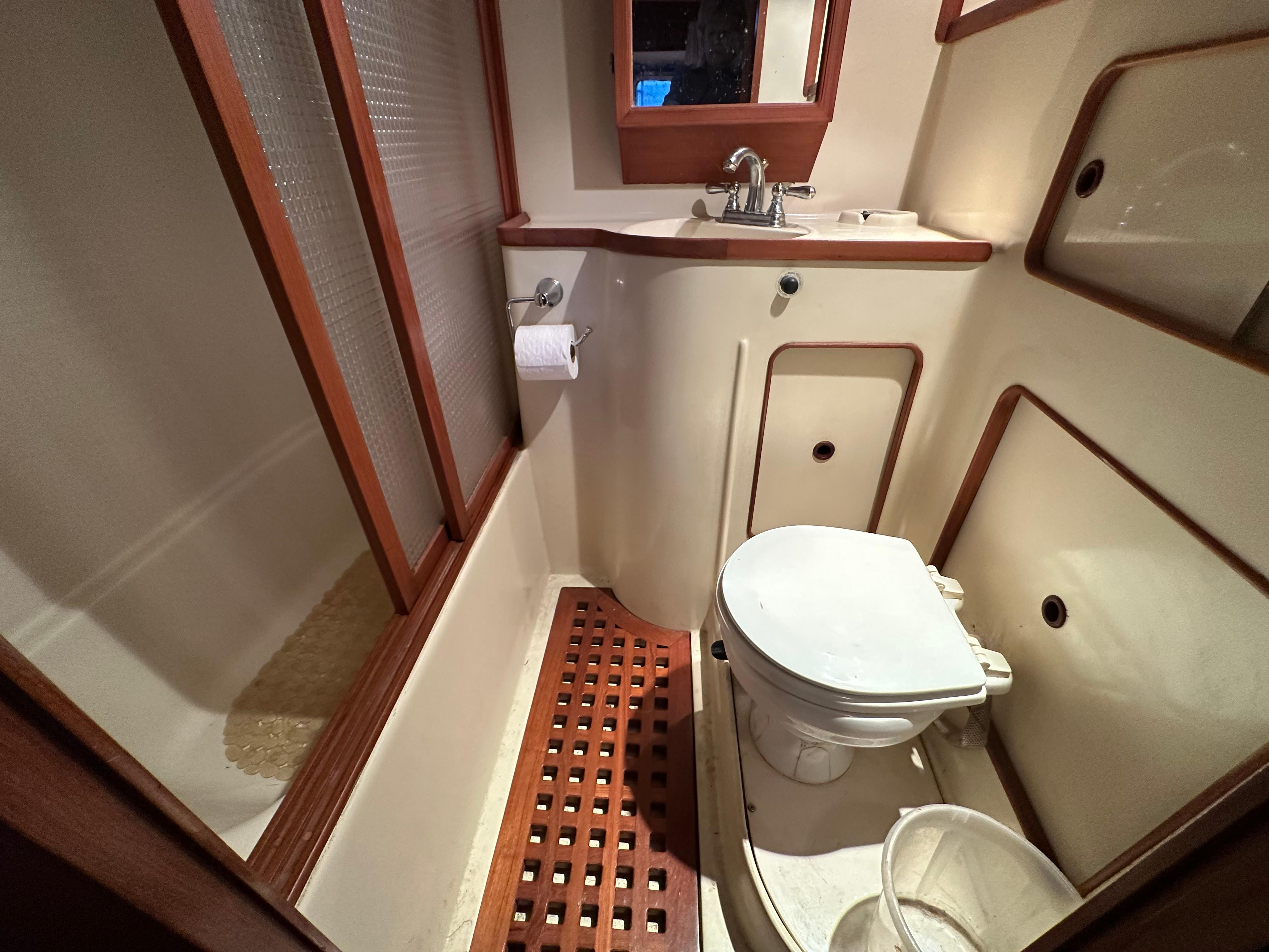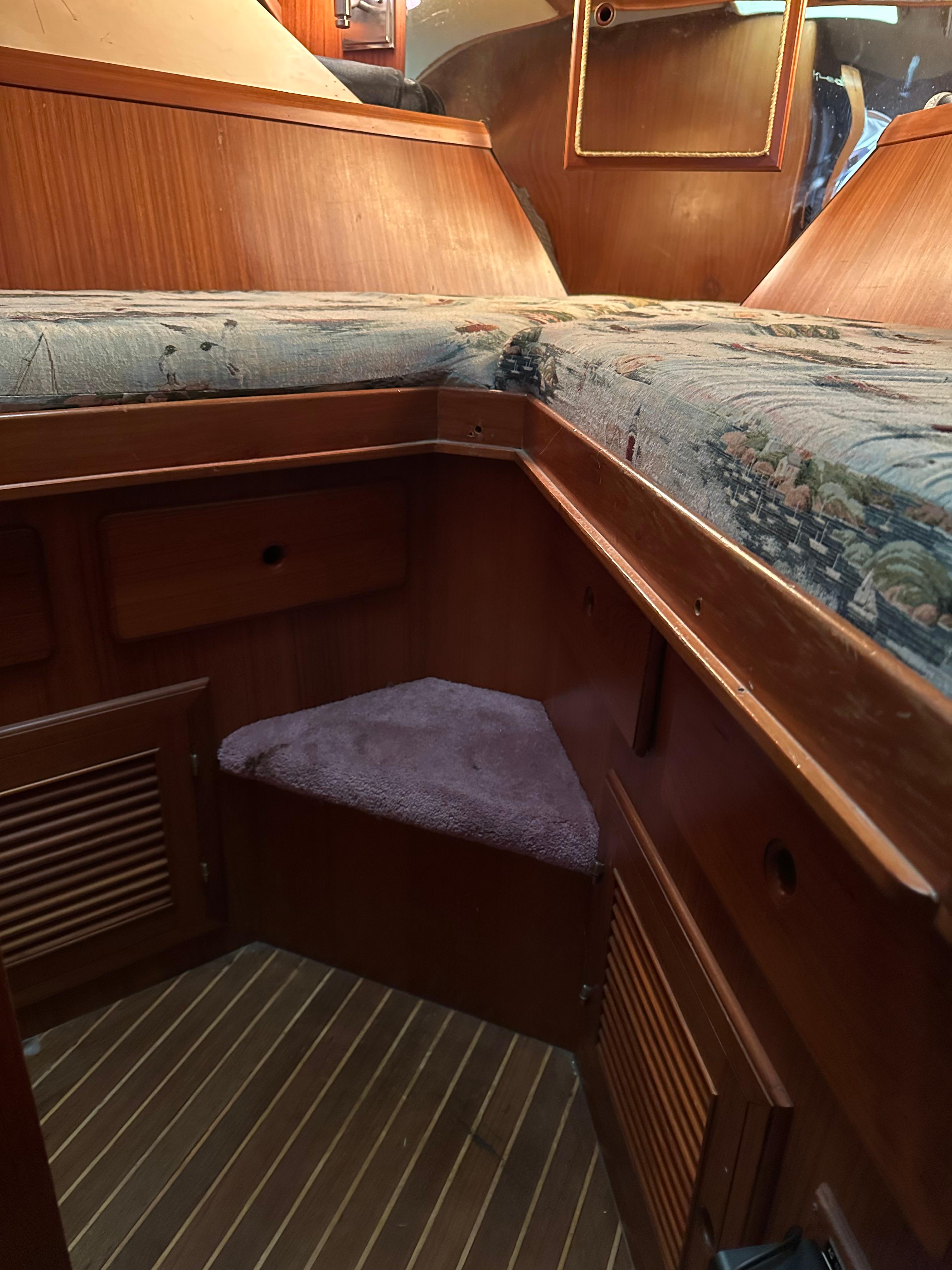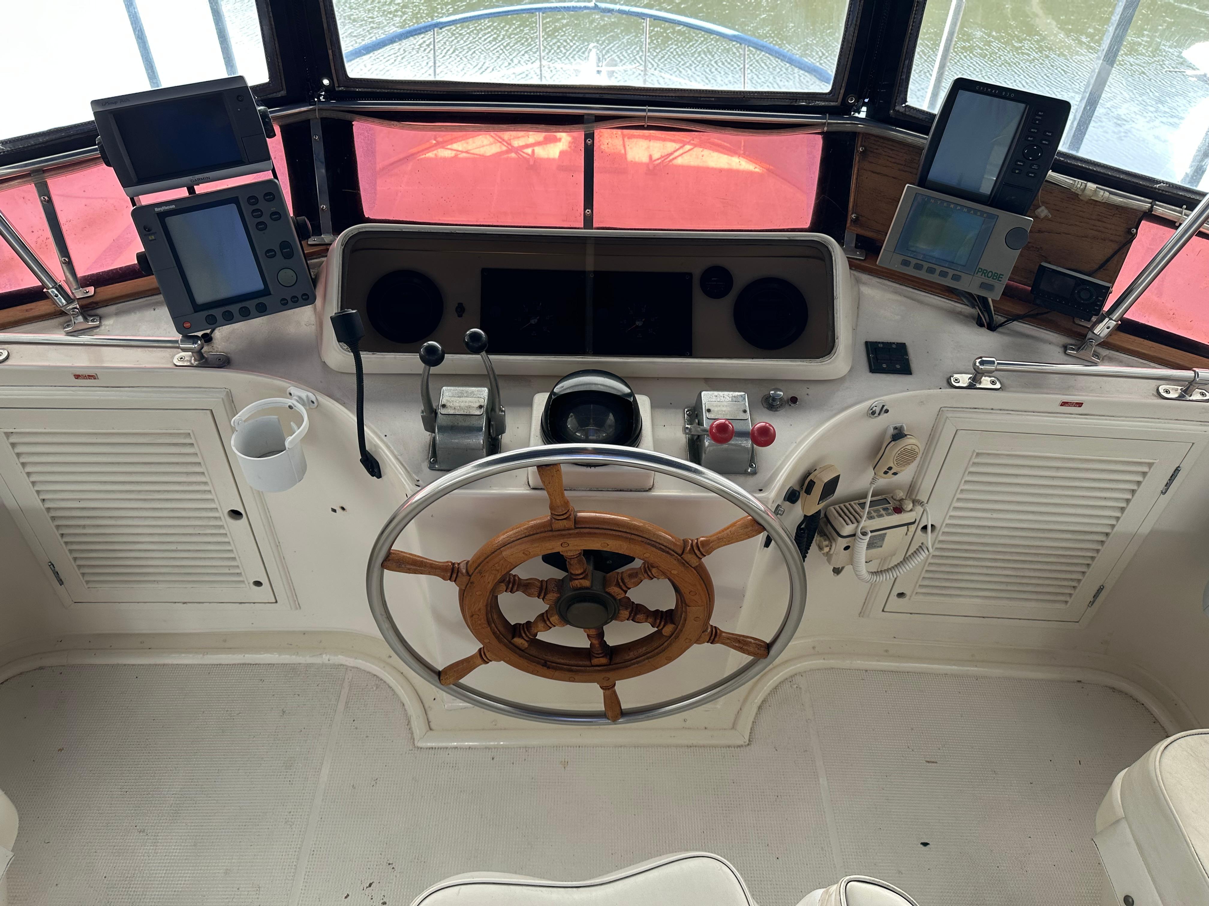 You enter the salon via two side entry doors or from the sundeck. The lower helm is on the starboard side and ‘recliner’ sofa is behind the helm area. On the port side is an L-shaped built in dinette area with a teak table. The U-shaped galley is forward and down on the port side w/entrance to the guest head/shower combo opposite. The guest cabin features a large vee berth . Aft of the salon is a very spacious master stateroom with a queen walk around bed and a lot of teak storage cabinets. The private master head has a tub shower.