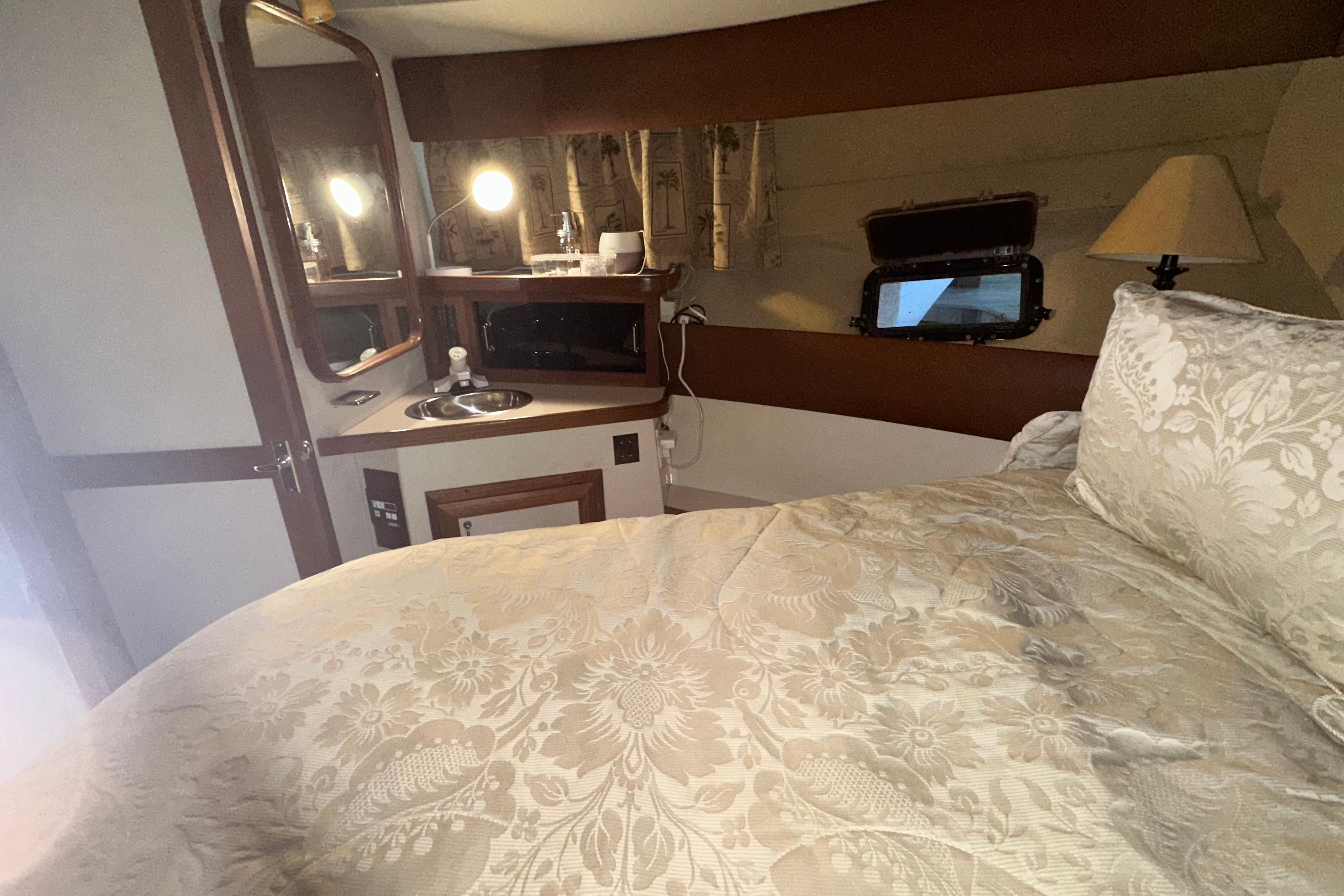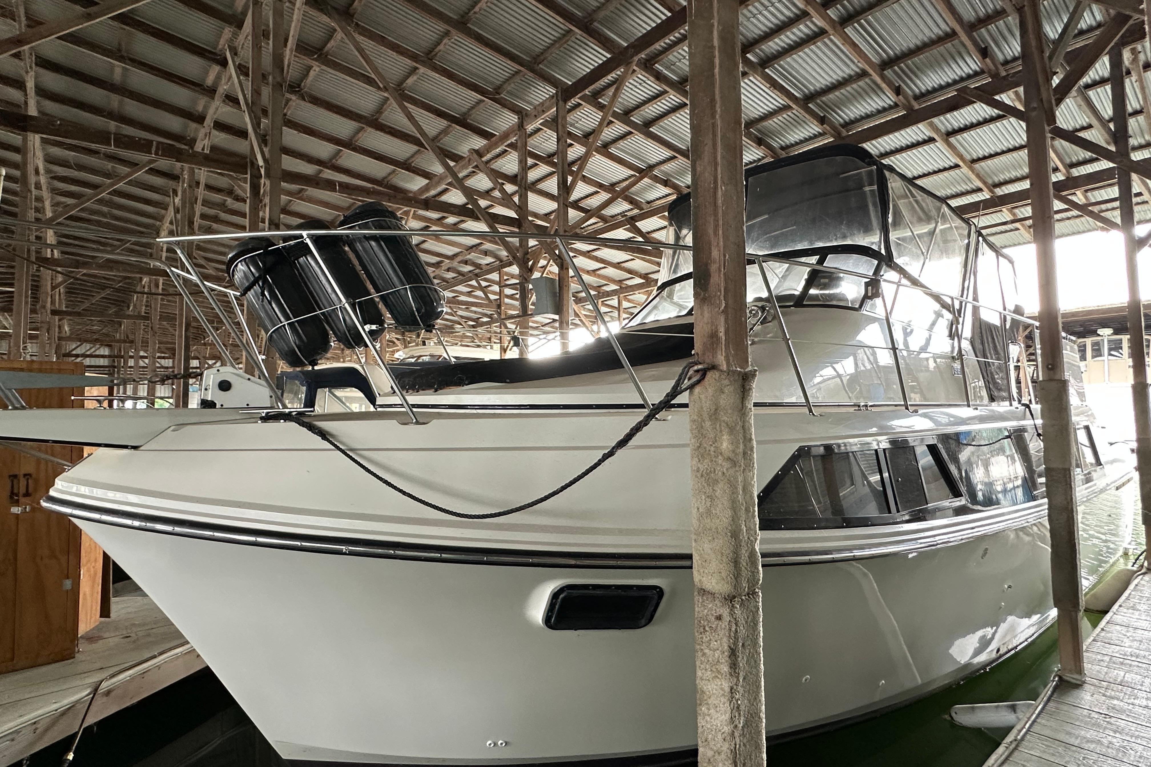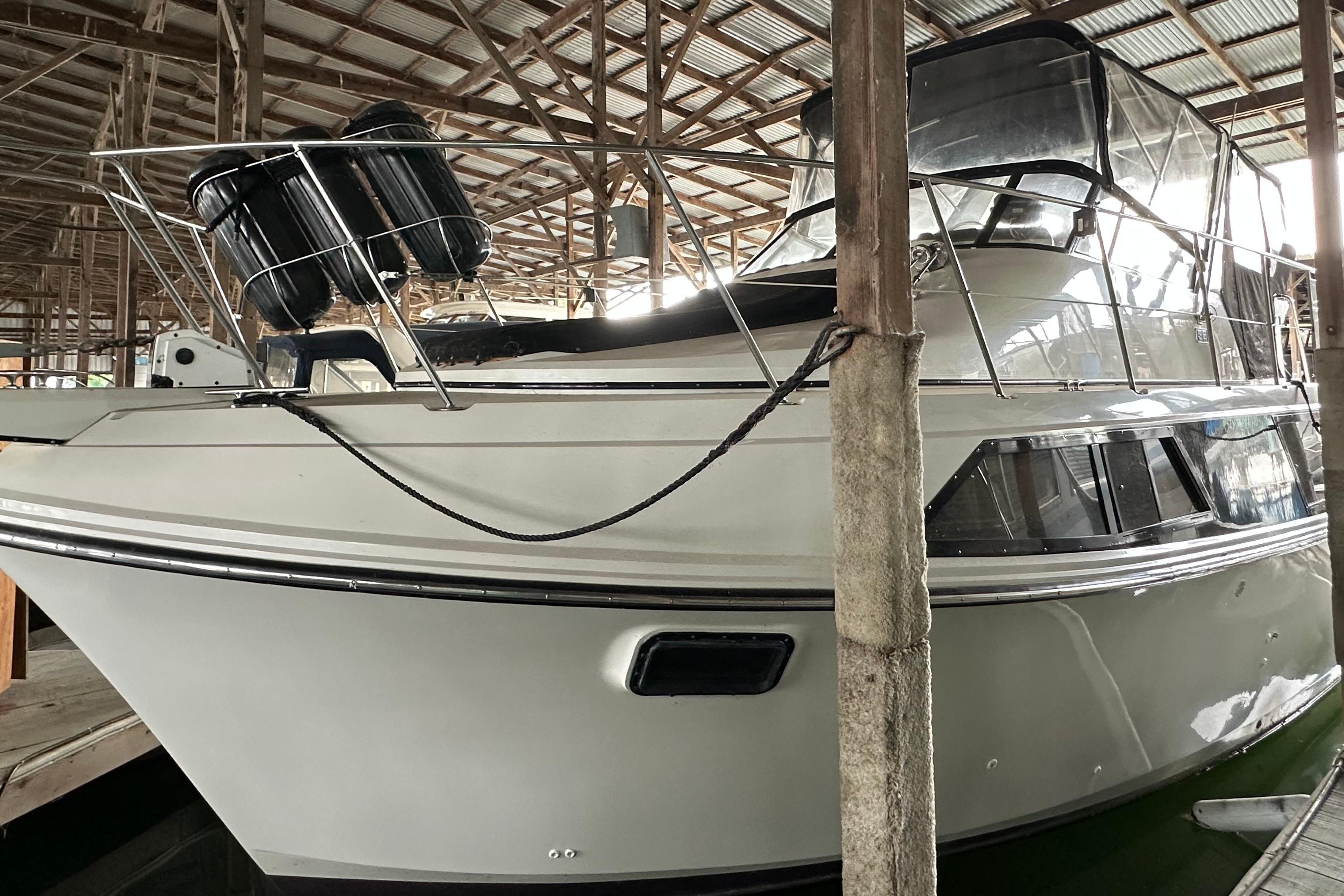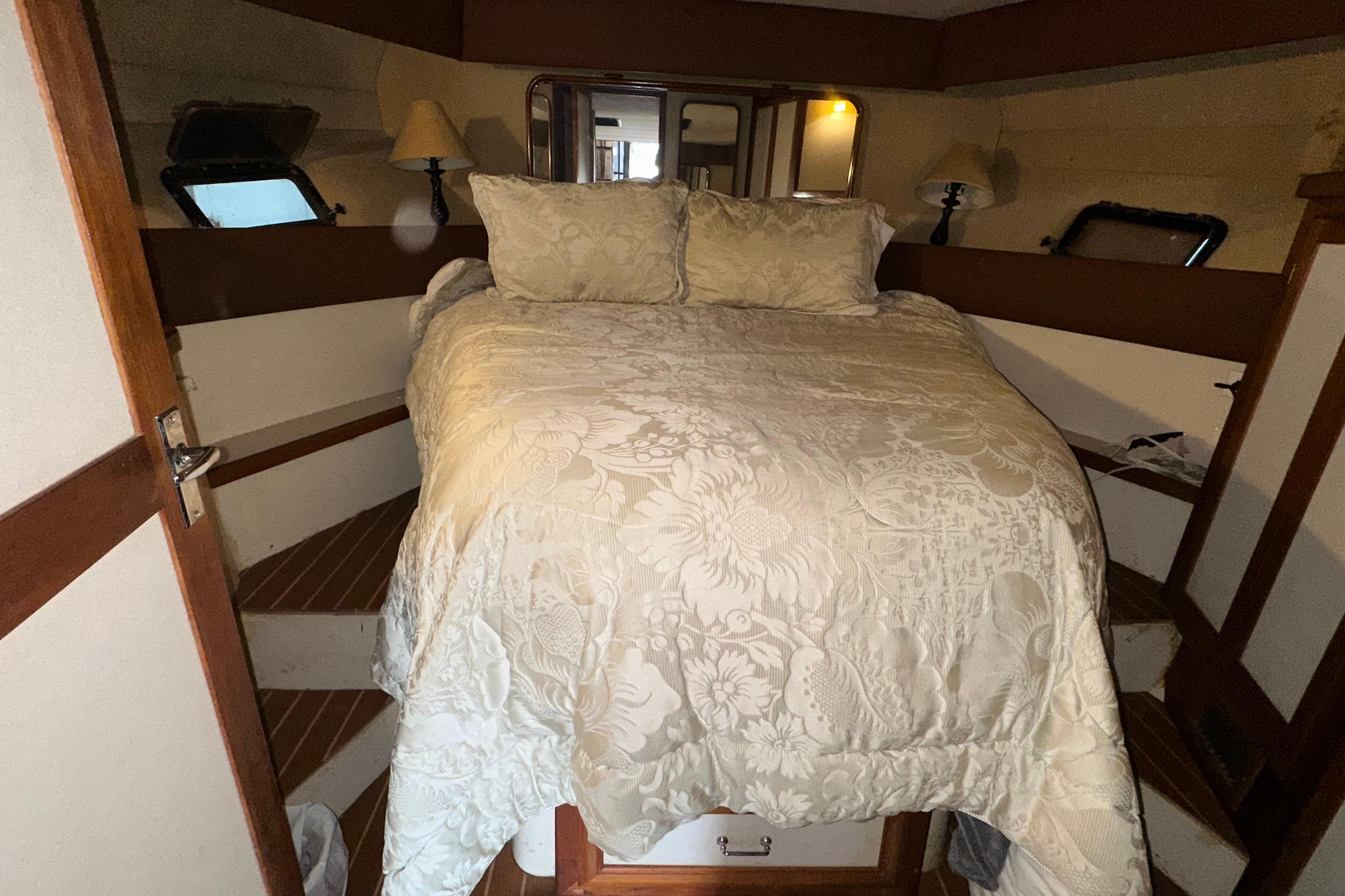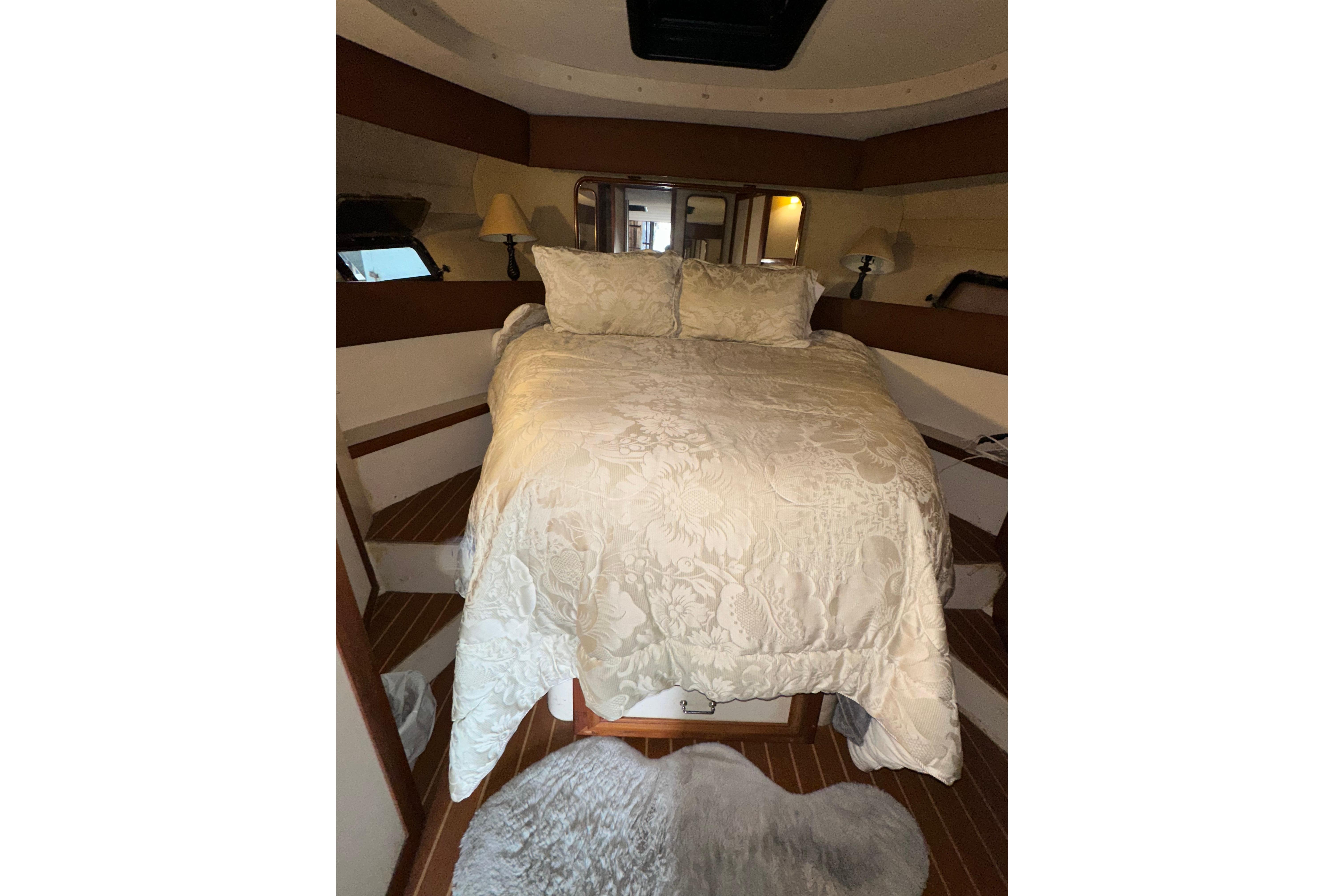 Popular Carver Mariner Flybridge Sedan – Tw. Crusader inboards & 7.5kw Generator. Roomy salon with natural light. Once inside the boat, via 2 steps from the cockpit, everything is on one level with salon & galley combined. Aft of the galley is the guest cabin w/twin bunks, hanging locker & storage, & large Jack ‘n Jill head & stall shower, opposite. The master stateroom in the forepeak has a semi walk around queen bed, a private entrance to the head/shower, & a vanity in the stateroom itself. Excellent storage throughout and the beautiful Flexi-teak flooring is easy to keep clean and gives this boat a modern look.