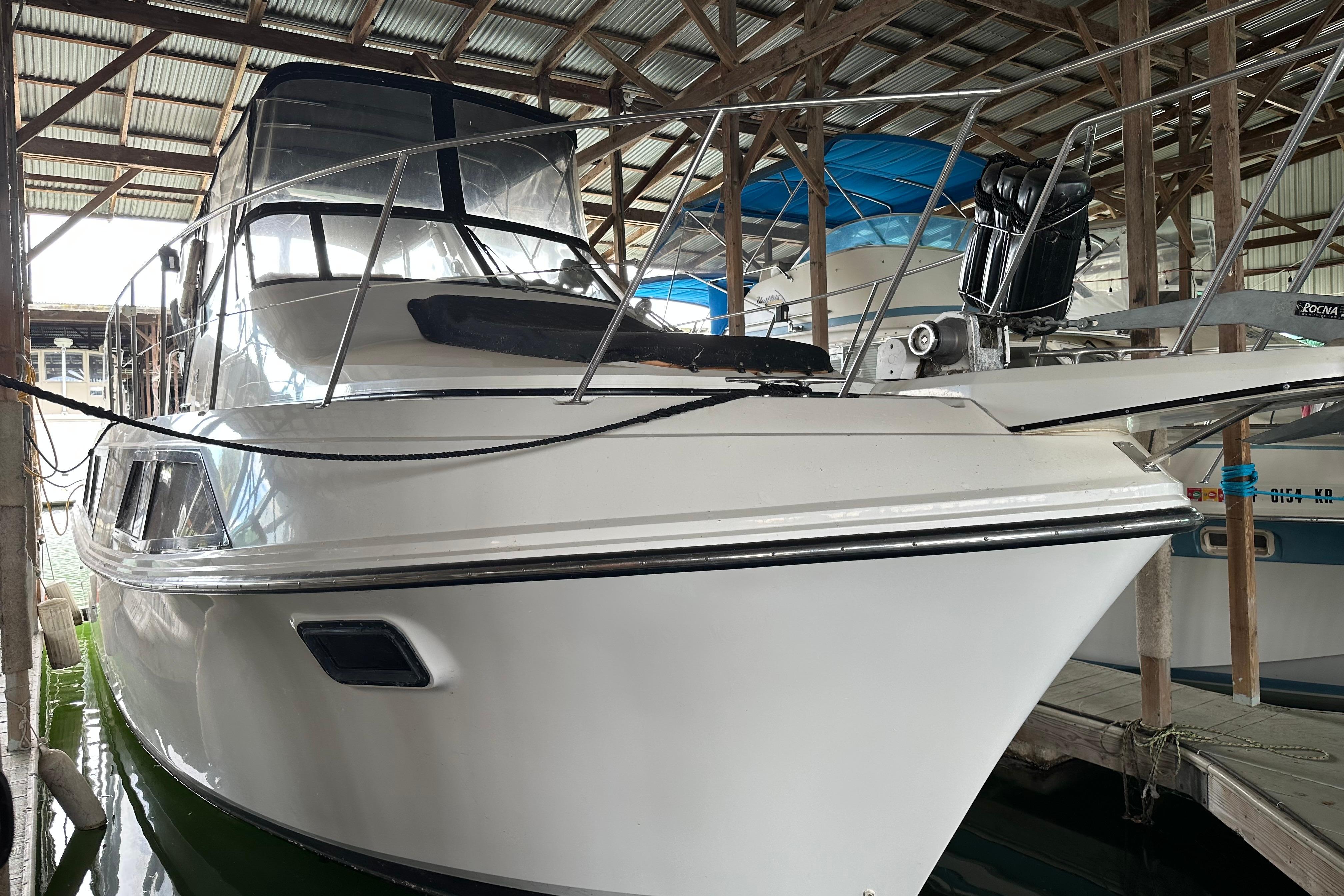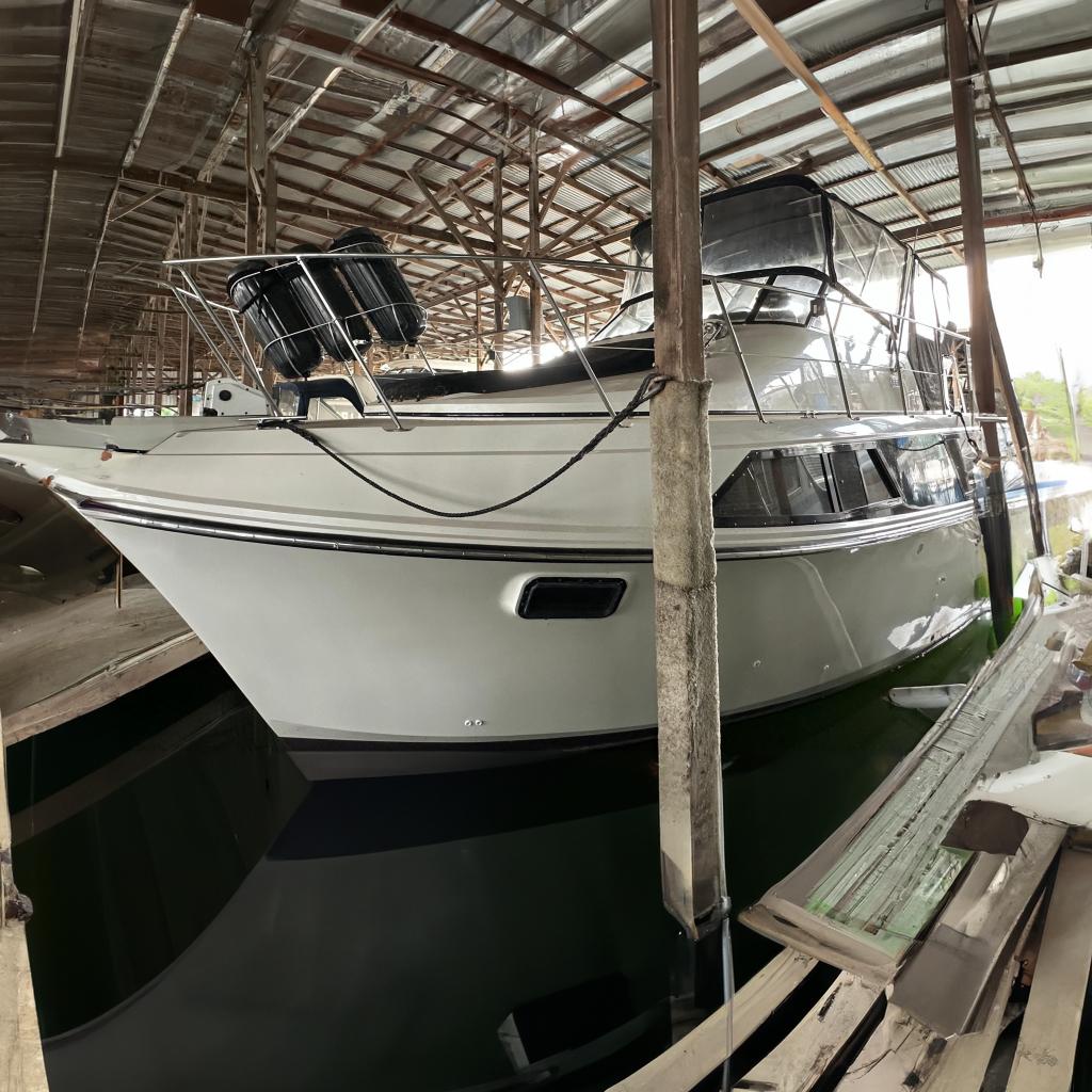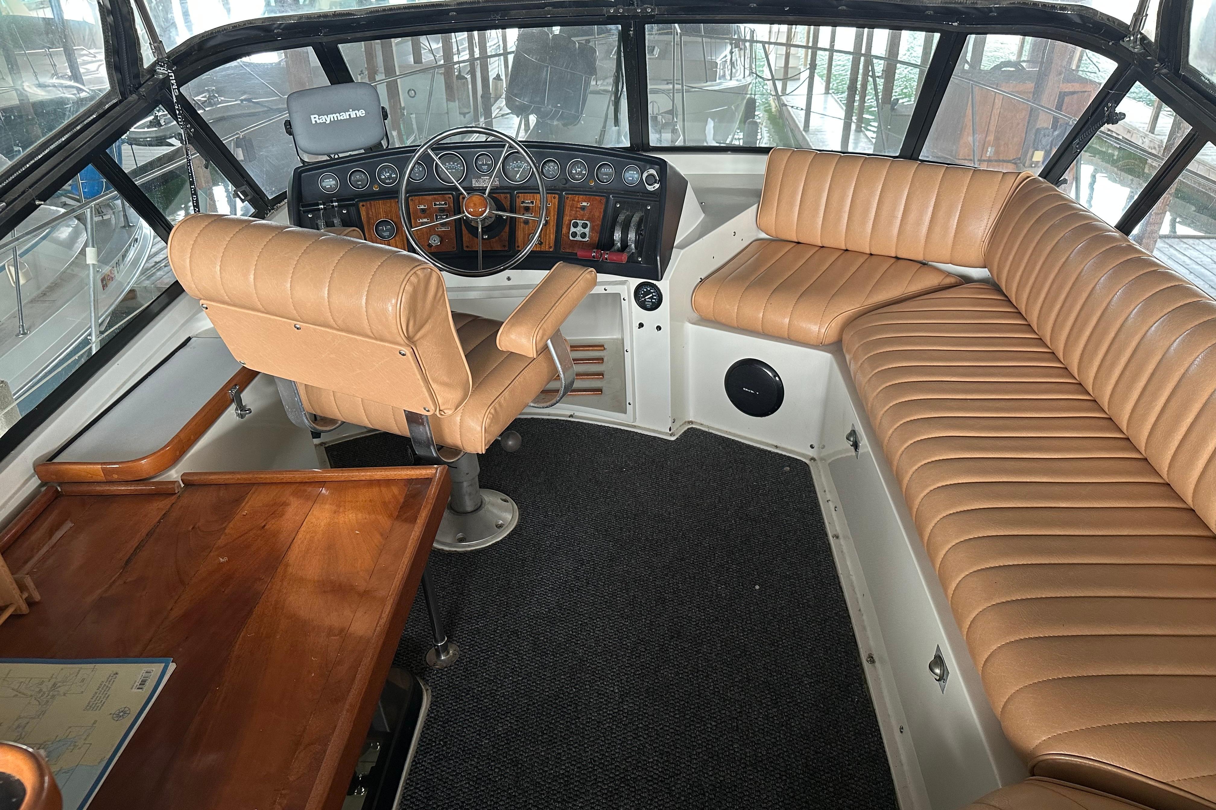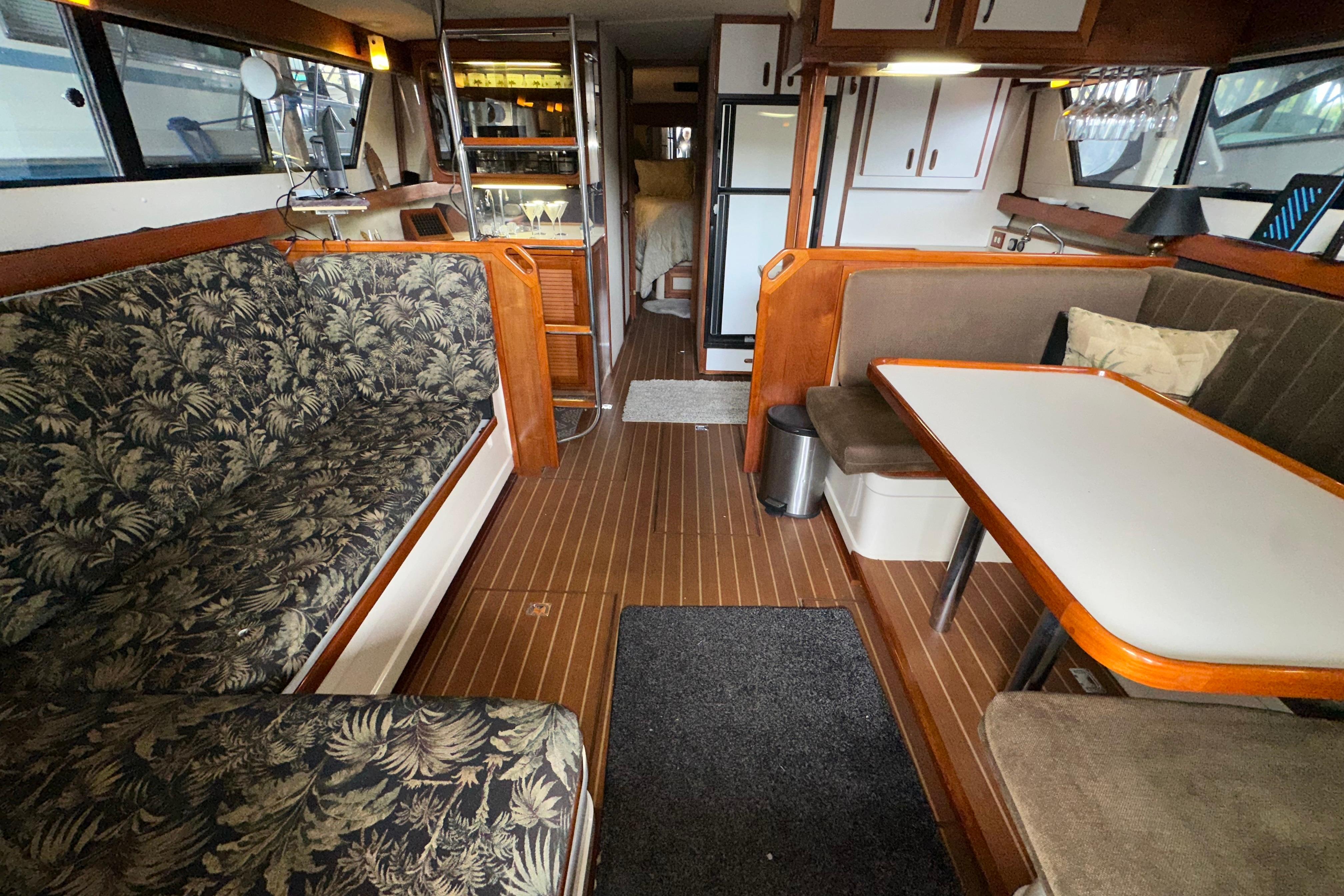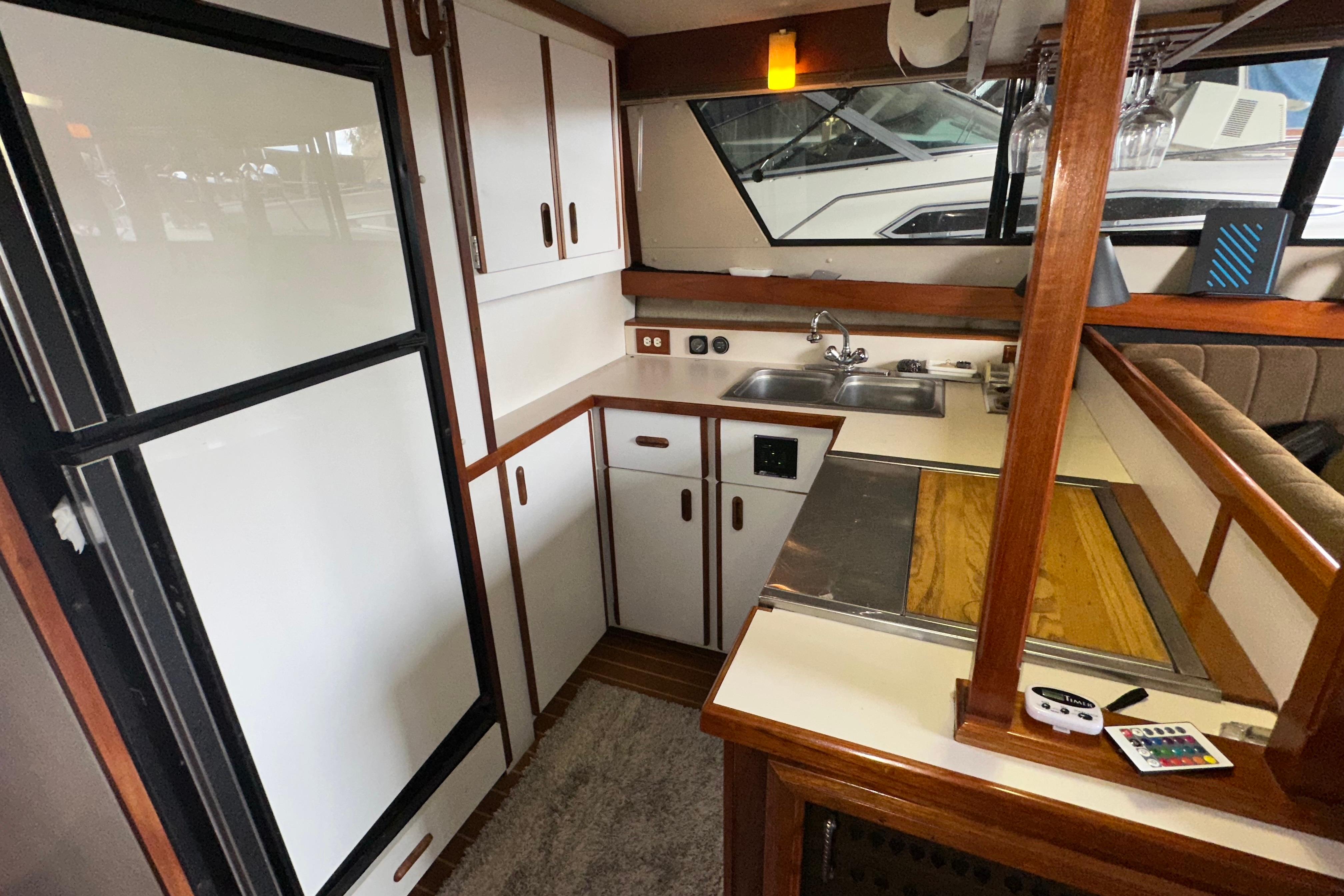 Popular Carver Mariner Flybridge Sedan – Tw. Crusader inboards & 7.5kw Generator. Roomy salon with natural light. Once inside the boat, via 2 steps from the cockpit, everything is on one level with salon & galley combined. Aft of the galley is the guest cabin w/twin bunks, hanging locker & storage, & large Jack ‘n Jill head & stall shower, opposite. The master stateroom in the forepeak has a semi walk around queen bed, a private entrance to the head/shower, & a vanity in the stateroom itself. Excellent storage throughout and the beautiful Flexi-teak flooring is easy to keep clean and gives this boat a modern look.