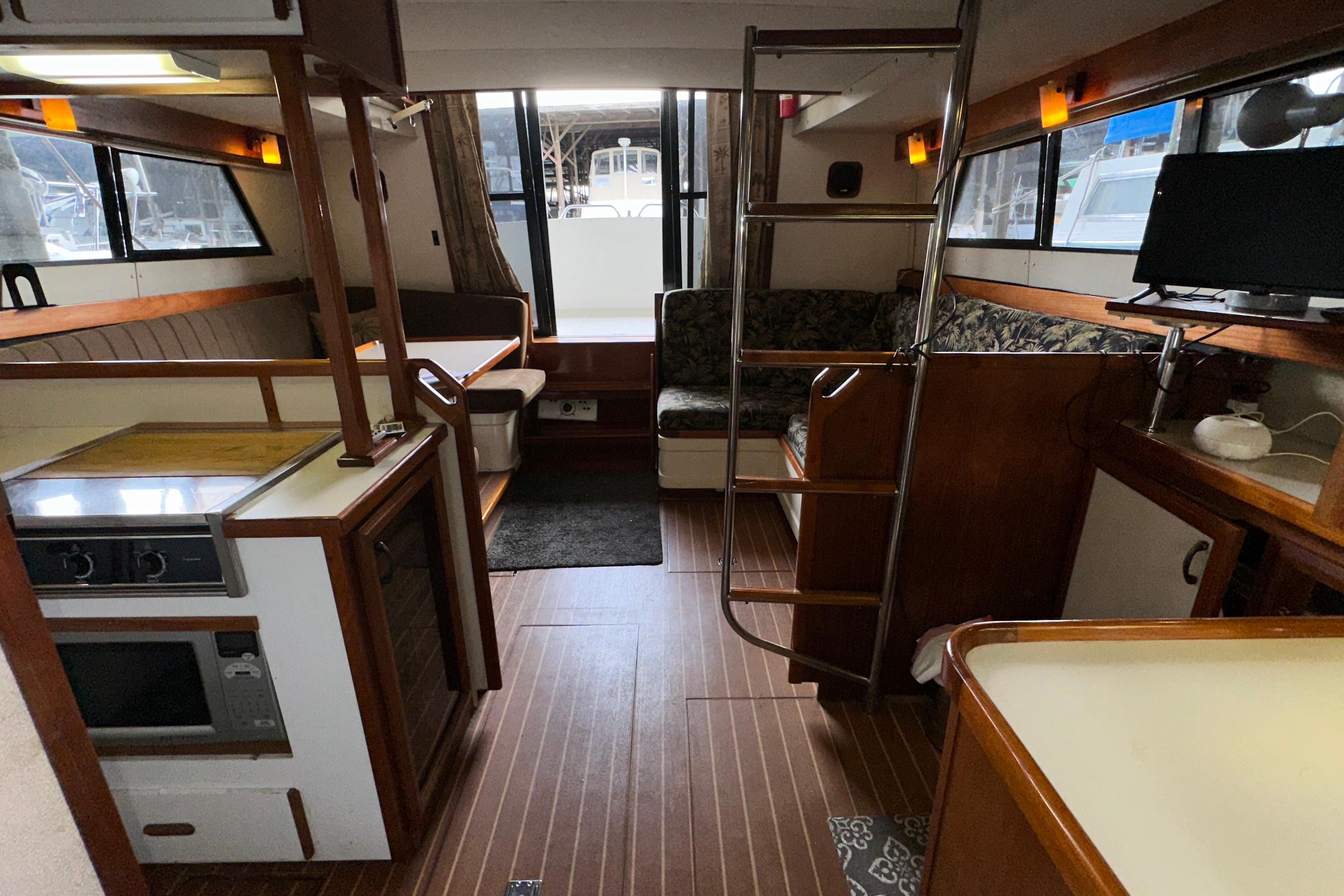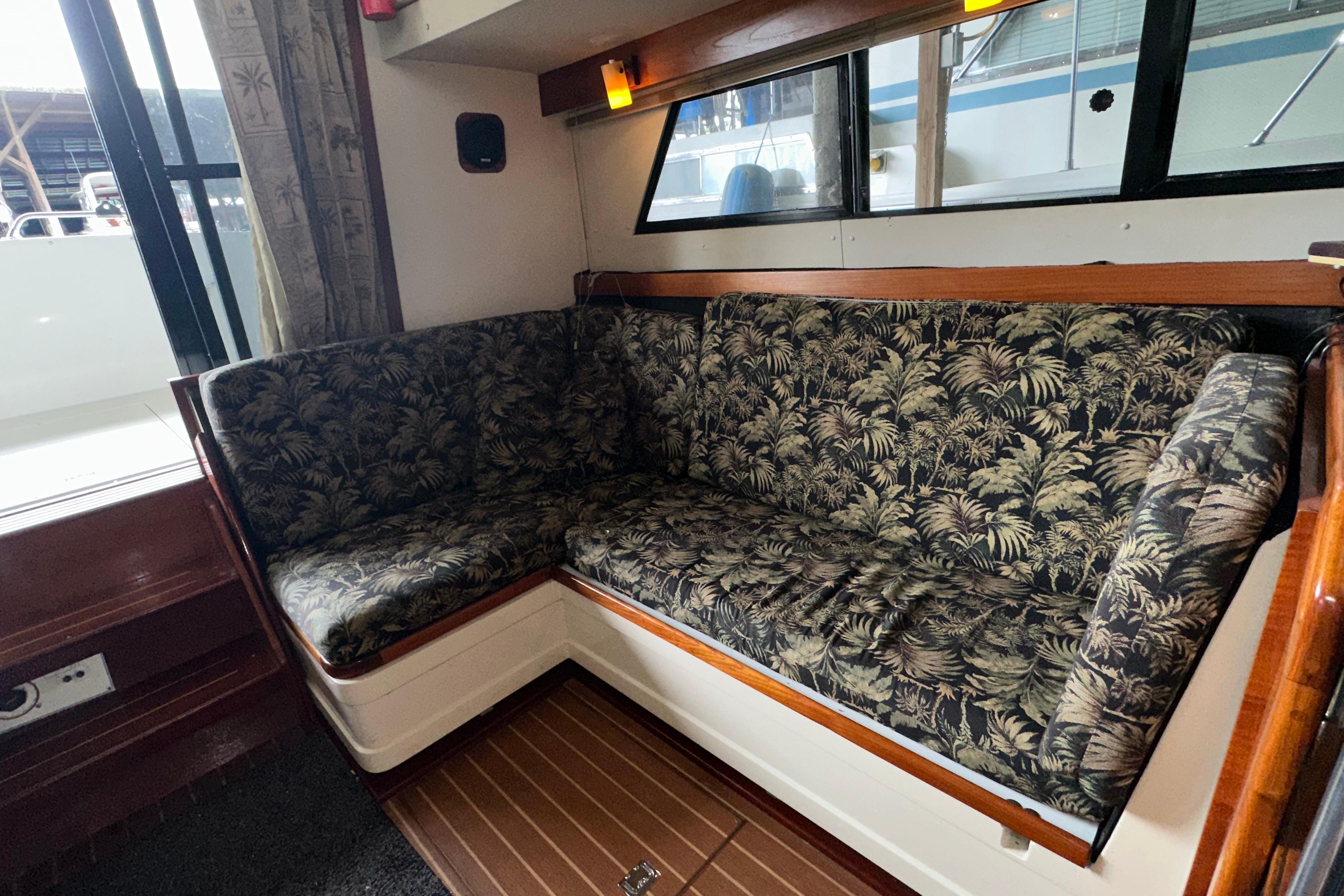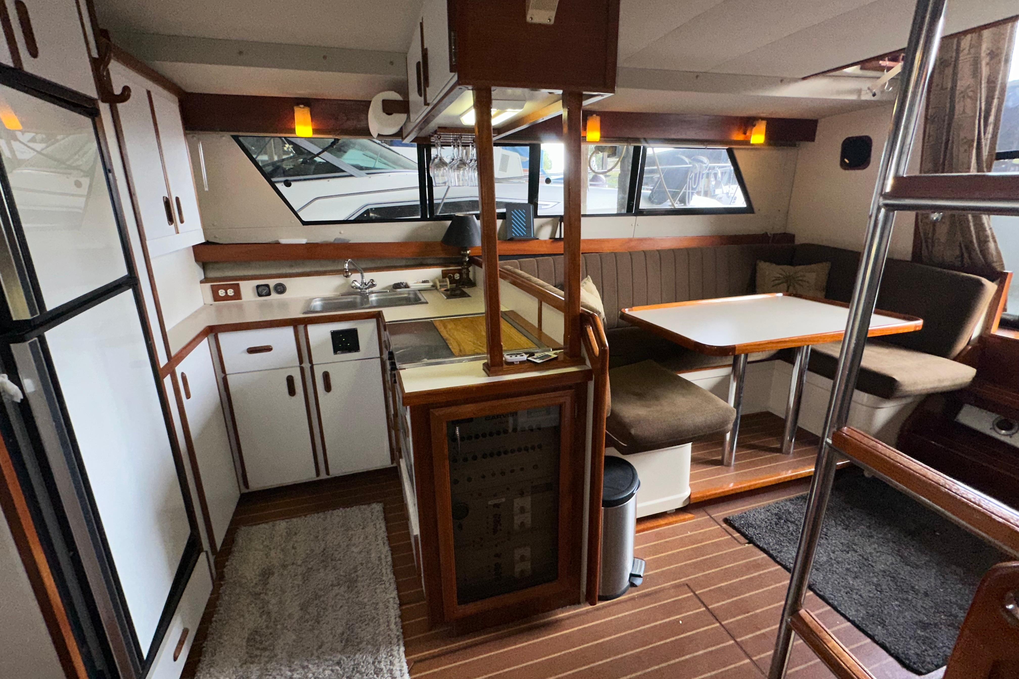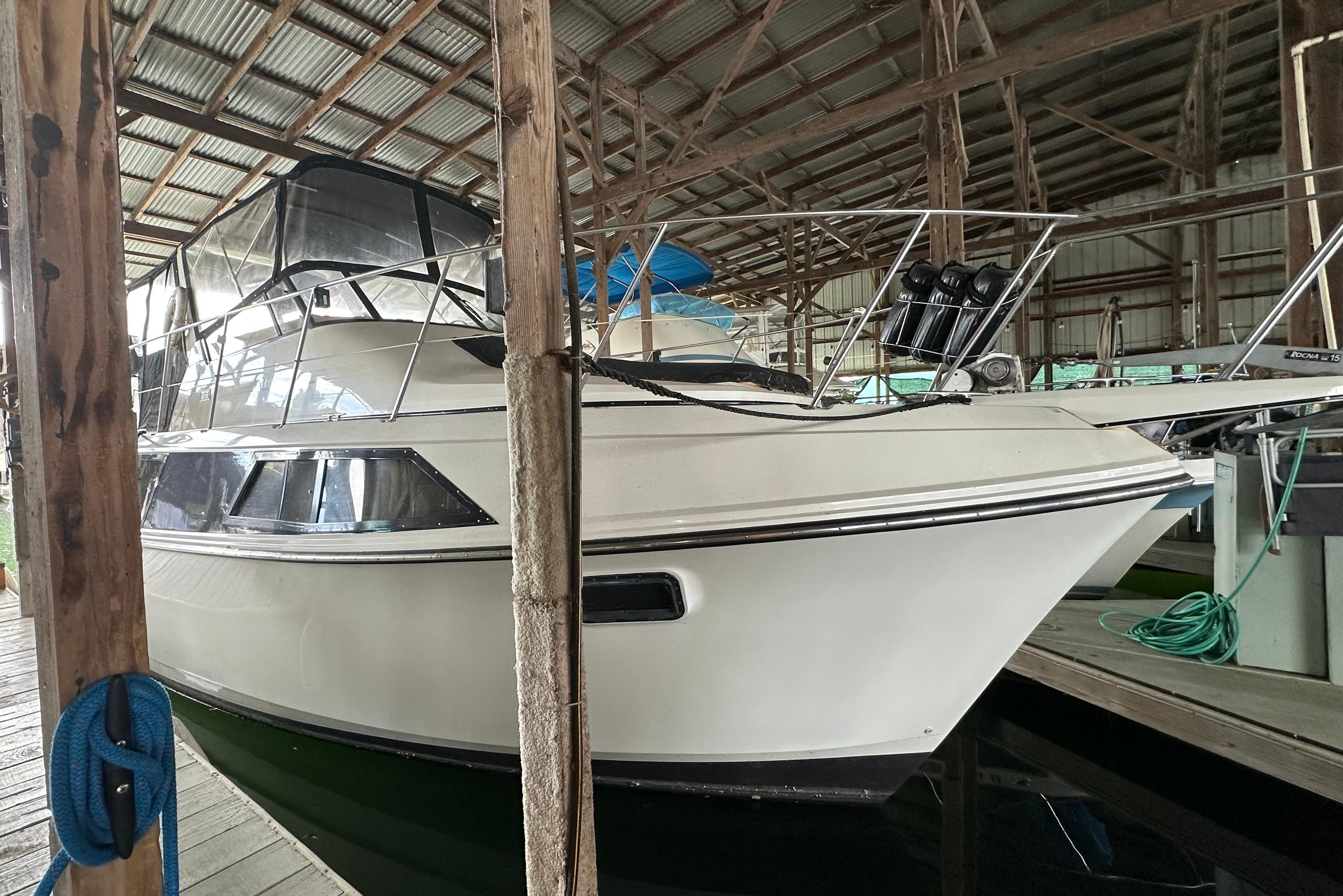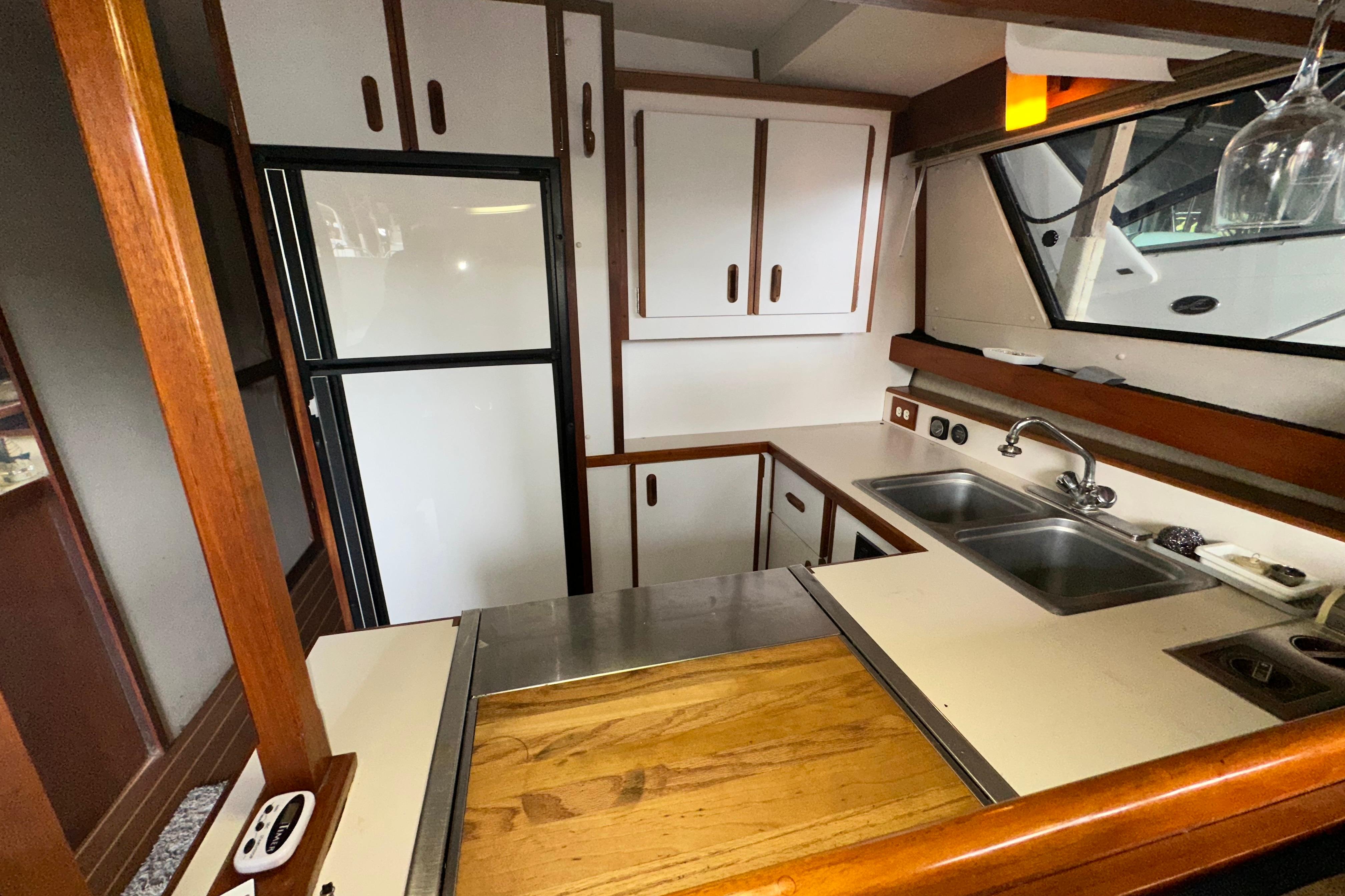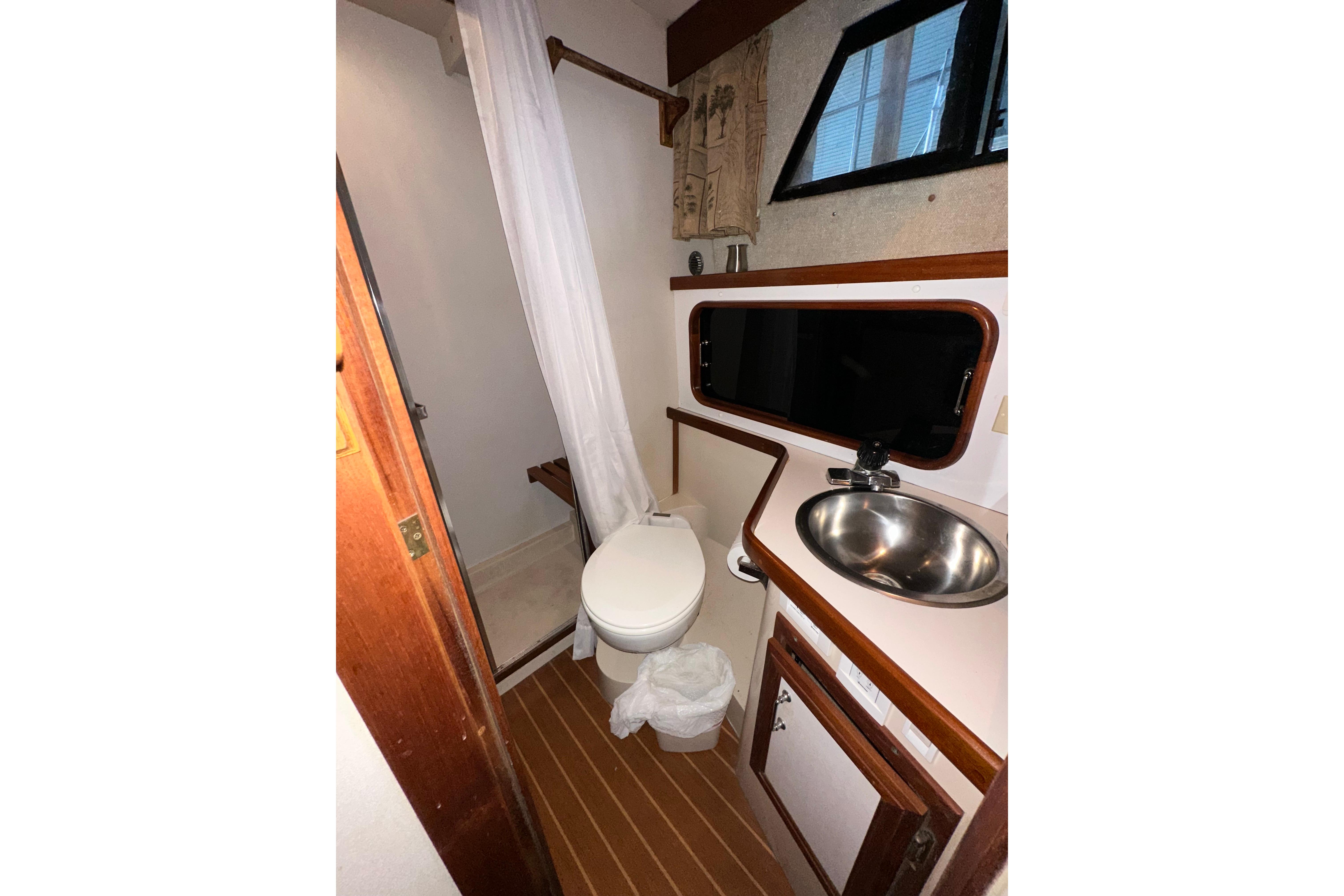 Popular Carver Mariner Flybridge Sedan – Tw. Crusader inboards & 7.5kw Generator. Roomy salon with natural light. Once inside the boat, via 2 steps from the cockpit, everything is on one level with salon & galley combined. Aft of the galley is the guest cabin w/twin bunks, hanging locker & storage, & large Jack ‘n Jill head & stall shower, opposite. The master stateroom in the forepeak has a semi walk around queen bed, a private entrance to the head/shower, & a vanity in the stateroom itself. Excellent storage throughout and the beautiful Flexi-teak flooring is easy to keep clean and gives this boat a modern look.