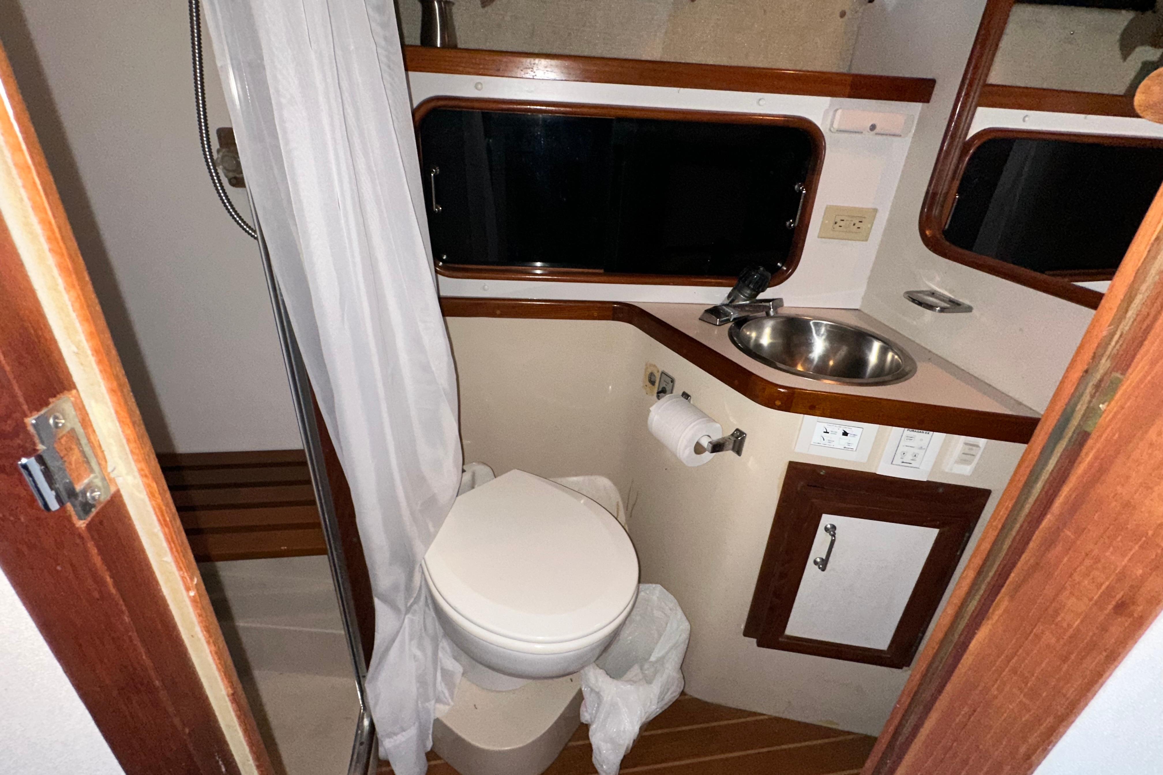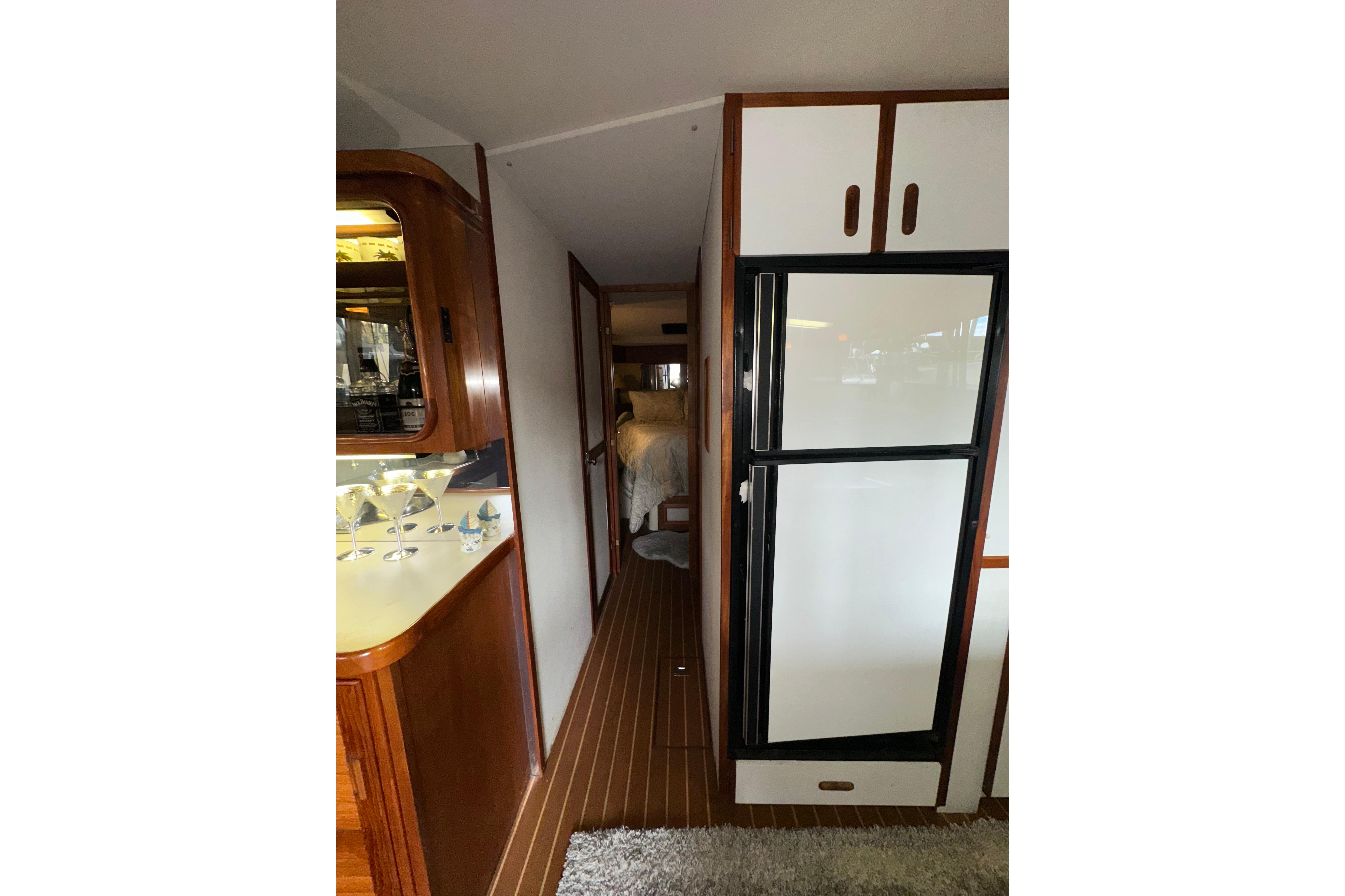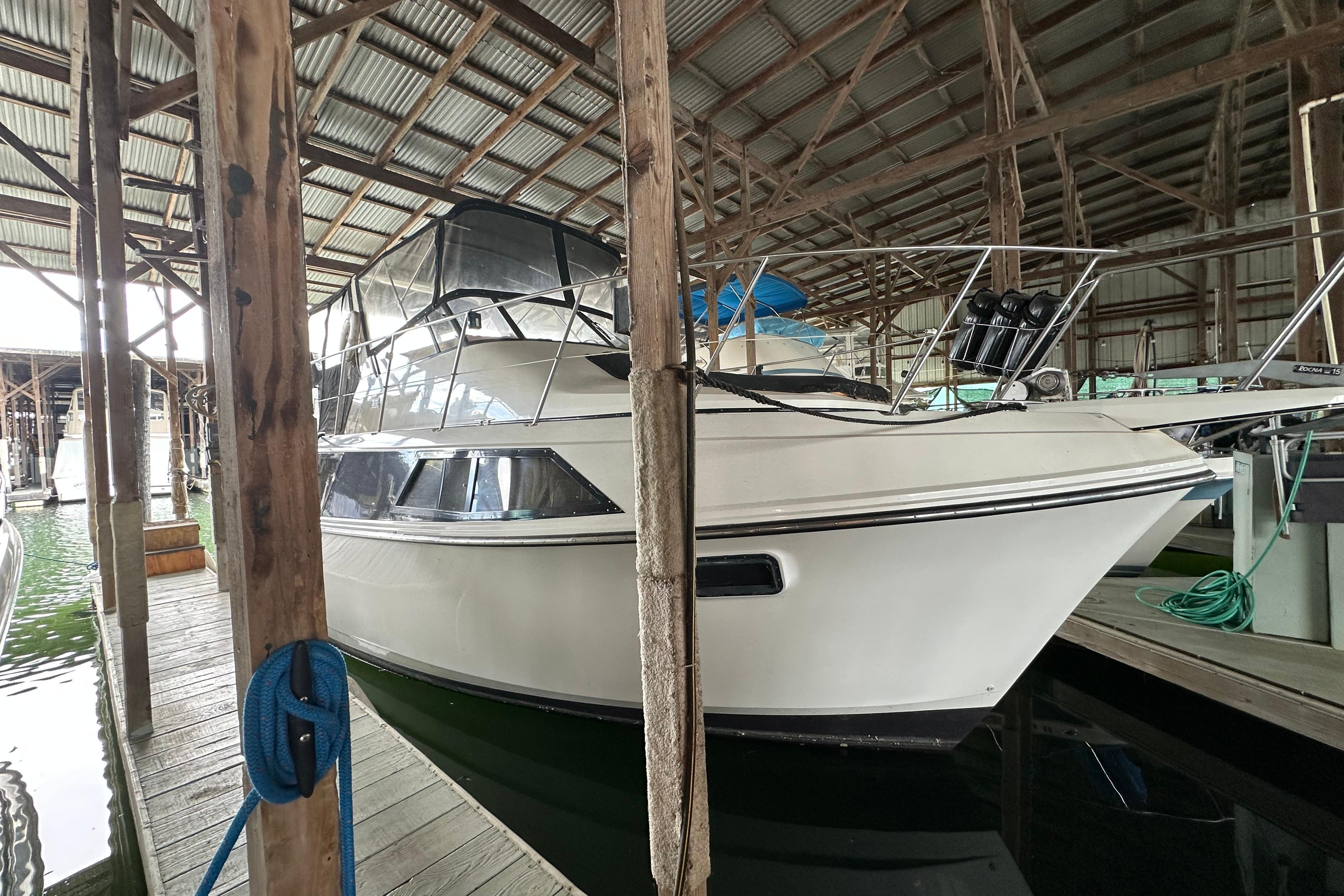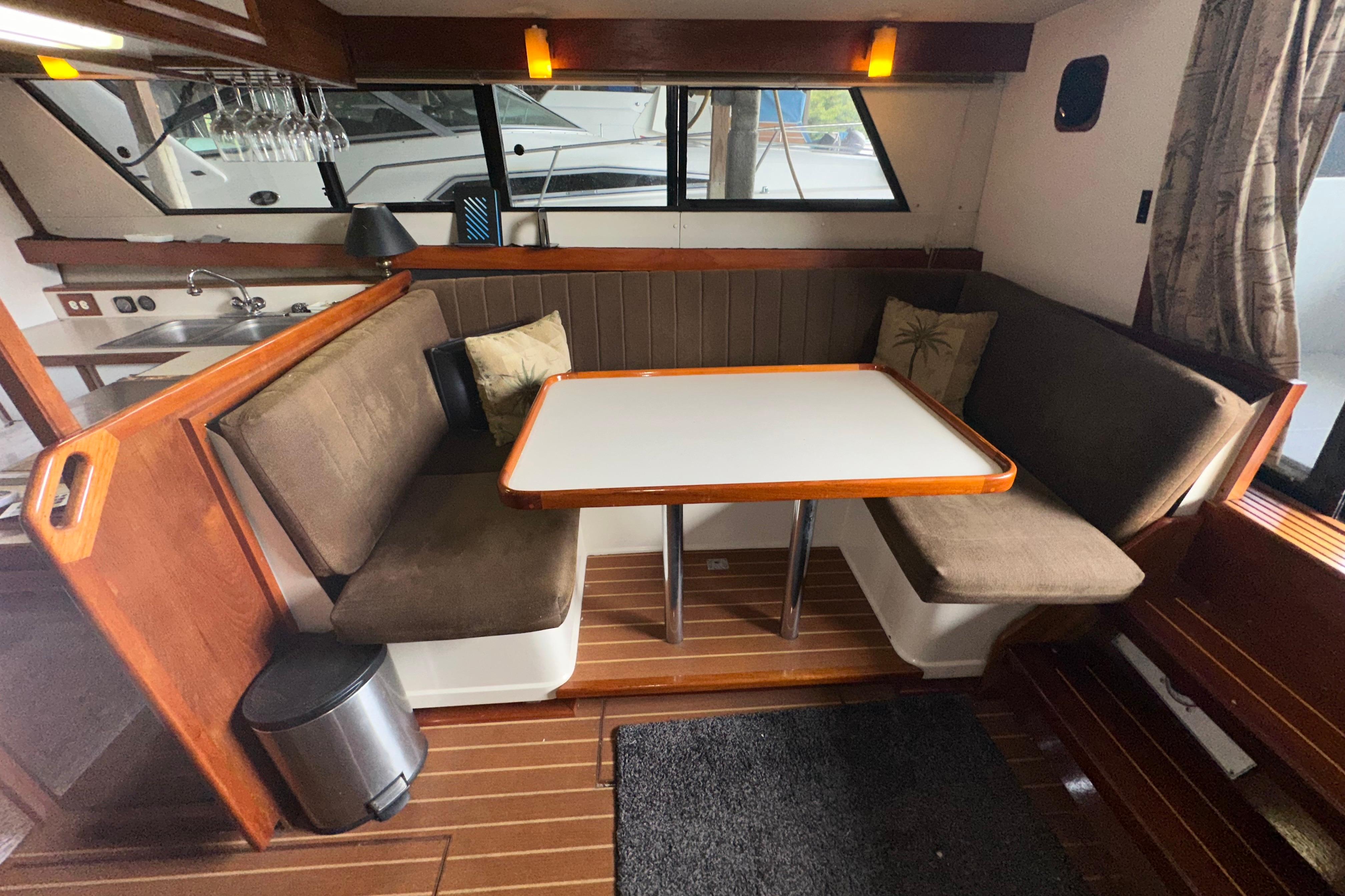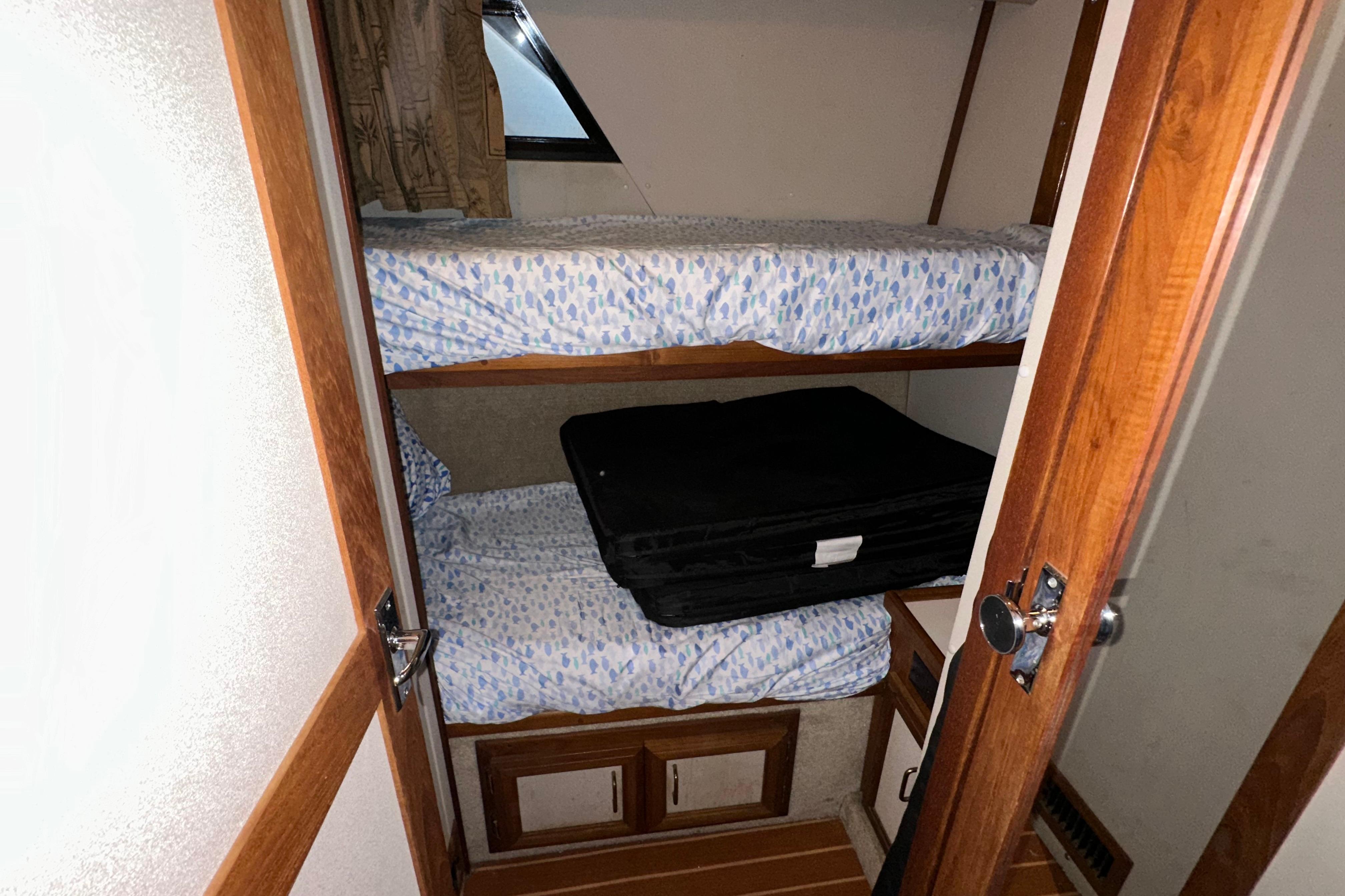 Popular Carver Mariner Flybridge Sedan – Tw. Crusader inboards & 7.5kw Generator. Roomy salon with natural light. Once inside the boat, via 2 steps from the cockpit, everything is on one level with salon & galley combined. Aft of the galley is the guest cabin w/twin bunks, hanging locker & storage, & large Jack ‘n Jill head & stall shower, opposite. The master stateroom in the forepeak has a semi walk around queen bed, a private entrance to the head/shower, & a vanity in the stateroom itself. Excellent storage throughout and the beautiful Flexi-teak flooring is easy to keep clean and gives this boat a modern look.