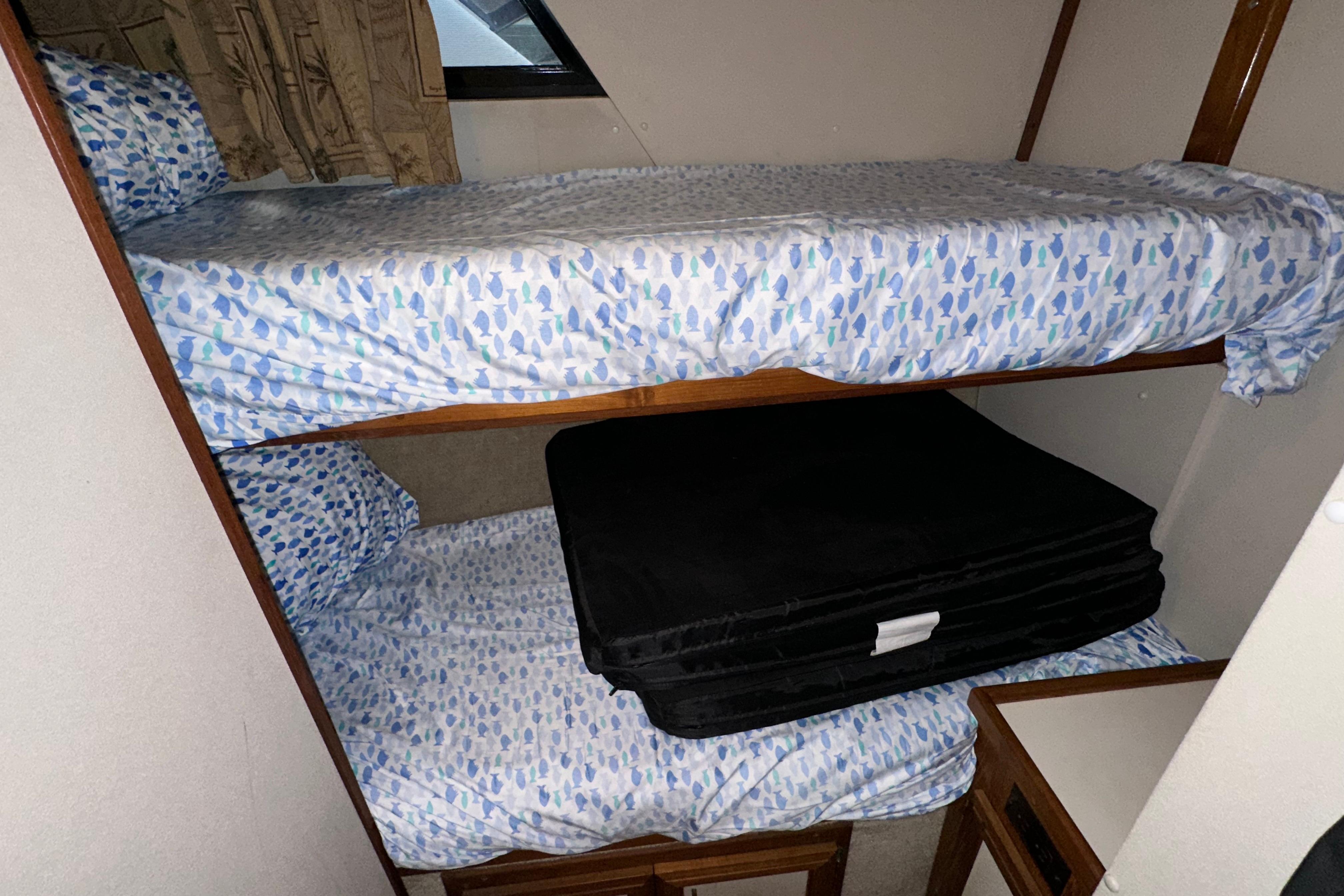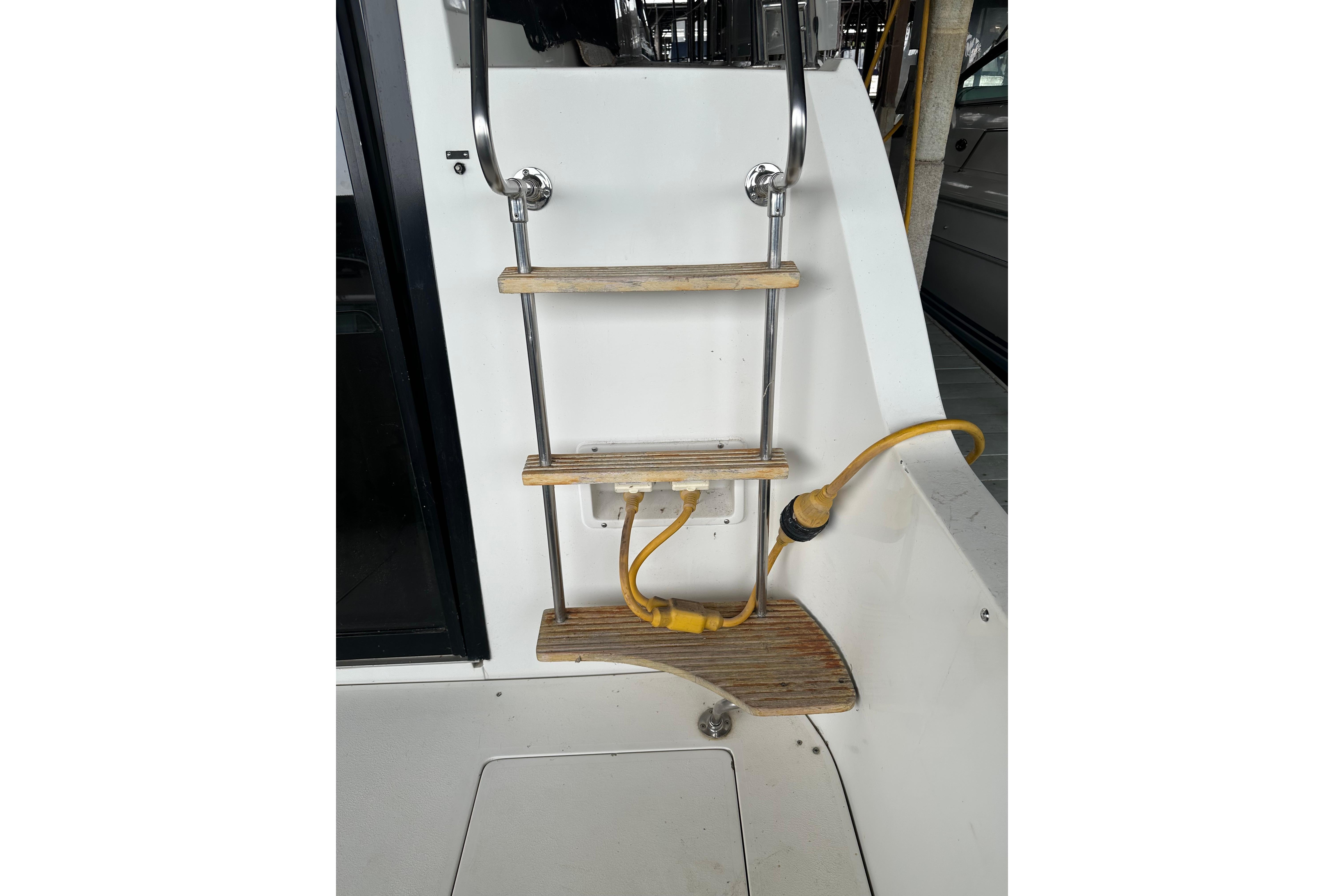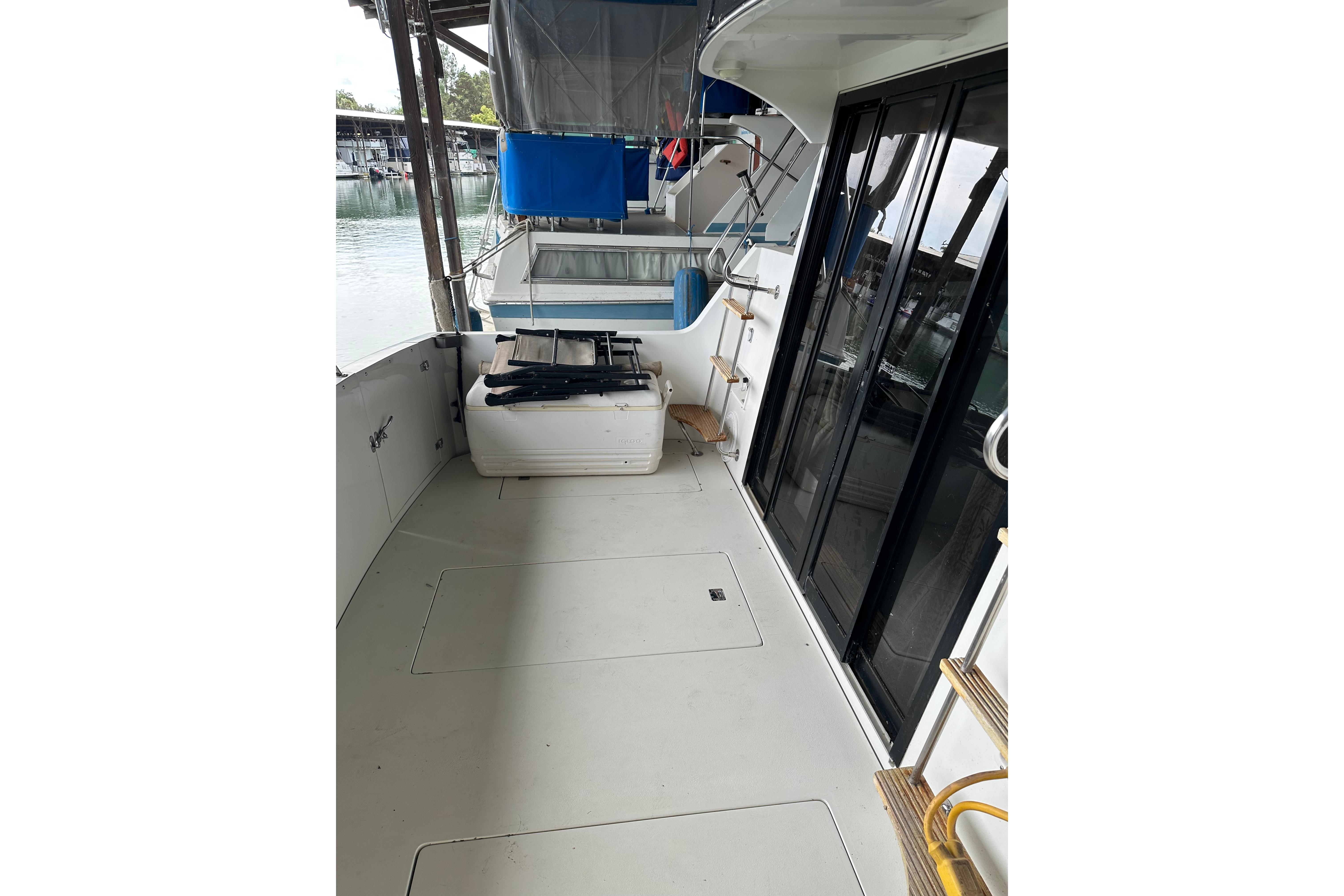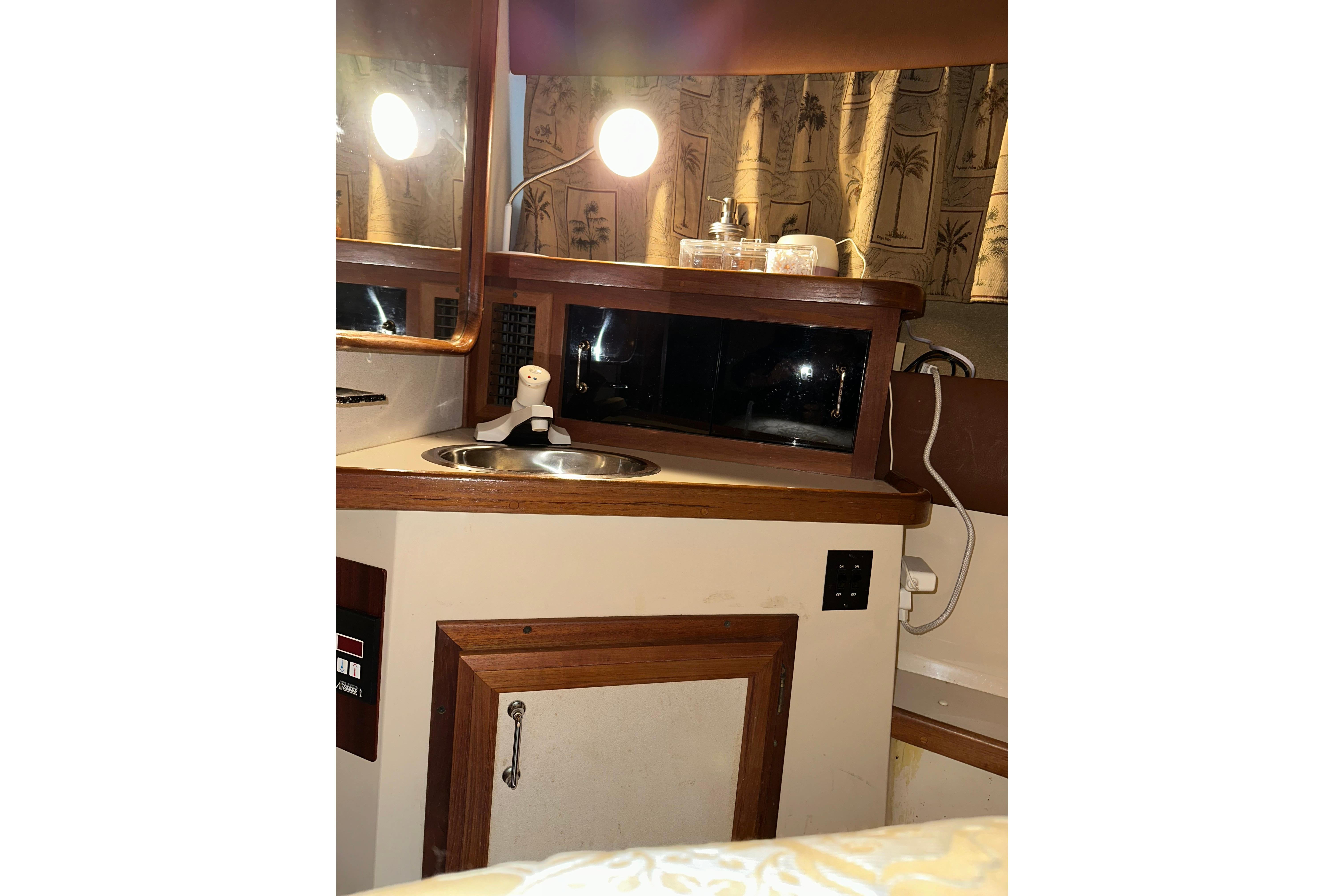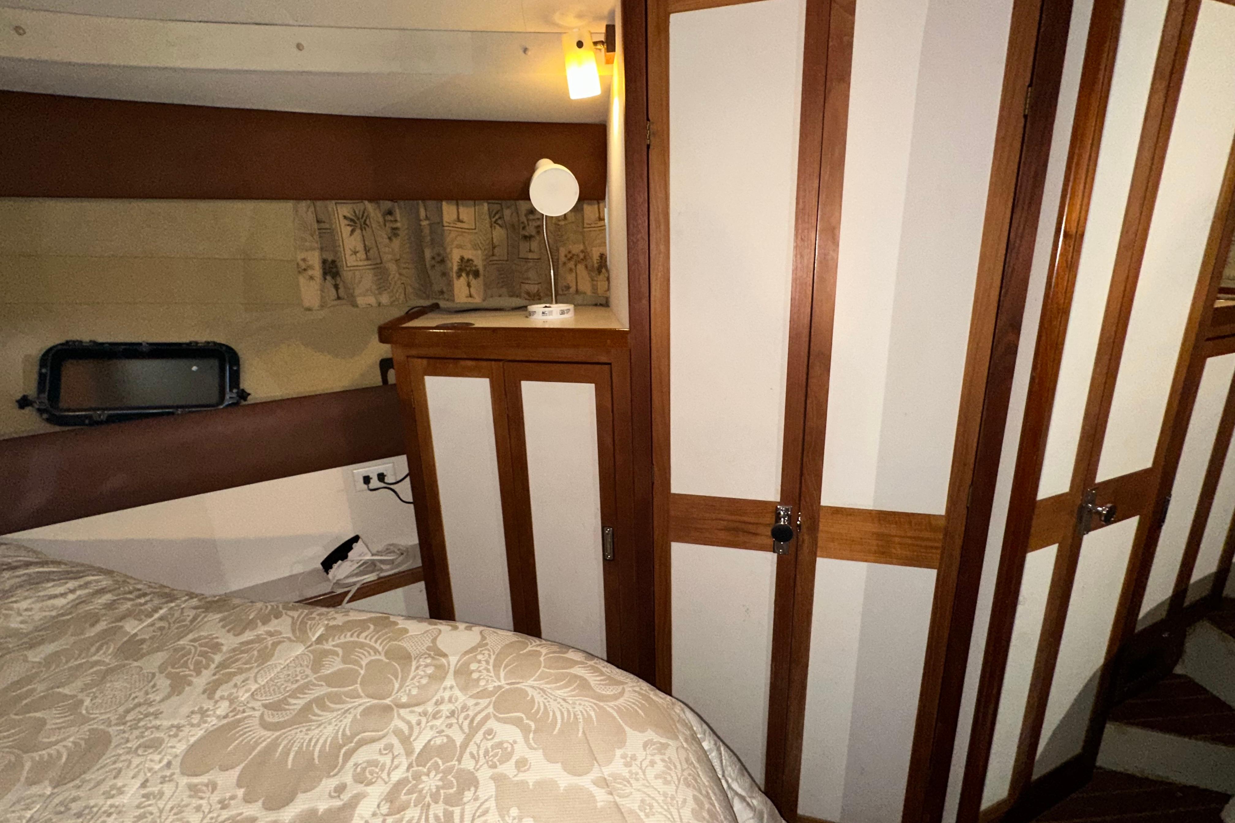 Popular Carver Mariner Flybridge Sedan – Tw. Crusader inboards & 7.5kw Generator. Roomy salon with natural light. Once inside the boat, via 2 steps from the cockpit, everything is on one level with salon & galley combined. Aft of the galley is the guest cabin w/twin bunks, hanging locker & storage, & large Jack ‘n Jill head & stall shower, opposite. The master stateroom in the forepeak has a semi walk around queen bed, a private entrance to the head/shower, & a vanity in the stateroom itself. Excellent storage throughout and the beautiful Flexi-teak flooring is easy to keep clean and gives this boat a modern look.