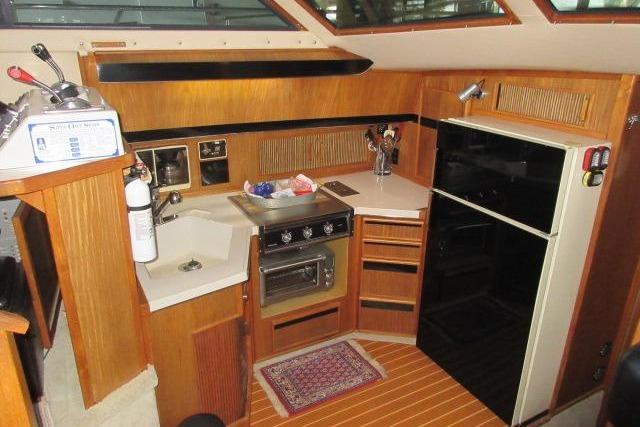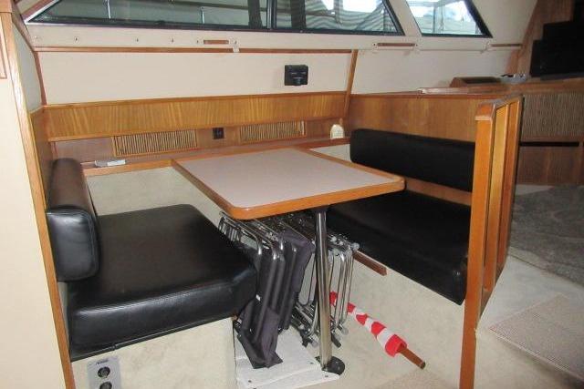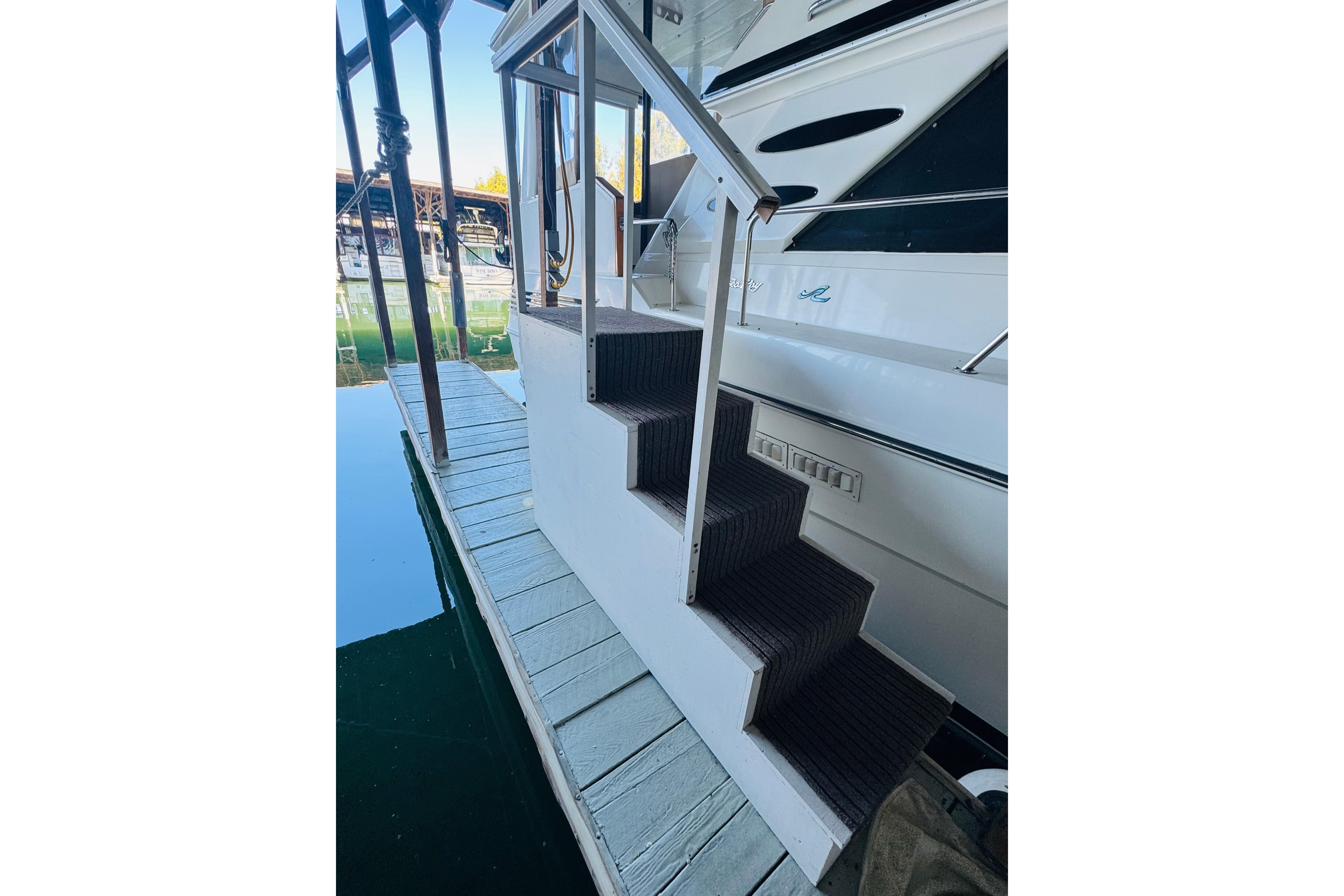This Sea Ray 415 Aft Cabin features a large sundeck with hardtop and solid wing doors. Both the sundeck and flybridge have full canvas and isinglass enclosures. The salon and cabins were updated with fresh carpet in 2018 and the galley with teak and holly flooring. She features two staterooms and two heads, each with stall showers. The main stateroom is aft and has a queen walk-around bed, abundant cabinetry, including vanity and the en suite head has a separate stall shower. Forward of the main salon is the fully equipped galley to port, guest head to starboard and VIP stateroom forward. Additionally, three heat / AC units (semi-operational), central vacuum and an abundance of storage cabinets. Twin gas Mercruiser 7.4 Liter engines with 930 hours reported on meters.