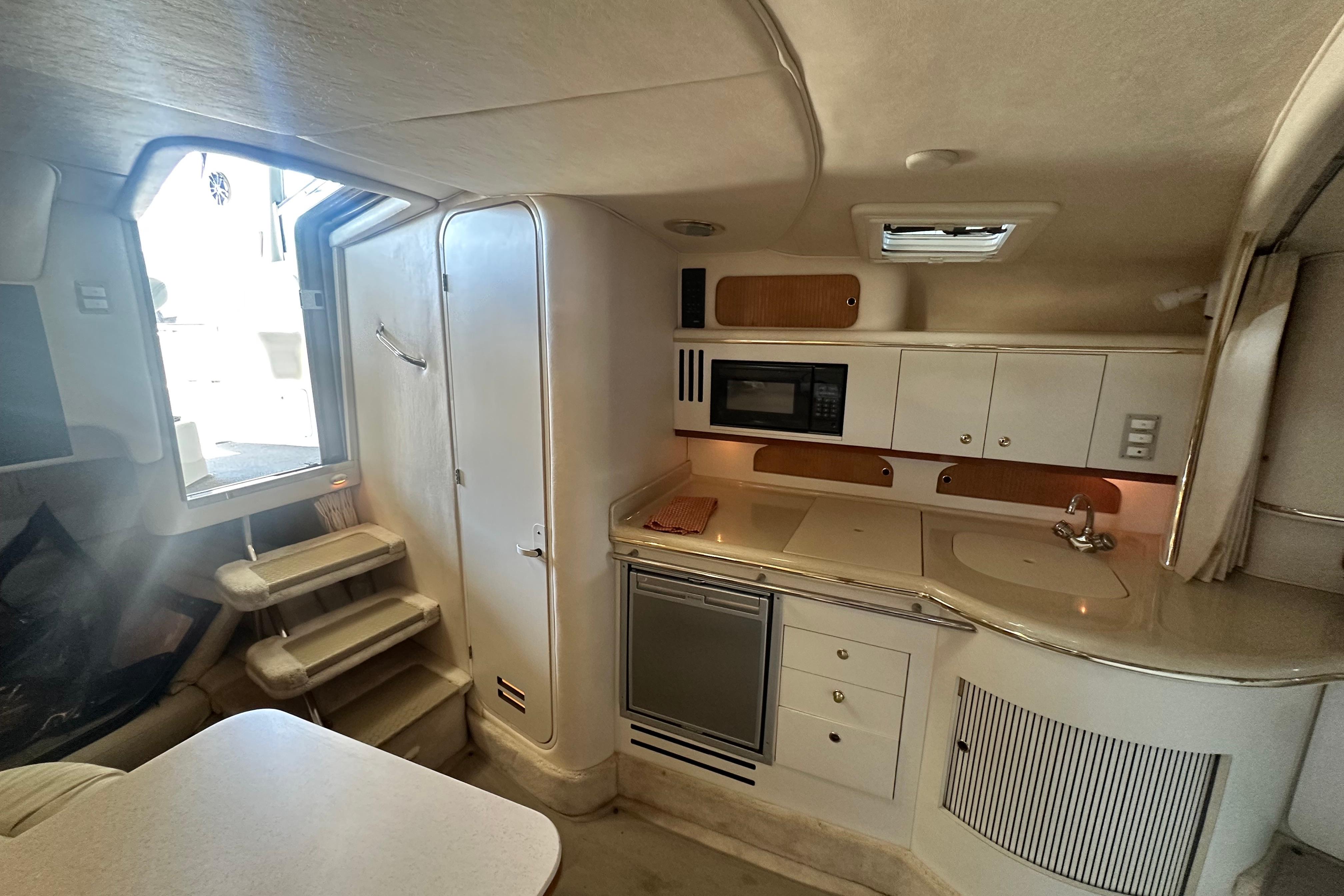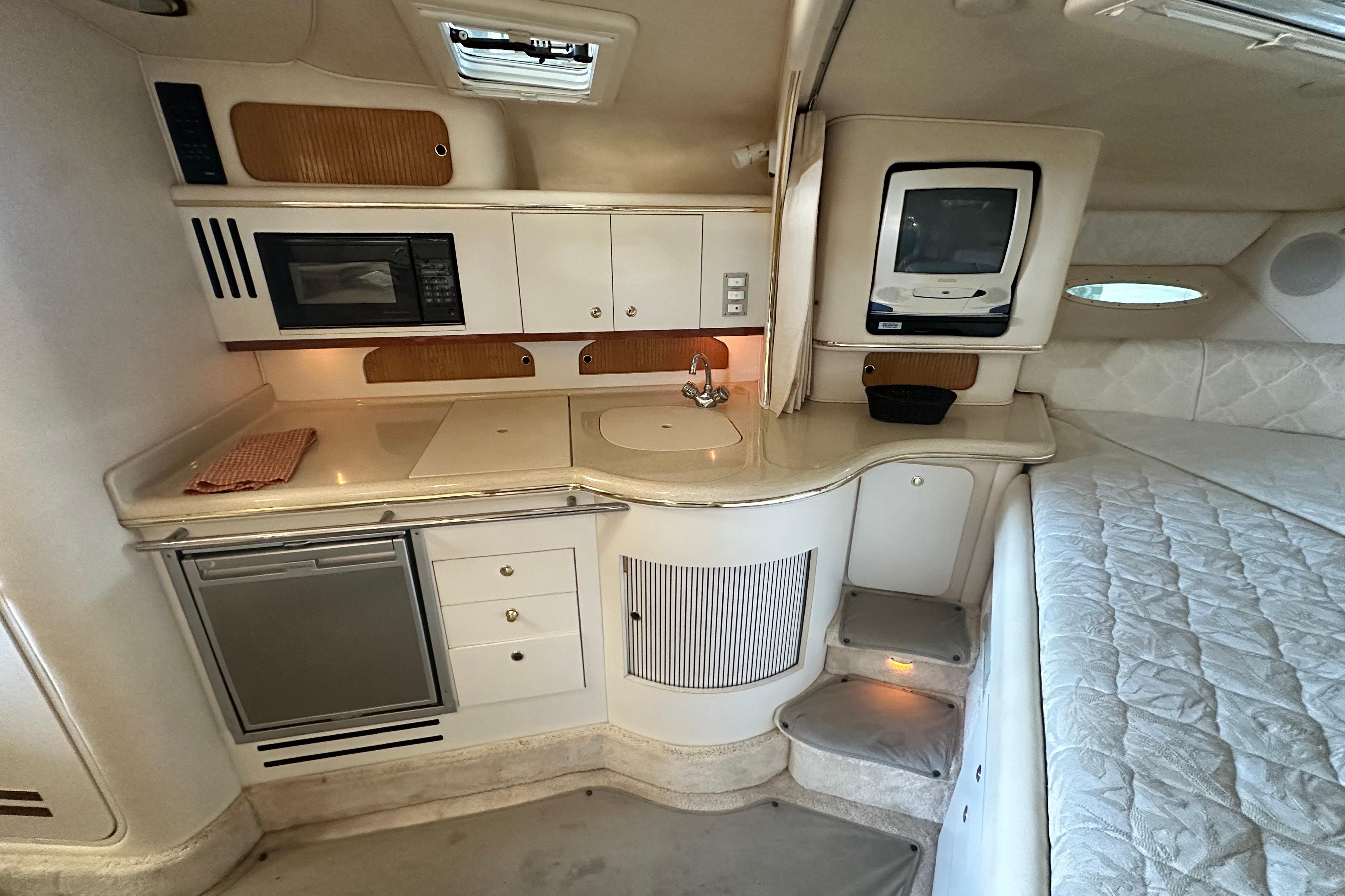 The weekends are all too short, so to help pack in all the recreation and relaxation anyone can handle, there’s the Sea Ray 310 Sundancer – the sport cruiser with all the features, fun, and fuel capacity needed to get away from it all. At the helm, digital depth finder with transducer, compass, power steering, power tilt and trim; a standard VHF radio; and custom Sea Ray backlit instrumentation with a concealed circuit breaker panel. Of course, with twin 350 horsepower Mercruiser 350 MAG MPI with V drive, the 310 Sundancer has more power than ever. With a walk-through transom, extended swim platform, and a cockpit with everything from a wet bar and cooler to a stylish forward-facing fiberglass sport spoiler for easy entry at the dock, the 310 Sundancer is engineered for good times. A custom adjustable helm seat, a companion bench seat with aft-facing bench seat, plus a full aft bench seat all make sure there’s plenty of room for everyone. A standard aft cockpit table with sunpad filler cushions and an optional forward deck with stainless steel deck runners provide ample room for sunbathing. And, as always, Sea Ray provides an enormous amount of storage space in the cockpit side panels and below the companion seat. With the fender storage in the aft wall there’s also concealed water and dockside power hookups, self-bailing fiberglass cockpit, snap-in carpet liner and freshwater washdown with hot and cold cockpit shower. Below deck, the cabin of the 310 Sundancer reflects the same attention to detail Sea Ray puts into all its vessels, including tasteful granite color schemes in Sandstone, carpet runners, and floor and gunwale cabinet storage. In the salon area, there’s a convertible dinette with mirrored accents opposite the galley. The forward raised V-berth offers plenty of sleeping and storage space with a hanging locker, gunwale shelf, and a portside storage cabinet, shelf and flip-out drawer. The mid-stateroom serves as a salon area, then at nightfall, slide the privacy curtain closed and it sleeps two in a convertible double bunk with sliding base and filler cushion storage. And guests can put away all their personal articles in a convenient hanging locker with vanity top. The standup head area is fully enclosed and features a shower, sink, and VacuFlush toilet. Of course, even the most die-hard traveler would be lost without a full-service galley, including a space-saving recessed two-burner electric stove, recessed sink, microwave, and refrigerator just to make sure the comforts of home are never left too far behind.
