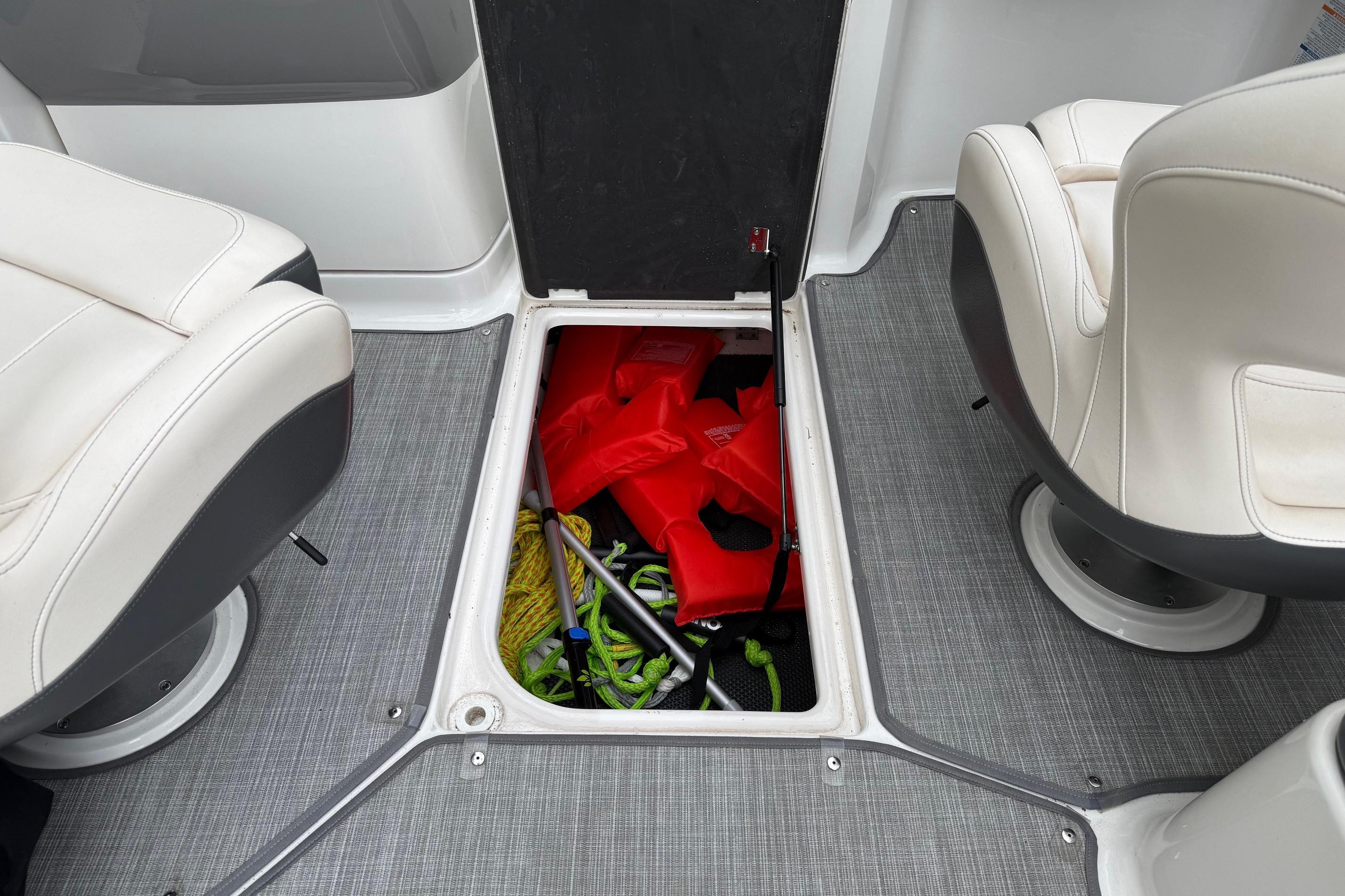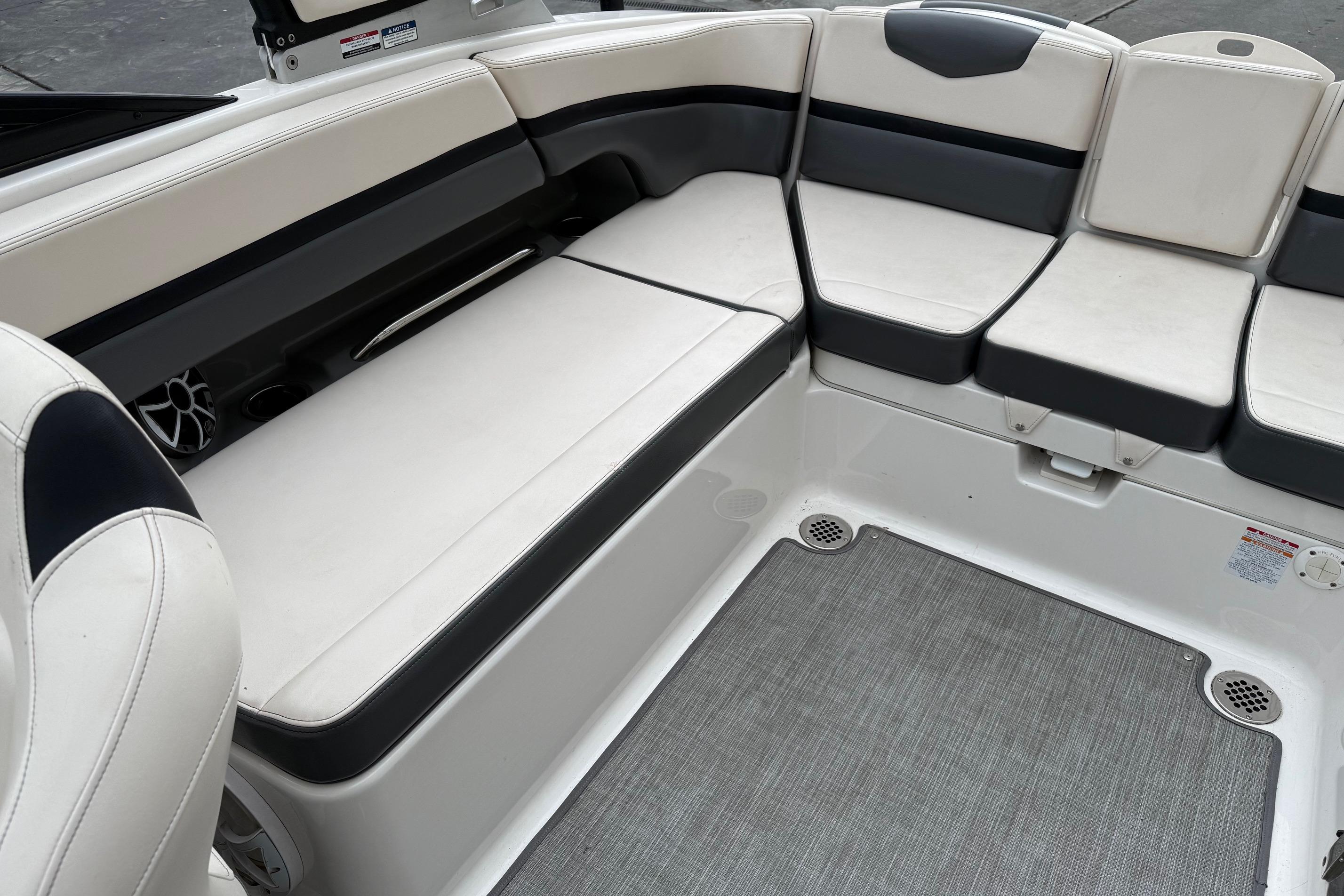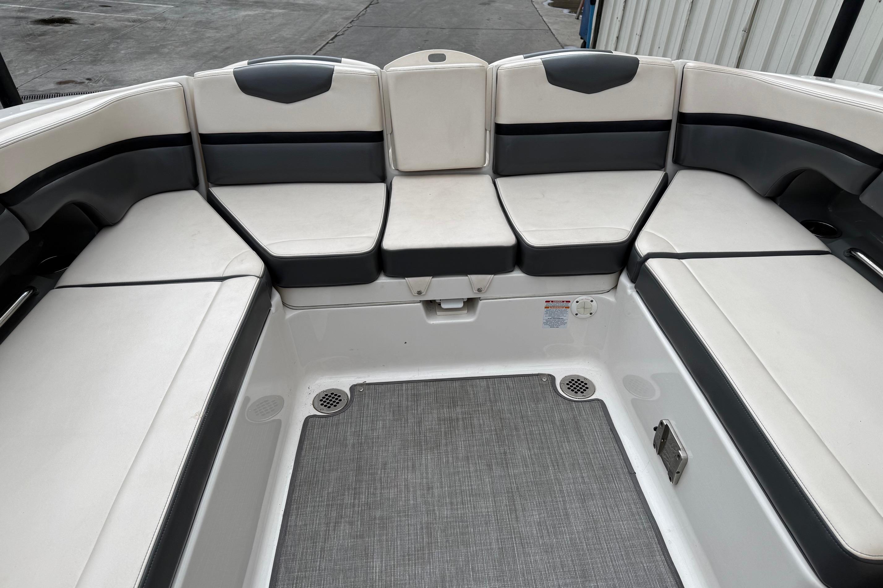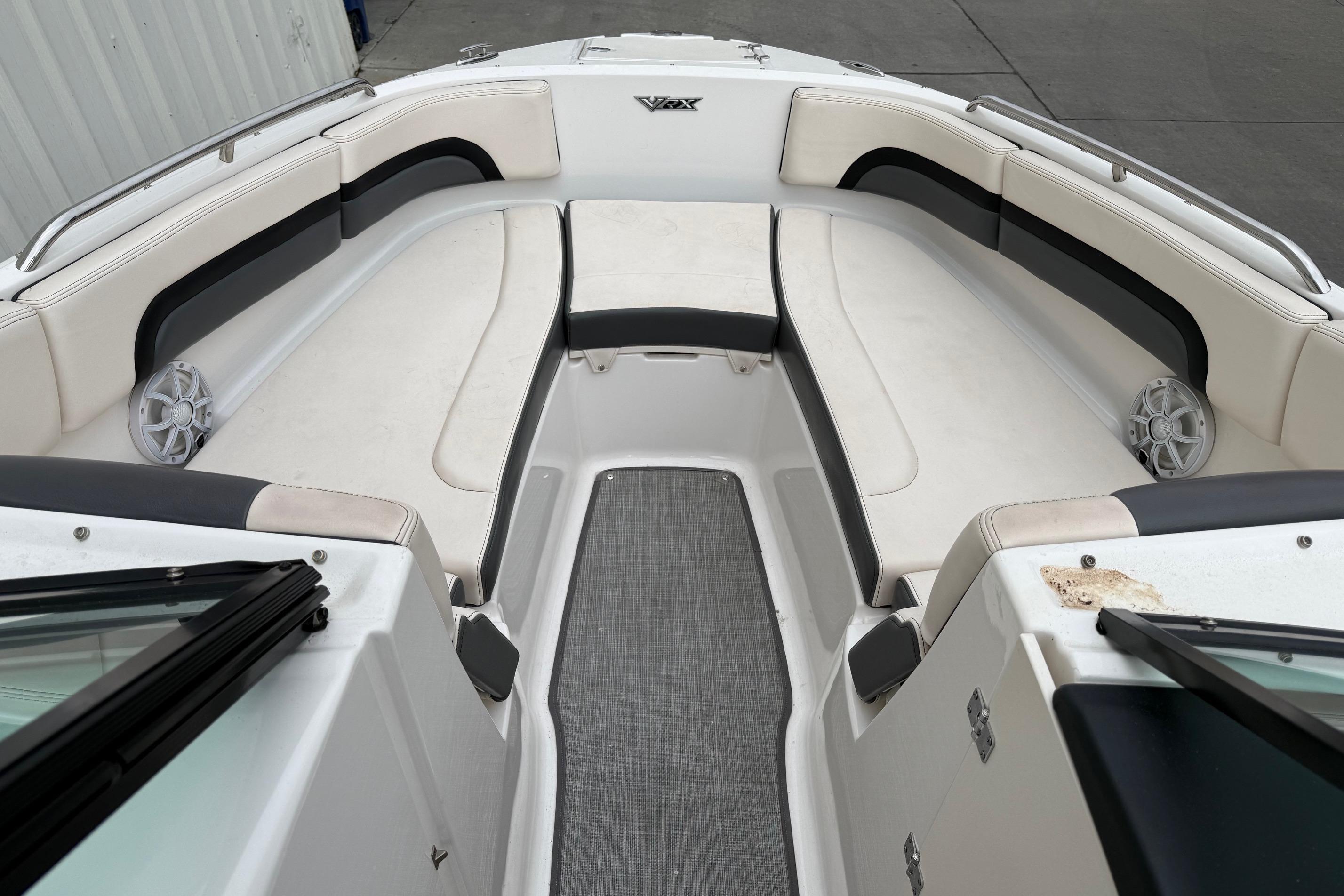The bow of the 2430 VRX is large and inviting. Wrap around bolsters compliment the tri-tone upholstery nicely. The forward cushion removes revealing a non skid surface making it easy to reboard from a beach outing. Stainless steel drink holders and oversized grab rails are stylish and functional. The bow seating also features flip-up armrests for added comfort. Underneath a custom fiberglass hatch forward is an anchor locker and a telescopic boarding ladder. The navigation light recesses into the deck when not in use eliminating a possible trip hazard.
