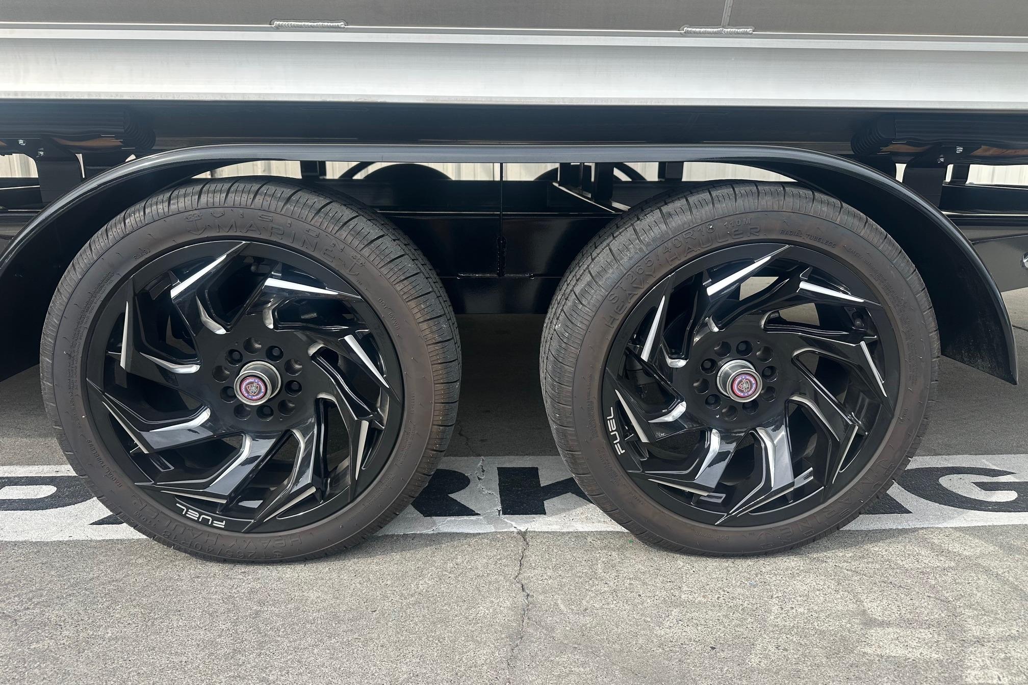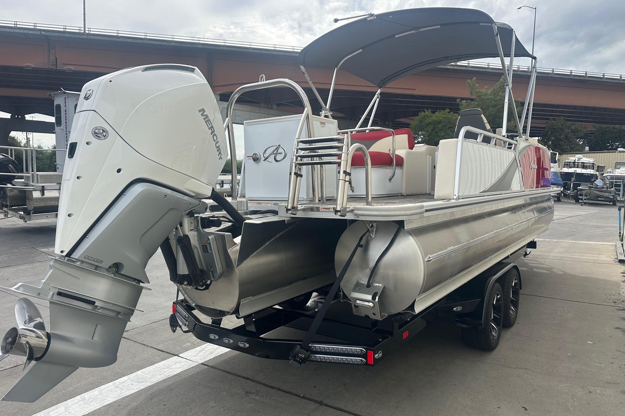 - INCLUDES custom trailer with disc brakes on both axles, rear transom straps, front boarding ladder, upgraded wheels with spare
