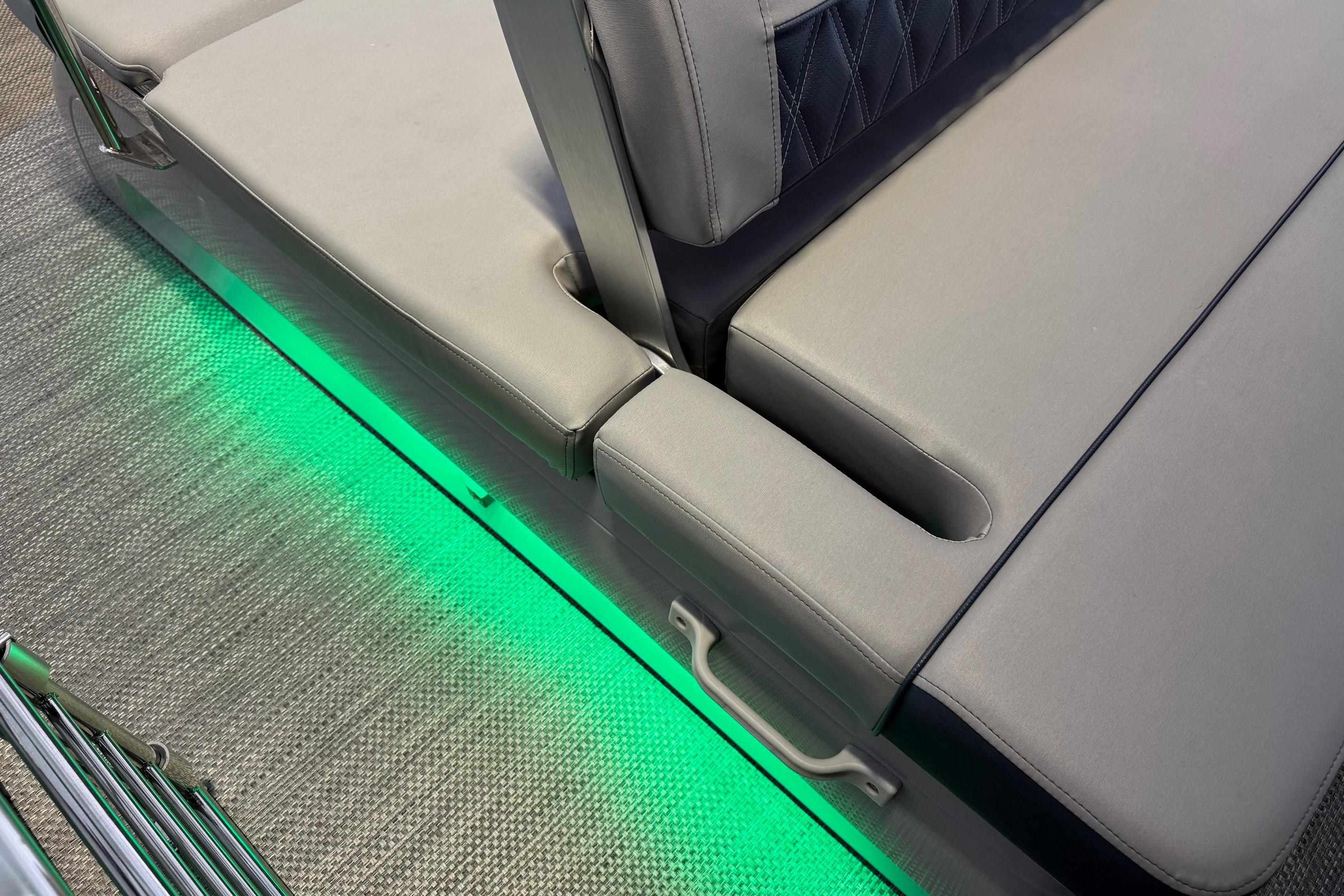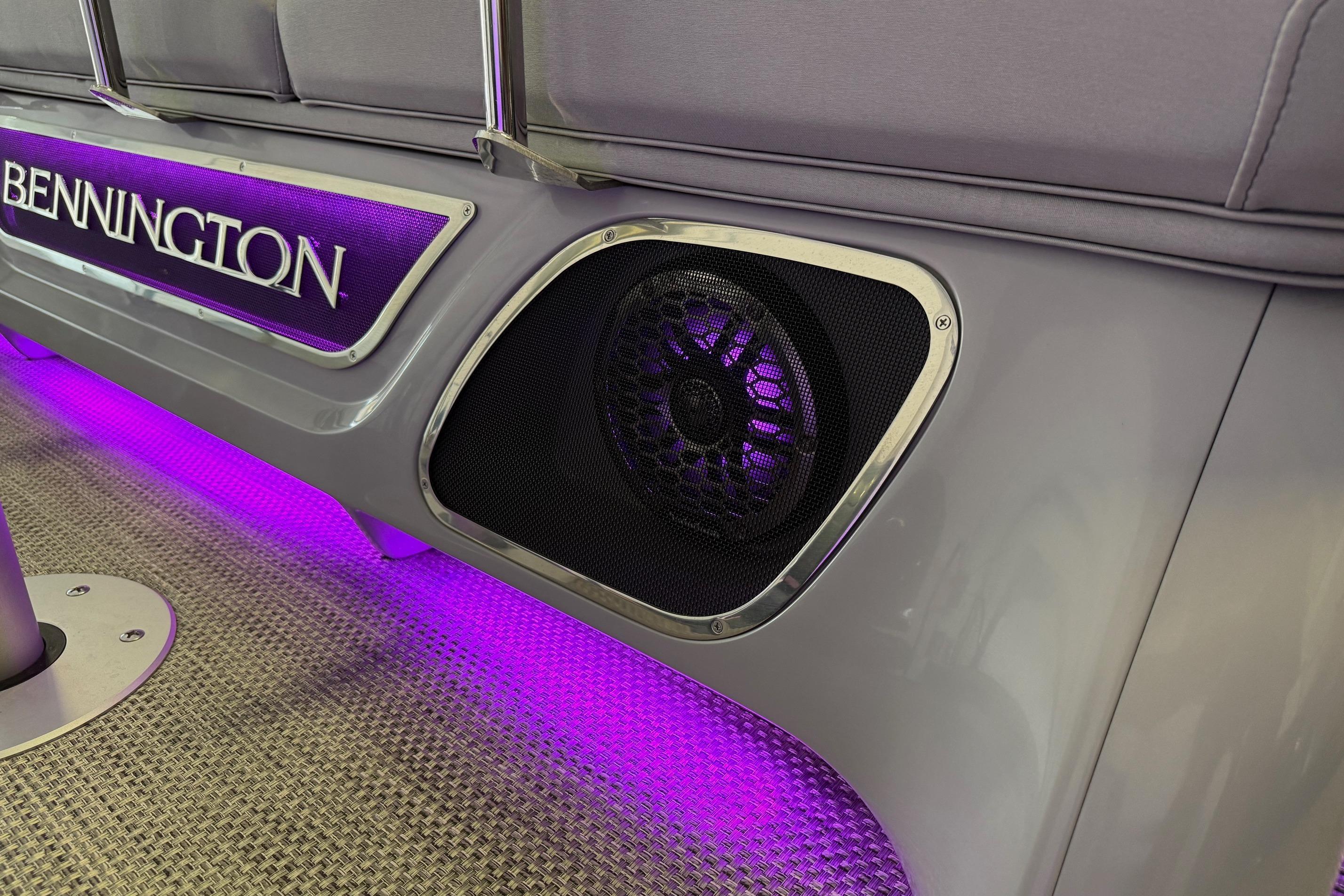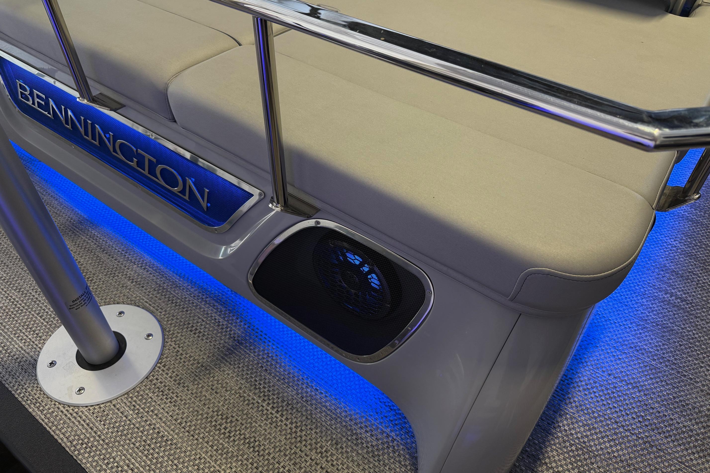 Step aboard the Bennington 23 RSB ESP and discover a world of luxury and innovation. The Rockford Fosgate Sub & Amp Upgrade transforms your onboard audio experience, delivering rich, immersive sound that sets the perfect mood for any occasion. The RGB Toe Kick Lighting and underwater lighting add a vibrant, customizable ambiance, making evening cruises and sunset gatherings truly magical. The Colored Embroidery Package and Zebrawood Matte Slate accents elevate the interior aesthetics, creating a refined and inviting atmosphere. Every detail, from the plush seating to the stylish finishes, reflects Bennington’s dedication to comfort and elegance.