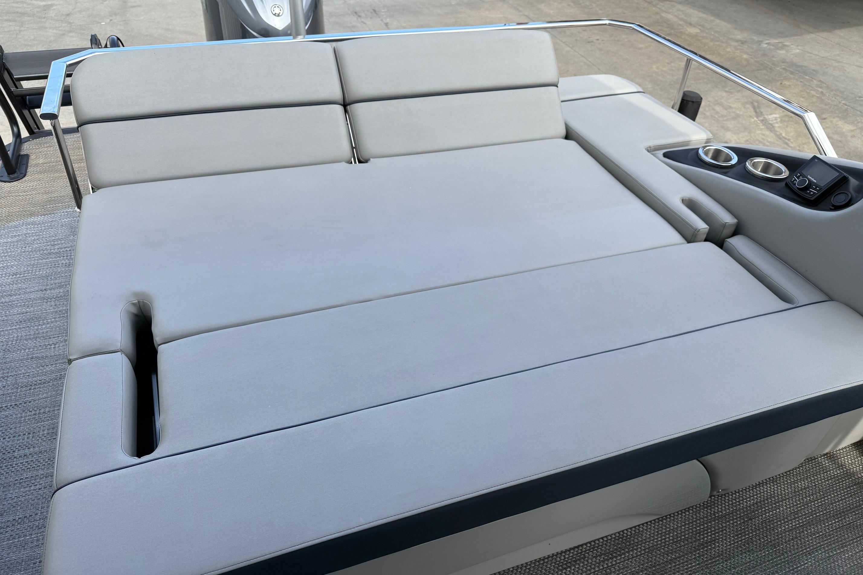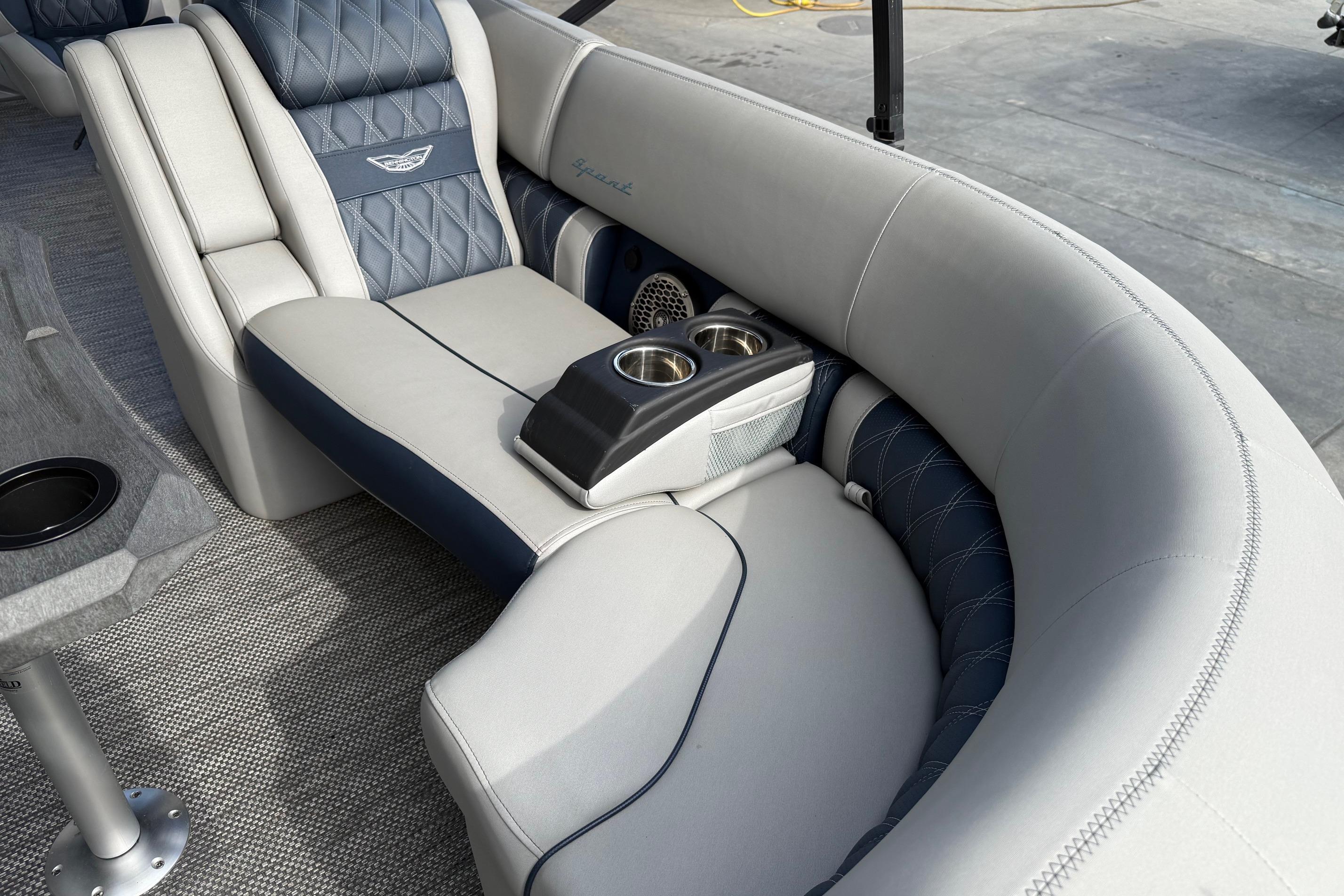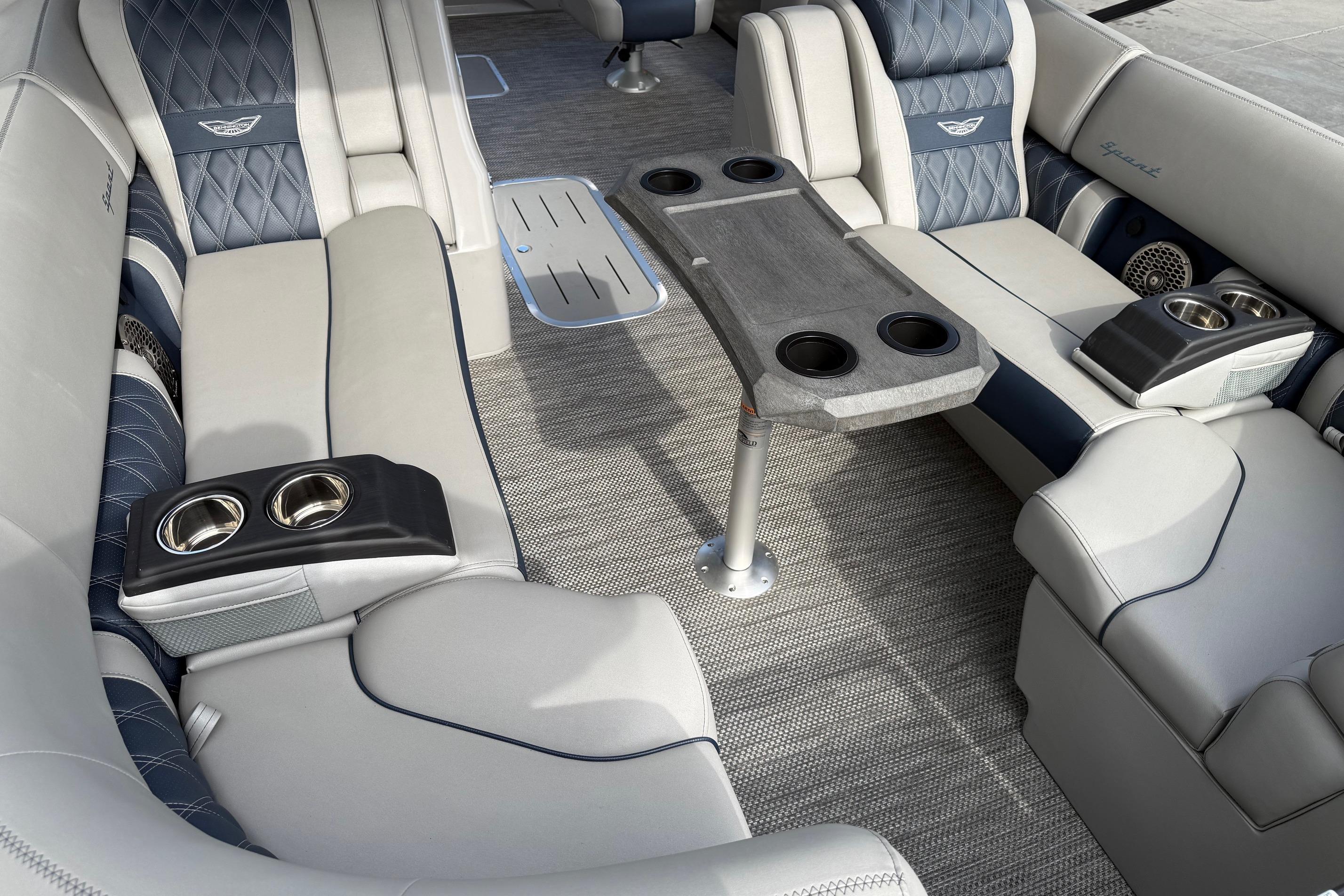 Step aboard the Bennington 23 RSB ESP and discover a world of luxury and innovation. The Rockford Fosgate Sub & Amp Upgrade transforms your onboard audio experience, delivering rich, immersive sound that sets the perfect mood for any occasion. The RGB Toe Kick Lighting and underwater lighting add a vibrant, customizable ambiance, making evening cruises and sunset gatherings truly magical. The Colored Embroidery Package and Zebrawood Matte Slate accents elevate the interior aesthetics, creating a refined and inviting atmosphere. Every detail, from the plush seating to the stylish finishes, reflects Bennington’s dedication to comfort and elegance.